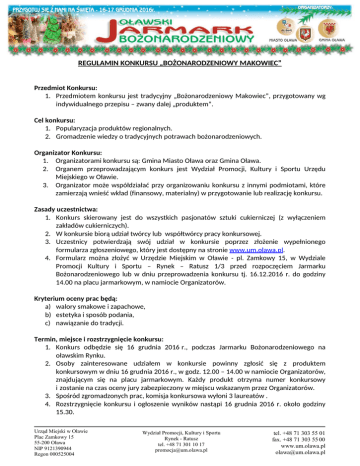 REGULAMIN KONKURSU „BOŻONARODZENIOWY MAKOWIEC” Przedmiot Konkursu: 1. Przedmiotem konkursu jest tradycyjny „Bożonarodzeniowy Makowiec”, przygotowany wg indywidualnego przepisu – zwany dalej „produktem”. Cel konkursu: 1. Popularyzacja produktów regionalnych. 2. Gromadzenie wiedzy o tradycyjnych potrawach bożonarodzeniowych. Organizator Konkursu: 1. Organizatorami konkursu są: Gmina Miasto Oława oraz Gmina Oława. 2. Organem przeprowadzającym konkurs jest Wydział Promocji, Kultury i Sportu Urzędu Miejskiego w Oławie. 3. Organizator może współdziałać przy organizowaniu konkursu z innymi podmiotami, które zamierzają wnieść wkład (finansowy, materialny) w przygotowanie lub realizację konkursu. Zasady uczestnictwa: 1. Konkurs skierowany jest do wszystkich pasjonatów sztuki cukierniczej (z wyłączeniem zakładów cukierniczych). 2. W konkursie biorą udział twórcy lub współtwórcy pracy konkursowej. 3. Uczestnicy potwierdzają swój udział w konkursie poprzez złożenie wypełnionego formularza zgłoszeniowego, który jest dostępny na stronie www.um.olawa.pl. 4. Formularz można złożyć w Urzędzie Miejskim w Oławie - pl. Zamkowy 15, w Wydziale Promocji Kultury i Sportu – Rynek – Ratusz 1/3 przed rozpoczęciem Jarmarku Bożonarodzeniowego lub w dniu przeprowadzenia konkursu tj. 16.12.2016 r. do godziny 14.00 na placu jarmarkowym, w namiocie Organizatorów. Kryterium oceny prac będą: a) walory smakowe i zapachowe, b) estetyka i sposób podania, c) nawiązanie do tradycji. Termin, miejsce i rozstrzygnięcie konkursu: 1. Konkurs odbędzie się 16 grudnia 2016 r., podczas Jarmarku Bożonarodzeniowego na oławskim Rynku. 2. Osoby zainteresowane udziałem w konkursie powinny zgłosić się z produktem konkursowym w dniu 16 grudnia 2016 r., w godz. 12.00 – 14.00 w namiocie Organizatorów, znajdującym się na placu jarmarkowym. Każdy produkt otrzyma numer konkursowy i zostanie na czas oceny jury zabezpieczony w miejscu wskazanym przez Organizatorów. 3. Spośród zgromadzonych prac, komisja konkursowa wyłoni 3 laureatów . 4. Rozstrzygnięcie konkursu i ogłoszenie wyników nastąpi 16 grudnia 2016 r. około godziny 15.30. Urząd Miejski w Oławie Plac Zamkowy 15 55-200 Oława NIP 9121390944 Regon 000525004 Wydział Promocji, Kultury i Sportu Rynek - Ratusz tel. +48 71 301 10 17 [email protected] tel. +48 71 303 55 01 fax. +48 71 303 55 00 www.um.olawa.pl [email protected] Nagrody: 1. a. b. c. Laureaci konkursu otrzymają nagrody finansowe w wysokości: I miejsce – 500 zł II miejsce – 300 zł III miejsce – 200 zł 2. Nagroda zostanie przekazana laureatom w dniu rozstrzygnięcia konkursu, w formie gotówki. Do odbioru nagrody upoważniony jest tylko i wyłącznie twórca/współtwórca pracy konkursowej, wskazany w karcie zgłoszenia do konkursu. W szczególnych przypadkach, sposób przekazania nagrody może zostać ustalony indywidualnie, pomiędzy Organizatorami, a laureatami konkursu. Postanowienia końcowe : 1. Wszelkich informacji dotyczących konkursu udzielają pracownicy Wydziału Promocji, Kultury i Sportu Urzędu Miejskiego w Oławie, pod nr telefonu 71 301 10 16 - 18. 2. Przystąpienie do konkursu jest równoznaczne z akceptacją niniejszego regulaminu. 3. Uczestnik wyraża zgodę na przetwarzanie danych osobowych na potrzeby przeprowadzenia konkursu. W przypadku wygranej, wyraża zgodę na opublikowanie swojego wizerunku oraz swoich danych osobowych na stronach internetowych Organizatorów. Zgoda, o której mowa w zdaniu poprzednim nie jest ograniczona czasowo i dotyczy wszelkich publikacji medialnych, w których Organizatorzy opisują przebieg konkursu, o którym mowa w niniejszym regulaminie. 4. Do konkursu nie dopuszcza się prac: a. naruszających godność ludzką; b. zawierających elementy dyskryminujące ze względu na rasę, płeć, orientację seksualną oraz narodowość; c. raniących przekonania religijne lub polityczne; d. zagrażające fizycznemu, psychicznemu lub moralnemu rozwojowi małoletnich; e. sprzyjających zachowaniom zagrażającym zdrowiu, bezpieczeństwu lub ochronie środowiska. 5. Wszelkie kwestie nieokreślone w regulaminie rozstrzygają Organizatorzy. 6. Organizatorzy konkursu nie ponoszą odpowiedzialności za odwołanie bądź zmiany regulaminu konkursu, powstałe z przyczyn niezależnych od nich. 7. Organizatorzy zastrzegają sobie prawo zmiany regulaminu pod warunkiem, że taka zmiana nie naruszy praw nabytych uczestników konkursu. O wszelkich zmianach Organizatorzy będą informować na swoich stronach internetowych, tj.: • Urząd Miejski w Oławie – www.um.olawa.pl, FB Miasto Oława • Urząd Gminy Oława - www.gminaolawa.pl, FB Gmina Oława Urząd Miejski w Oławie Plac Zamkowy 15 55-200 Oława NIP 9121390944 Regon 000525004 Wydział Promocji, Kultury i Sportu Rynek - Ratusz tel. +48 71 301 10 17 [email protected] tel. +48 71 303 55 01 fax. +48 71 303 55 00 www.um.olawa.pl [email protected]