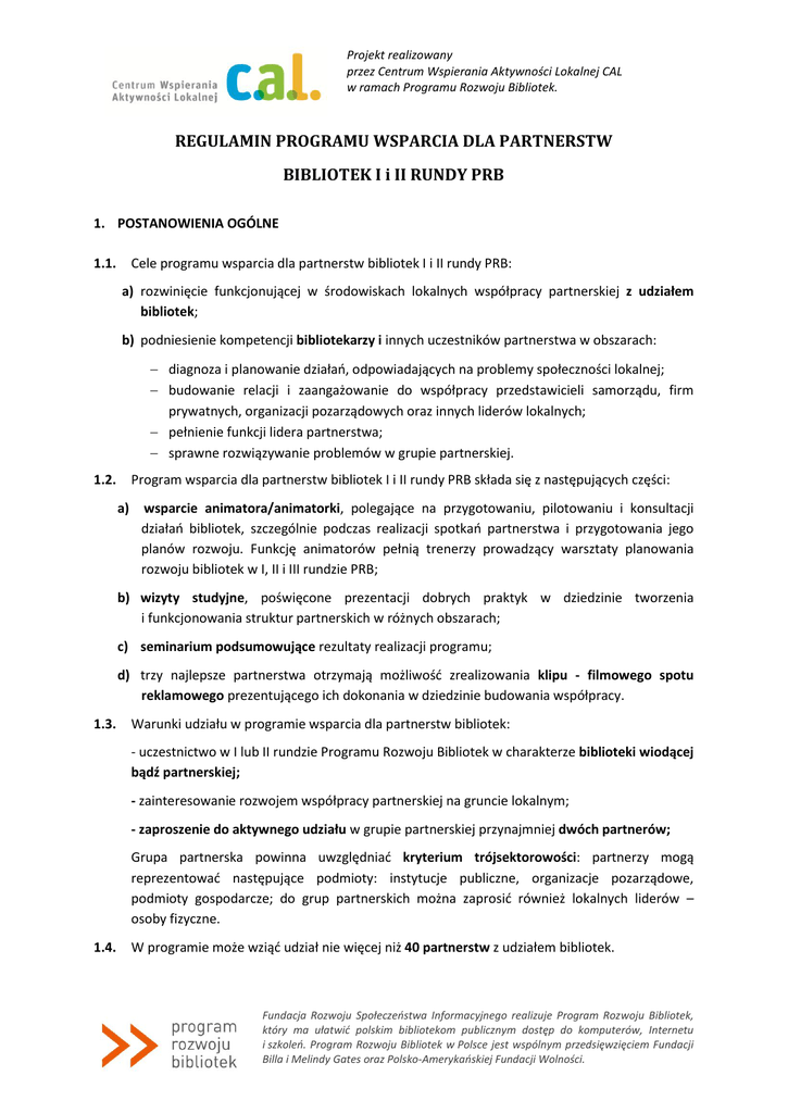 Projekt realizowany przez Centrum Wspierania Aktywności Lokalnej CAL w ramach Programu Rozwoju Bibliotek. REGULAMIN PROGRAMU WSPARCIA DLA PARTNERSTW BIBLIOTEK I i II RUNDY PRB 1. POSTANOWIENIA OGÓLNE 1.1. Cele programu wsparcia dla partnerstw bibliotek I i II rundy PRB: a) rozwinięcie funkcjonującej w środowiskach lokalnych współpracy partnerskiej z udziałem bibliotek; b) podniesienie kompetencji bibliotekarzy i innych uczestników partnerstwa w obszarach: diagnoza i planowanie działań, odpowiadających na problemy społeczności lokalnej; budowanie relacji i zaangażowanie do współpracy przedstawicieli samorządu, firm prywatnych, organizacji pozarządowych oraz innych liderów lokalnych; pełnienie funkcji lidera partnerstwa; sprawne rozwiązywanie problemów w grupie partnerskiej. 1.2. Program wsparcia dla partnerstw bibliotek I i II rundy PRB składa się z następujących części: a) wsparcie animatora/animatorki, polegające na przygotowaniu, pilotowaniu i konsultacji działań bibliotek, szczególnie podczas realizacji spotkań partnerstwa i przygotowania jego planów rozwoju. Funkcję animatorów pełnią trenerzy prowadzący warsztaty planowania rozwoju bibliotek w I, II i III rundzie PRB; b) wizyty studyjne, poświęcone prezentacji dobrych praktyk w dziedzinie tworzenia i funkcjonowania struktur partnerskich w różnych obszarach; c) seminarium podsumowujące rezultaty realizacji programu; d) trzy najlepsze partnerstwa otrzymają możliwość zrealizowania klipu - filmowego spotu reklamowego prezentującego ich dokonania w dziedzinie budowania współpracy. 1.3. Warunki udziału w programie wsparcia dla partnerstw bibliotek: - uczestnictwo w I lub II rundzie Programu Rozwoju Bibliotek w charakterze biblioteki wiodącej bądź partnerskiej; - zainteresowanie rozwojem współpracy partnerskiej na gruncie lokalnym; - zaproszenie do aktywnego udziału w grupie partnerskiej przynajmniej dwóch partnerów; Grupa partnerska powinna uwzględniać kryterium trójsektorowości: partnerzy mogą reprezentować następujące podmioty: instytucje publiczne, organizacje pozarządowe, podmioty gospodarcze; do grup partnerskich można zaprosić również lokalnych liderów – osoby fizyczne. 1.4. W programie może wziąć udział nie więcej niż 40 partnerstw z udziałem bibliotek. Fundacja Rozwoju Społeczeństwa Informacyjnego realizuje Program Rozwoju Bibliotek, który ma ułatwić polskim bibliotekom publicznym dostęp do komputerów, Internetu i szkoleń. Program Rozwoju Bibliotek w Polsce jest wspólnym przedsięwzięciem Fundacji Billa i Melindy Gates oraz Polsko-Amerykańskiej Fundacji Wolności. Projekt realizowany przez Centrum Wspierania Aktywności Lokalnej CAL w ramach Programu Rozwoju Bibliotek. 1.5. Biblioteka, w programie wsparcia dla partnerstw bibliotek I i II rundy, dba o właściwe informowanie społeczności lokalnej, władz lokalnych i innych, istotnych dla realizacji podejmowanych działań osób. 1.6. Udział w programie jest bezpłatny. 2. POSTANOWIENIA SZCZEGÓŁOWE REKRUTACJA BIBLIOTEK 2.1. Do udziału w programie uprawnione są biblioteki wiodące i partnerskie, uczestniczące w I i II rundzie Programu Rozwoju Bibliotek. 2.2. Zasady zgłoszenia do Programu: A) Etap I: realizacja przez bibliotekę scenariusza spotkania, który jest załącznikiem nr 1 do Regulaminu. B) Etap II: przygotowanie krótkiego raportu z przeprowadzonego na podstawie scenariusza spotkania, opisującego: dotychczasowe doświadczenia grupy partnerskiej, pomysł na jej dalszy rozwój i działania, perspektywy i potencjał planowanej współpracy. 2.3. Wzór raportu zostanie opublikowany na stronie biblioteki.org do 27 lutego 2014 r. 2.4. Organizacja spotkania oraz złożenie raportu z jego realizacji możliwe jest do dnia 26 marca 2014 r. 2.5. Wyboru bibliotek zakwalifikowanych do programu wsparcia dla partnerstw dokona komisja na podstawie analizy wypełnionych raportów. Biblioteki, które zakwalifikują się do programu, zostaną o tym poinformowane przez FRSI lub CAL najpóźniej do dnia 28 marca 2014 roku. Ponadto wyniki zostaną opublikowane na stronie internetowej Programu: www.biblioteki.org. WSPARCIE ANIMATORA 2.8. Współpraca animatora z biblioteką dotyczyć będzie w szczególności: - analizy dotychczasowych doświadczeń biblioteki w inicjowaniu współpracy w lokalnym środowisku oraz projektów partnerskich, - nawiązywaniu relacji z przedstawicielami lokalnych instytucji, - rozwoju umiejętności, niezbędnych w prawidłowym funkcjonowaniu partnerstwa. 2.9. Współpraca animatora/animatorki z partnerstwami trwa przez cały okres realizacji programu, od momentu zakończenia procesu rekrutacji, tj. opublikowania listy uczestniczących w nim partnerstw do 31 października 2014 r., i koncentrować się będzie na następujących obszarach/zadaniach: Fundacja Rozwoju Społeczeństwa Informacyjnego realizuje Program Rozwoju Bibliotek, który ma ułatwić polskim bibliotekom publicznym dostęp do komputerów, Internetu i szkoleń. Program Rozwoju Bibliotek w Polsce jest wspólnym przedsięwzięciem Fundacji Billa i Melindy Gates oraz Polsko-Amerykańskiej Fundacji Wolności. Projekt realizowany przez Centrum Wspierania Aktywności Lokalnej CAL w ramach Programu Rozwoju Bibliotek. a) wsparciu biblioteki w rozwoju partnerstwa, pomocy w zdefiniowaniu przedmiotu i obszarów rozwoju oraz doborze partnerów, którzy mogliby włączyć się w jego działania; b) udziale animatora/animatorki w dwóch spotkaniach partnerstwa, których termin realizacji i harmonogram zostanie ustalony w porozumieniu z biblioteką; c) pomocy w podsumowaniu przebiegu obu spotkań, wsparciu w zakresie zaplanowania dalszych działań służących rozwijaniu współpracy partnerskiej w społeczności; d) pomocy w przygotowaniu planu rozwoju współpracy partnerskiej, który jest dokumentem dotyczącym koncepcji współpracy wypracowanej podczas spotkań partnerskich. 2.10. Animator/animatorka jest zob