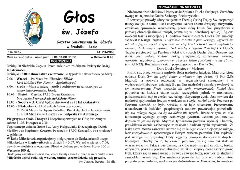 Głos ROZWAŻANIE NA NIEDZIELĘ św. Józefa Gazetka Sanktuarium św. Józefa w Prudniku – Lesie 5.06.2016 r. Msze św. niedzielne u nas o godz.: 8.00 10.00 11.30 OGŁOSZENIA Nr 23/2016 W Dębowcu: 8.45 Dzisiaj 10 Niedziela Zwykła. Przed kościołem zbiórka na Świątynię Bożej Opatrzności. Dzisiaj o 15.00 nabożeństwo czerwcowe, w tygodniu nabożeństwo po Mszy. 7.06. - Wtorek – Po Mszy św. Wieczór z Biblią: Król Królów i Pan Panów – Apokalipsy cd. 8.06. - Środa – Msza w intencji próśb i podziękowań zanoszonych za wstawiennictwem św. Józefa. 10.06. - Piątek – O godz. 17.30 Droga Krzyżowa. Nie będzie Franciszkańskiej Szkoły Wiary. 11.06. - Sobota – O. Cyryl będzie dziękował za 25 lat kapłaństwa. 12.06. - Niedziela – O 15.00 nabożeństwo czerwcowe. O 16.00 Msza z ks. bpem Rudolfem Pierskałą dla Ruchu Oazowego. O 17.00 Msza św. w Lipach z racji odpustu św. Antoniego. Pielgrzymka Osób Chorych i Niepełnosprawnych na Górę św. Anny w sobotę 11.06. Początek o 9.30. Tego samego dnia na Górze Św. Anny Pielgrzymka Diecezjalnego Dzieła Modlitwy za Kapłanów Oremus. Początek o 17.00. Szczegóły obu wydarzeń w gablotce. W Roku Miłosierdzia organizujemy pielgrzymkę do Sanktuarium Bożego Miłosierdzia w Łagiewnikach w dniach 1 – 3.07. Wyjazd w piątek o 7.00, powrót w niedzielę wieczorem. Ulotki wyłożone pod chórem. Koszt 300 zł. Wpisowe 100 zł. Dziękujemy wszystkim za modlitwę, ofiary, kwiaty i wszelkie prace na rzecz Sanktuarium. Miłość do dzieci rodzi się w sercu, zanim jeszcze dziecko się pocznie. św. Joanna Beretta - Molla Niedawno obchodziliśmy Uroczystość Zesłania Ducha Świętego. Zwróćmy uwagę na tajemnice Ducha Świętego Pocieszyciela. Rozważając prawdy wiary związane z Trzecią Osobą Trójcy Św. rozpatrzyć należy dwojakie skutki: dar i charyzmat. Darem Ducha Świętego nazywamy chwilową sprawność wewnętrzną, przez którą Duch Św. przychodzi z pomocą chrześcijaninowi, znajdującemu się w określonej sytuacji. Są one owocem łaski uświęcającej. U podstaw nauki o darach Ducha Św. znajduje się tekst z Księgi Izajasza: I wyrośnie różdżka z pnia Jessego, wypuści się odrośl z jego korzeni. I spocznie na niej Duch Pański, duch mądrości i rozumu, duch rady i męstwa, duch wiedzy i bojaźni Pańskiej (Iz 11,1-2). Trzeba przytoczyć też Pawłowy tekst o owocach Ducha Św.: Owocem zaś ducha jest: miłość, radość, pokój, cierpliwość, uprzejmość, dobroć, wierność, łagodność, opanowanie. Przeciw takim [cnotom] nie ma Prawa (Ga 5,22-23). Rozpatrzmy zatem poszczególne dary Ducha Św. Dary Ducha Świętego – Mądrość Pismo św. przeciwstawia mądrość Bożą mądrości ludzkiej. Mądrości którą obdarza Duch Św. nie pojął żaden z władców tego świata (1 Kor 2,8). Mądrość ta pozwala rozpoznać w rzeczywistości stworzonej i w wydarzeniach zbawcze działanie Boga. Dar mądrości pozwala powtórzyć za św. Augustynem: Przez wszystko do mnie przemawiałeś, Panie! Jest potrzebna na każdym etapie życia, szczególnie jednak w momentach podsumowania: czy to części, czy całego aktywnego życia. Jest bowiem dar mądrości spojrzeniem Bożym wzrokiem na swoje i czyjeś życie. Pozwala po Bożemu określić, co było porażką a co było sukcesem. Przeczuwamy nieadekwatność ludzkich, pospiesznych osądów, powtarzając porzekadło: nie ma takiego złego, co by na dobre nie wyszło. Rzecz w tym, że taka konstatacja wymaga sporego czasowego dystansu. Czasem jest możliwa dopiero w jesieni życia. Mądrość tymczasem pozwala szybciej i bardziej prawidłowo ocenić zachodzące w naszym i cudzym życiu wydarzenia. Za łaską Bożą można zawczasu ustrzec się żałosnego końca niejednego miłego, lecz zdecydowanie sprzecznego z Bożym prawem początku. Dar mądrości jest szczególnie przydatny, kiedy sięgamy pamięcią do spraw trudnych i bolesnych. Choćby po to, by czasem przyznać, że się nam coś stało na własne życzenie. Takie stwierdzenie, na które nigdy nie jest za późno, bardzo oczyszcza, pozwala przestać obwiniać za jakieś kłopoty coraz szersze grono tych, którzy się na mnie uwzięli. Prawda zawsze leczy, również ze złudzeń i samookłamywania się. Dar mądrości pozwala też dostrzec dobro, które przyszło przez bolesne, upokarzające doświadczenie. Nieważne, że zmądrzał człowiek po szkodzie. Ważne, że zmądrzał, daj Boże, trwale. Mocą daru mądrości może człowiek uczynić swoją modlitwę Psalmisty: Dobrze to dla mnie że mnie poniżyłeś bym się nauczył Twych ustaw. (Ps 11,9,71). Modlitwą tą Psalmista dziękuje Bogu, że mu ukazał to, co może go zniszczyć. Dar mądrości pozwala prawidłowo ocenić, co jest naprawdę istotne, a co jest znaczenia pozbawione. Poszerza perspektywę patrzenia także na bieżące wydarzenia. Wymownym świadectwem takiego działania daru mądrości jest pochodzące ze starożytności chrześcijańskiej (III w.) zakończenie Akt prokonsularnych męczeństwa św. Cypriana, który uwielbił Chrystusa męczeństwem w 258 r: Święty męczennik Cyprian poniósł śmierć dnia 14 września za rządów imperatorów Waleriana i Galiena, podczas gdy w rzeczywistości panował Pan nasz, Jezus Chrystus, któremu cześć i chwała na wieki wieków. To jest dokładnie tak: prośmy o dar mądrości, abyśmy potrafili dostrzec, co się dzieje w rzeczywistości; co jest rzeczywistym zyskiem i takąż stratą; jakie miało rzeczywiste znaczenie to, co się działo w historii mojego życia. Dary Ducha Świętego – Rozum i umiejętność Obydwa dary, choć na różny sposób, umożliwiają nam, w takiej mierze, w jakiej jest to dla nas możliwe i potrzebne (!), zrozumienie tajemnic Bożych. Mocą obydwu darów możliwe jest zrozumienie tajemnicy krzyża: Nauka bowiem krzyża głupstwem jest dla tych, co idą na zatracenie, mocą Bożą zaś dla nas, którzy dostępujemy zbawienia. Napisane j