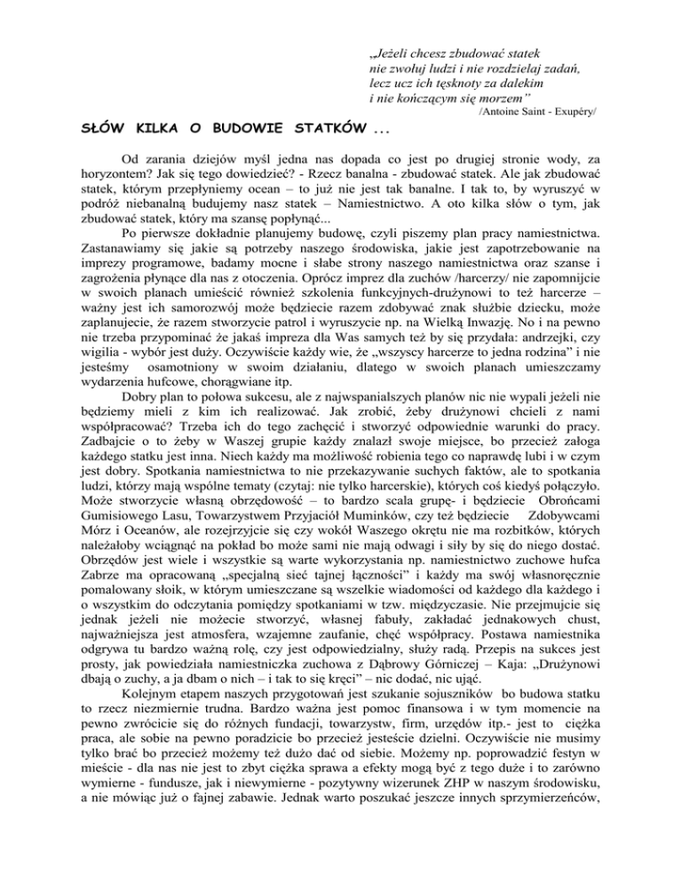 „Jeżeli chcesz zbudować statek nie zwołuj ludzi i nie rozdzielaj zadań, lecz ucz ich tęsknoty za dalekim i nie kończącym się morzem” /Antoine Saint - Exupéry/ SŁÓW KILKA O BUDOWIE STATKÓW ... Od zarania dziejów myśl jedna nas dopada co jest po drugiej stronie wody, za horyzontem? Jak się tego dowiedzieć? - Rzecz banalna - zbudować statek. Ale jak zbudować statek, którym przepłyniemy ocean – to już nie jest tak banalne. I tak to, by wyruszyć w podróż niebanalną budujemy nasz statek – Namiestnictwo. A oto kilka słów o tym, jak zbudować statek, który ma szansę popłynąć... Po pierwsze dokładnie planujemy budowę, czyli piszemy plan pracy namiestnictwa. Zastanawiamy się jakie są potrzeby naszego środowiska, jakie jest zapotrzebowanie na imprezy programowe, badamy mocne i słabe strony naszego namiestnictwa oraz szanse i zagrożenia płynące dla nas z otoczenia. Oprócz imprez dla zuchów /harcerzy/ nie zapomnijcie w swoich planach umieścić również szkolenia funkcyjnych-drużynowi to też harcerze – ważny jest ich samorozwój może będziecie razem zdobywać znak służbie dziecku, może zaplanujecie, że razem stworzycie patrol i wyruszycie np. na Wielką Inwazję. No i na pewno nie trzeba przypominać że jakaś impreza dla Was samych też by się przydała: andrzejki, czy wigilia - wybór jest duży. Oczywiście każdy wie, że „wszyscy harcerze to jedna rodzina” i nie jesteśmy osamotniony w swoim działaniu, dlatego w swoich planach umieszczamy wydarzenia hufcowe, chorągwiane itp. Dobry plan to połowa sukcesu, ale z najwspanialszych planów nic nie wypali jeżeli nie będziemy mieli z kim ich realizować. Jak zrobić, żeby drużynowi chcieli z nami współpracować? Trzeba ich do tego zachęcić i stworzyć odpowiednie warunki do pracy. Zadbajcie o to żeby w Waszej grupie każdy znalazł swoje miejsce, bo przecież załoga każdego statku jest inna. Niech każdy ma możliwość robienia tego co naprawdę lubi i w czym jest dobry. Spotkania namiestnictwa to nie przekazywanie suchych faktów, ale to spotkania ludzi, którzy mają wspólne tematy (czytaj: nie tylko harcerskie), których coś kiedyś połączyło. Może stworzycie własną obrzędowość – to bardzo scala grupę- i będziecie Obrońcami Gumisiowego Lasu, Towarzystwem Przyjaciół Muminków, czy też będziecie Zdobywcami Mórz i Oceanów, ale rozejrzyjcie się czy wokół Waszego okrętu nie ma rozbitków, których należałoby wciągnąć na pokład bo może sami nie mają odwagi i siły by się do niego dostać. Obrzędów jest wiele i wszystkie są warte wykorzystania np. namiestnictwo zuchowe hufca Zabrze ma opracowaną „specjalną sieć tajnej łączności” i każdy ma swój własnoręcznie pomalowany słoik, w którym umieszczane są wszelkie wiadomości od każdego dla każdego i o wszystkim do odczytania pomiędzy spotkaniami w tzw. międzyczasie. Nie przejmujcie się jednak jeżeli nie możecie stworzyć, własnej fabuły, zakładać jednakowych chust, najważniejsza jest atmosfera, wzajemne zaufanie, chęć współpracy. Postawa namiestnika odgrywa tu bardzo ważną rolę, czy jest odpowiedzialny, służy radą. Przepis na sukces jest prosty, jak powiedziała namiestniczka zuchowa z Dąbrowy Górniczej – Kaja: „Drużynowi dbają o zuchy, a ja dbam o nich – i tak to się kręci” – nic dodać, nic ująć. Kolejnym etapem naszych przygotowań jest szukanie sojuszników bo budowa statku to rzecz niezmiernie trudna. Bardzo ważna jest pomoc finansowa i w tym momencie na pewno zwrócicie się do różnych fundacji, towarzystw, firm, urzędów itp.- jest to ciężka praca, ale sobie na pewno poradzicie bo przecież jesteście dzielni. Oczywiście nie musimy tylko brać bo przecież możemy też dużo dać od siebie. Możemy np. poprowadzić festyn w mieście - dla nas nie jest to zbyt ciężka sprawa a efekty mogą być z tego duże i to zarówno wymierne - fundusze, jak i niewymierne - pozytywny wizerunek ZHP w naszym środowisku, a nie mówiąc już o fajnej zabawie. Jednak warto poszukać jeszcze innych sprzymierzeńców, np. szkołę, KSI (na pewno są osoby w hufcu, które w swoich wymaganiach na stopień mają zadania, które mogłyby być wykorzystane do pracy namiestnictwa), komendę hufca, czy (aż się na usta ciśnie) referat zuchowy chorągwi, ale przede wszystkim zabiegajcie o przychylność rodziców Waszych wychowanków. Nasz statek już jest gotowy, jeszcze tylko załoga musi wspólnie poćwiczyć, żeby sprostać trudom podróży. Nic tak nie zintegruje Waszego środowiska, jak wspólne przedsięwzięcia: festiwale, teatrzyki, kominki, ogniska, rajdy, zloty itp. I wcale nie musi ich organizować sam namiestnik, ale konkretne gromady, drużyny. Bierzcie udział w imprezach organizowanych przez inne hufce, czy chorągiew. Zatrzymujcie swój statek przy każdej wyspie, którą będziecie mijać i bierzcie pomysły od każdego napotkanego człowieka - warto czasem wykorzystać już cos co się sprawdziło gdzie indziej, albo stworzyć coś zupełnie nowego przepływając koło wyspy „Barw Przyszłości”. I tak dobrnęliśmy do końca statek zbudowany, zwodowany i wypróbowany - czas na podsumowanie i chwilę zadumy. Jak podsumować pracę namiestnictwa? Poczytać spis harcerski - to może być naprawdę ciekawa lektura, poszperać w dokumentacji, ale przede wszystkim porozmawiać z drużynowymi. Teraz czas na to żeby zastanowić się nad tym co nie wyszło, a co naprawdę się udało, czas na wyciągnięcie wniosków i na przemyślenie jak te spostrzeżenia wpłyną na planowanie pracy w przyszłym roku. Zwróćcie też uwagę na atmosferę w namiestnictwie czy nie ma konfliktów, czy nadal się rozumiecie, czy kogoś nie odsunęliście od Siebie, czy potrzebna jest jakaś radykalna zmiana, czy jest naprawdę w porządku. Teraz to już tylko pozostaje podnieść kotwicę i popłynąć ku linii horyzontu. Niech metoda harcerska ni