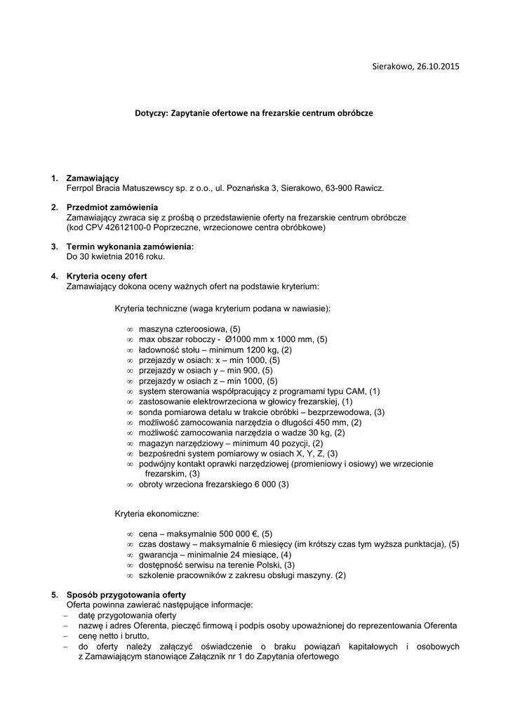 Sierakowo, 26.10.2015 Dotyczy: Zapytanie ofertowe na frezarskie centrum obróbcze 1. Zamawiający Ferrpol Bracia Matuszewscy sp. z o.o., ul. Poznańska 3, Sierakowo, 63-900 Rawicz. 2. Przedmiot zamówienia Zamawiający zwraca się z prośbą o przedstawienie oferty na frezarskie centrum obróbcze (kod CPV 42612100-0 Poprzeczne, wrzecionowe centra obróbkowe) 3. Termin wykonania zamówienia: Do 30 kwietnia 2016 roku. 4. Kryteria oceny ofert Zamawiający dokona oceny ważnych ofert na podstawie kryterium: Kryteria techniczne (waga kryterium podana w nawiasie): • • • • • • • • • • • • • • maszyna czteroosiowa, (5) max obszar roboczy - Ø1000 mm x 1000 mm, (5) ładowność stołu – minimum 1200 kg, (2) przejazdy w osiach: x – min 1000, (5) przejazdy w osiach y – min 900, (5) przejazdy w osiach z – min 1000, (5) system sterowania współpracujący z programami typu CAM, (1) zastosowanie elektrowrzeciona w głowicy frezarskiej, (1) sonda pomiarowa detalu w trakcie obróbki – bezprzewodowa, (3) możliwość zamocowania narzędzia o długości 450 mm, (2) możliwość zamocowania narzędzia o wadze 30 kg, (2) magazyn narzędziowy – minimum 40 pozycji, (2) bezpośredni system pomiarowy w osiach X, Y, Z, (3) podwójny kontakt oprawki narzędziowej (promieniowy i osiowy) we wrzecionie frezarskim, (3) • obroty wrzeciona frezarskiego 6 000 (3) Kryteria ekonomiczne: • • • • • cena – maksymalnie 500 000 €, (5) czas dostawy – maksymalnie 6 miesięcy (im krótszy czas tym wyższa punktacja), (5) gwarancja – minimalnie 24 miesiące, (4) dostępność serwisu na terenie Polski, (3) szkolenie pracowników z zakresu obsługi maszyny. (2) 5. Sposób przygotowania oferty Oferta powinna zawierać następujące informacje: − datę przygotowania oferty − nazwę i adres Oferenta, pieczęć firmową i podpis osoby upoważnionej do reprezentowania Oferenta − cenę netto i brutto, − do oferty należy załączyć oświadczenie o braku powiązań kapitałowych i osobowych z Zamawiającym stanowiące Załącznik nr 1 do Zapytania ofertowego 6. Wymagania dla oferentów − Zamawiający nie dopuszcza możliwości składania ofert częściowych, − Zamawiający nie przewiduje udzielenia zamówień uzupełniających, − Zamawiający nie dopuszcza możliwości składania ofert wariantowych, − Wykonawca winien być związany ofertą min. 30 dni od ostatecznego terminu składania ofert. 7. Miejsce oraz termin składania ofert Oferta powinna być doręczona pocztą, osobiście do dnia 14.12.2015 r. do godz. 15.00 na adres: Ferrpol Bracia Matuszewscy sp. z o.o., ul. Poznańska 3, Sierakowo, 63-900 Rawicz lub przesłana e-mail na adres: [email protected] 8. Pozostałe informacje − ocena ofert zostanie dokonana niezwłocznie po upływie terminu ważności zapytania ofertowego − oferty złożone po terminie nie będą rozpatrywane − w toku badania i oceny ofert Zamawiający może żądać od oferentów wyjaśnień dotyczących treści złożonych ofert. 9. Osoby do kontaktu: Mariusz Siecla, Tel. +48-509-205-315 e-mail: [email protected] Tadeusz Matuszewski V-ce Prezes Ferrpol Bracia Matuszewscy sp. z o.o. Krzysztof Matuszewski V-ce Prezes Ferrpol Bracia Matuszewscy sp. z o.o. Załącznik nr 1 do Zapytania ofertowego – Oświadczenie Wykonawcy ............................................................... /pieczątka nagłówkowa Wykonawcy/ ................................, dnia .................. /miejscowość, data/ OŚWIADCZENIE O BRAKU POWIĄZAŃ Oświadczam, iż reprezentowana przeze mnie jednostka …………………………………………………………………………………………………………… ani osoby upoważnione do zaciągania zobowiązań w jej imieniu nie posiadają żadnych powiązań osobowych ani kapitałowych z Zamawiającym (Ferrpol Bracia Matuszewscy Sp. z o.o). Przez powiązania kapitałowe lub osobowe rozumie się wzajemne powiązania między beneficjentem lub osobami upoważnionymi do zaciągania zobowiązań w imieniu beneficjenta lub osobami wykonującymi w imieniu beneficjenta czynności związane z przygotowaniem i przeprowadzeniem procedury wyboru wykonawcy a wykonawcą, polegające w szczególności na: a) uczestniczeniu w spółce jako wspólnik spółki cywilnej lub spółki osobowej, b) posiadaniu co najmniej 10 % udziałów lub akcji, c) pełnieniu funkcji członka organu nadzorczego lub zarządzającego, prokurenta, pełnomocnika, d) pozostawaniu w związku małżeńskim, w stosunku pokrewieństwa lub powinowactwa w linii prostej, pokrewieństwa drugiego stopnia lub powinowactwa drugiego stopnia w linii bocznej lub w stosunku przysposobienia, opieki lub kurateli. Z poważaniem,