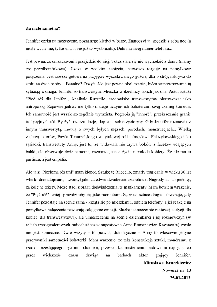 Za mało samotna? Jennifer czeka na mężczyznę, poznanego kiedyś w barze. Zauroczył ją, spędzili z sobą noc (a może wcale nie, tylko ona sobie już to wyobraziła). Dała mu swój numer telefonu... Jest pewna, że on zadzwoni i przyjedzie do niej. Toteż stara się nie wychodzić z domu (mamy erę przedkomórkową). Czeka w wielkim napięciu, nerwowo reaguje na pomyłkowe połączenia. Jest zawsze gotowa na przyjęcie wyczekiwanego gościa, dba o strój, nakrywa do stołu na dwie osoby... Banalne? Dosyć. Ale jest pewna okoliczność, która zainteresowanie tą sytuacją wzmaga: Jennifer to transwestyta. Mieszka w dzielnicy takich jak ona. Autor sztuki "Pięć róż dla Jenifer", Annibale Ruccello, środowisko transwestytów obserwował jako antropolog. Zapewne jednak nie tylko dlatego uczynił ich bohaterami swej czarnej komedii. Ich samotność jest wszak szczególnie wyrazista. Pogłębia ją "inność", przekraczanie granic tradycyjnych ról. By żyć, tworzą iluzje, dopisują sobie życiorysy. Gdy Jennifer rozmawia z innym transwestytą, mówią o swych byłych mężach, porodach, menstruacjach... Wielką zasługą aktorów, Pawła Tchórzelskiego w tytułowej roli i Jarosława Felczykowskiego jako sąsiadki, transwestyty Anny, jest to, że widownia nie zrywa boków z facetów udających babki, ale obserwuje dwie samotne, rozmawiające o życiu niemłode kobiety. Że nie ma tu pastiszu, a jest empatia. Ale ja z "Pięcioma różami" mam kłopot. Sztukę tę Ruccello, zmarły tragicznie w wieku 30 lat włoski dramatopisarz, stworzył jako zaledwie dwudziestoczterolatek. Nagrody dostał później, za kolejne teksty. Może stąd, z braku doświadczenia, te mankamenty. Mam bowiem wrażenie, że "Pięć róż" lepiej sprawdziłoby się jako monodram. Są w tej sztuce długie sekwencje, gdy Jennifer pozostaje na scenie sama - krząta się po mieszkaniu, odbiera telefony, a jej reakcje na pomyłkowe połączenia zawierają całą gamę emocji. Słucha jednocześnie radiowej audycji dla kobiet (dla transwestytów?), ale umieszczenie na scenie dziennikarki i jej rozmówczyń (w rolach transgenderowych radiosłuchaczek sugestywna Anna Romanowicz-Kozanecka) wcale nie jest konieczne. Dwie wizyty – to prawda, dramatyczne – Anny to właściwie jedyne przerywniki samotności bohaterki. Mam wrażenie, że taka konstrukcja sztuki, mondramu, z rzadka przestającego być monodramem, przeszkadza misternemu budowaniu napięcia, co przez większość czasu dźwiga na barkach aktor grający Jennifer. Mirosława Kruczkiewicz Nowości nr 13 25-01-2013