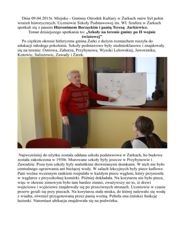 Dnia 09.04.2015r. Miejsko - Gminny Ośrodek Kultury w Żarkach znów był pełen wrażeń historycznych. Uczniowie Szkoły Podstawowej im. Wł. Szafera w Żarkach spotkali się z panem Hieronimem Borzęckim i panią Teresą Jarkiewicz. Temat dzisiejszego spotkania to: „Szkoły na terenie gminy po II wojnie światowej” Po ciężkim okresie hitleryzmu gmina Żarki z dużym rozmachem ruszyła do edukacji młodego pokolenia. Szkoły podstawowe były siedmioklasowe i znajdowały się na terenie: Ostrowa, Zaborza, Przybynowa, Wysoki Lelowskiej, Jaworznika, Kotowic, Suliszowic, Zawady i Żarek. Najwcześniej do użytku została oddana szkoła podstawowa w Żarkach, bo budowa została zakończona w 1930r. Murowane szkoły były jeszcze w Przybynowie i Zawadzie. Poza tym szkoły były maleńkimi drewnianymi domkami. W nich nie było centralnego ogrzewania ani bieżącej wody. W salach lekcyjnych były piece kaflowe. Pani woźna wczesnym rankiem rozpalała w każdym piecu węglem, który przynosiła w węglarce z przyszkolnej komórki. Później dokładała. Na korytarzu nie było pieca, więc w okresie zimowym było tam bardzo zimno, zważywszy no to, iż drzwi wejściowe i wyjściowe znajdowały się po przeciwnych stronach. Uczniowie w czasie przerw grzali się przy piecach. Na korytarzu stała miska, do której nalewało się wodę z wiadra, również przygotowaną przez panią woźną. Pełniła ona (miska) funkcję łazienki. Natomiast ubikacja znajdowała się na podwórku. W szkole nie było sali gimnastycznej, więc zajęcia z gimnastyki prowadzone były na korytarzu w czasie jesiennym i wiosennym. Okres zimowy i letni to jazda na sankach, lepienie bałwana, rzuty śnieżkami do celu lub gra w palanta, w klasy, gry zespołowe, pokonywanie toru przeszkód, gimnastyka. Sale lekcyjne nie były duże, a zajęcia uczniowie mieli łączone, np. klasa V z VI. I tak jedna klasa miała język polski, a druga w tym samym czasie rachunki, których uczył jeden nauczyciel. Pisało się piórami gęsimi, później obsadkami atramentem z kałamarza. Mimo tych uciążliwych warunków nikt nie narzekał. Nauczyciele byli zadowoleni ze swoich osiągnięć, a uczniowie byli bardzo zdyscyplinowani i czerpali radość z faktu, że mogą się uczyć. Do naszych szkół na terenie gminy uczęszczały dzieci polskie i żydowskie. Jedne i drugie chciały się uczyć jak najlepiej. Pamiętam, że w tych poszczególnych szkołach uczyli bardzo lubiani nauczyciele. A byli to: w Kotowicach – pani Zagrodzińska, w Zaborzu – pani Radosz, w Ostrowie – pani Piętak, w Wysoce Lelowskiej – pani Śliwa, w Suliszowicach - pan Wroński, który był jednocześnie był kierownikiem szkoły. Tekst opracowała: Anna Hamerla, Zdjęcia Roman Hamerla.