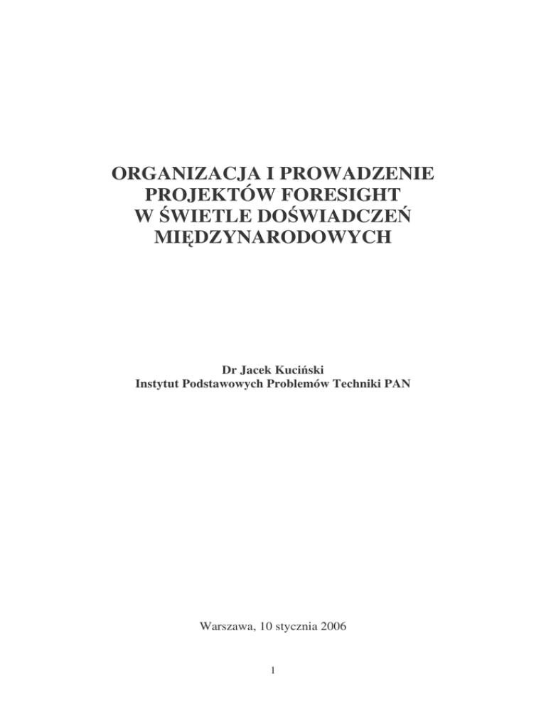 ORGANIZACJA I PROWADZENIE PROJEKTÓW FORESIGHT W ŚWIETLE DOŚWIADCZEŃ MIĘDZYNARODOWYCH Dr Jacek Kuciński Instytut Podstawowych Problemów Techniki PAN Warszawa, 10 stycznia 2006 1 SPIS TREŚCI 1. Rys historyczny 2. Cel i charakter projektów foresight 3. Foresight a prognozowanie 4. Metodologia foresight 5. Rodzaje projektów foresight 6. Organizacja i prowadzenie projektu foresight 7. Działania Komisji Europejskiej w zakresie foresight 2 1. RYS HISTORYCZNY Metodyka foresight’u została prawdopodobnie zastosowana po raz pierwszy podczas II wojny światowej w armii amerykańskiej. W celu lepszego przygotowanie się na „nieprzewidywalne” posunięcia wroga zastosowano wówczas metody „burzy mózgów”, panelu ekspertów i inne. Od drugiej połowy lat 60-tych ubiegłego wieku zaczęto stosować i usprawniać metody foresight na potrzeby dużych koncernów przemysłowych w USA. Przełomem w foresight było zastosowanie w 1969 roku w firmie Rand Corporation rozbudowanej metody wielokrotnego ankietowania dużych grup fachowców – nazywaną Metodą Delhi. Polegała ona tym, iż wyniki otrzymane z pierwszej „edycji” ankiet były odpowiednio analizowane i wykorzystywane do konstruowania bardziej już precyzyjnych pytań w kolejnej edycji ankiet. Umożliwiało to wyłonienie z pierwotnego pozornego chaosu odpowiedzi najbardziej powszechnych przekonań. Kolejnym istotnym krokiem w rozwoju metod foresight było wprowadzenie metody analizy krzyżowej wpływów (O. Helmer, 1977) pozwalającej na wydobycie ukrytych powiązań pomiędzy analizowanymi czynnikami. Zmiany zachodzące w gospodarce światowej, i powstawanie coraz bardziej świadomego społeczeństwa spowodowały, że metody foresight stosowane pierwotnie w obszarze wojskowości zostały przeniesione do przemysłu, a następnie zastosowane do rozwiązywania problemów związanych z rozwojem społecznym (rys 1). Społeczeństwo Przemysł Wojsko Rys. 1 Powiększanie obszarów stosowania metodologii foresight Początek dynamicznego rozwoju gospodarki japońskiej w końcu lat 60-tych wiązał się z przenoszeniem rozwiązań technicznych i organizacyjnych z USA. W procesie tym Japończycy przejęli także metody budowania scenariuszy rozwoju przemysłu, uruchamiając na przestrzeni 20 lat serię pięciu dużych projektów w zakresie foresight’u technologicznego. Doświadczenia japońskie przejęli wkrótce Niemcy uruchamiając serię ćwiczeń foresight, w tym także wspólny projekt japońsko-niemiecki. Działania typu foresight stały się od tego czasu stałym narzędziem polityki gospodarczej Niemiec. Z czasem zaczęły stosować go prawie wszystkie państwa Europy zachodniej a także szybko rozwijające się kraje w Azji i na innych kontynentach (rys.2). W ostatnich kilku latach narodowe projekty foresight zostały po raz pierwszy uruchomione w nowych krajach członkowskich Unii Europejskiej. Przy czym pierwszy z nich, i jak dotąd najbardziej rozbudowany, na Węgrzech a drugi w Republice Czech. Proces uruchamiania działań typu foresight w tych krajach jest wspierany przez Komisję Europejską, między innymi poprzez specjalnie uruchomiony w tym celu program FOR-LEARN. 3 Peru Brazylia Polska Tajlandia USA Rep. Korei “Delphi Method” – RAND Co., 1969 Projekt Niemiecko -Japoński “Cross-Impact-Analysis” – O. Helmer,1977 Japonia Project:1, 2, 3, 4, 5 Francja Niemcy Japonia Project: 6 RPA Indonezja „Zdrowie i życie” Rumunia ? Estonia Rep. Hiszpania Czeska Węgry Austria UK Holandia Niemcy Finlandia „Mini-Delphi” Niemcy Japonia Proj. 7, 8 1993 1960 1970 1980 1990 1994 1996 1998 2002 2004 2005 Rys. 2 Przykłady większych projektów foresight na świecie Pierwsze działania typu foresight na poziomie narodowym rozpoczęto w Polsce w IV kwartale 2003 roku poprzez uruchomienie Pilotażowego Projektu Foresight w polu badawczym Zdrowie i Życie, stanowiącym pierwszy etap Narodowego Programu Foresight. Projekt ten, obejmujący 11 obszarów badawczych, zakończony został na początku 2005 roku przeprowadzeniem konsultacji społecznych i publikacją raportu końcowego na stronach internetowych Ministerstwa Nauki i Informatyzacji. Następne etapy realizacji Narodowego Programu Foresight miały obejmować 3 pola badawcze: „Zrównoważony Rozwój”, „Technologie Informatyczne” i „Bezpieczeństwo”. Najpełniejsze informacje na temat prowadzonych w Europie projektów foresight publikowane są na portalach The European Foresight Monitoring Network (www.efmn.info) oraz Science and Technology Foresight (http://www.cordis.lu/foresight/home.html). – rys. 3 i 4, Rys. Rozmieszczenie głównych ośrodki europejskich w zakresie działalności foresight 4 Ameryka 63 Australia 10 Austria 10 Belgia 30 Brazylia 1 Bułgaria 4 Kanada 7 Chiny 1 Cypr 11 Republika Czech 6 Dania 19 EU-25 20 Estonia 48 Finlandia 29 Francja 22 Niemcy 97 Grecja 5 Wegry 2 Islandia 1 Irlandia 8 Izrael 1 Włochy 6 Japonia 3 Litwa 9 Luksemburg 3 Malta 112 Holandia 57 Norwegia 14 1 Polska Portugalia 2 Rumunia 2 Słowenia 1 Hiszpania 5 Szwecja 5 Wielka Brytania 28 Turcja 35 - raporty EFMN (The European Foresight Monitoring Network) - projekty foresight - inne dokumenty związane z działaniami foresight Rys. 4 Działania foresight prowadzone aktualnie na świecie 5 2. CEL I CHARAKTER PROJEKTÓW FORESIGHT Klasycznie rozumiane planowanie działań możliwe jest tylko wtedy, gdy ich horyzont czasowy jest stosunkowo krótki. Oczywiście dla różnego rodzaju działań pojęcie to będzie oznaczało inny odcinek czasu, jednakże zawsze oznacza to taki okres, dla którego jesteśmy w stanie z dość dużym prawdopodobieństwem określić zmiany istotnych dla nas parametrów. Zupełnie inaczej jest w przypadku bardzo długich okresów czasu, na przykład 20 lat, w którym mogą zajść tak radykalne zmiany, iż niemożliwe jest ekstrapolacja posiadanej wiedzy. W takim przypadku nie ma sensu próba planowania działań, a jedynie można rozważać trendy