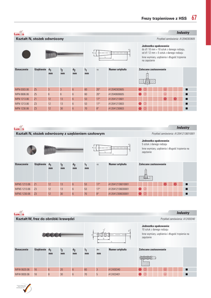 Frezy trzpieniowe z HSS 67 Industry Kształt N, stożek odwrócony Przykład zamówienia: A12040303605 Jednostka opakowania: do d1 10 mm = 10 sztuk z danego rodzaju, od d1 12 mm = 5 sztuk z danego rodzaju Inne wymiary, uzębienia i długość trzpienia na zapytanie Oznaczenie bUzębienie b b b b bd1 bmm b b b bl2 bmm b b b bd2 bmm b b b bl1 bmm b b b bα b b b b bNumer artykułu b b b b MFN 0303.06 aZ5 a3 a3 a6 a60 a20° aA12040303605 bZalecane zastosowanie b b b b a� a햳 a a a a햷 a MFN 0606.06 aZ5 a6 a6 a6 a60 a20° aA12040606605 a� a햳 a a a MFN 1213.06 aZ1 a12 a13 a6 a53 a17° aA12041213601 a a a a MFN 1213.06 aZ3 a12 a13 a6 a53 a17° aA12041213603 a� a햳 a a MFN 1230.06 aZ3 a12 a30 a6 a70 a8° aA12041230603 a� a햳 a a a b b b b b a a a ■ a햷 a a a a ■ a� a a� a a ■ a a a a a a ■ a a a a a a ■ Industry Kształt N, stożek odwrócony z uzębieniem czołowym Przykład zamówienia: A120412136010001 Jednostka opakowania: 5 sztuk z danego rodzaju Inne wymiary, uzębienia i długość trzpienia na zapytanie Oznaczenie bUzębienie b b b b bd1 bmm b b b bl2 bmm b b b bd2 bmm b b b bl1 bmm b b b bα b b b b bNumer artykułu b b b b aA120412136010001 bZalecane zastosowanie b b b b a a a a a a� a MFNS 1213.06 aZ1 a12 a13 a6 a53 a17° MFNS 1213.06 aZ3 a12 a13 a6 a53 MFNS 1230.06 aZ3 a12 a30 a6 a70 b b b b b a� a a ■ a17° aA120412136030001 a� a햳 a a a a a a a a ■ a8° aA120412306030001 a� a햳 a a a a a a a a ■ Industry Kształt W, frez do obróbki krawędzi Przykład zamówienia: A12430340 Jednostka opakowania: 10 sztuk z danego rodzaju Inne wymiary, uzębienia i długość trzpienia na zapytanie Oznaczenie bUzębienie b b b b bd1 bmm b b b bl2 bmm b b b bd2 bmm b b b bl1 bmm b b b br≈ bmm b b b bNumer artykułu b b b b aA12430340 bZalecane zastosowanie b b b b a� a햳 a a a a햷 a MFW 0620.06 a16 a6 a20 a6 a60 a3 MFW 0830.06 a18 a8 a30 a6 a70 a5 a a a ■ aA12433401 a� a햳 a a a a ■ a a a햷 a b b b b b Warunki składania ofert, dostawy i płatności Stan: sierpień 2008 1. Poniższe warunki są ostateczne i stanowią część składową umowy. Obowiązują one w stosunku do wszystkich (także przyszłych) umów i innych usług. Podstawą wszystkich ofert są wyłącznie nasze warunki; uznaje się je za obowiązujące w momencie udzielenia zlecenia lub przyjęcia dostawy. Warunki zamawiającego, które są sprzeczne lub różnią się od naszych warunków umowy, nie są dla nas zobowiązujące, także wtedy, gdy po ich otrzymaniu ponownie nie wyraziliśmy naszego wyraźnego sprzeciwu. 2. Nie ma żadnych dodatkowych uzgodnień ustnych. Dodatkowe uzgodnienia, odstępstwa lub zmiany stają się wiążące dopiero po naszym pisemnym potwierdzeniu. Dotyczy to przede wszystkim uzgodnień dotyczących właściwości wyrobów. 3. Niniejsze warunki obowiązują wyłącznie w stosunku do przedsiębiorstw lub osób prawnych prawa publicznego lub publiczno-prawnego majątku odrębnego. 7. Nasze oferty nie są zobowiązujące. Dokumentacja należąca do oferty, jak np. rysunki, ilustracje, dane techniczne, powoływanie się na normy oraz dane w prospektach, nie stanowi uzgodnień dotyczących właściwości, chyba że zostanie to określone wyraźnie i na piśmie. 2. Nasze wzory, próbki, dane na temat składu i właściwości naszych wyrobów są oparte na naszych doświadczeniach i specjalistycznej wiedzy, nie stanowią jednak żadnej gwarancji ani innych wiążących zapewnień. 3. Do prospektów, ilustracji, rysunków, szkiców i innych dokumentów zastrzegamy sobie prawo własności i prawa autorskie; bez naszej zgody nie wolno ich powielać, kopiować z Internetu lub udostępniać osobom trzecim, a na nasze żądanie należy je nam niezwłocznie odesłać. 2. 3. III. Zawieranie umów 1. Uznaje się, że zlecenie zostało przyjęte, gdy zostanie przez nas potwierdzone na piśmie lub gdy zrealizowano dostawę. 2. Potwierdzenie zlecenia stanowi podstawę treści i zakresu zlecenia. Uzupełnienia, zmiany lub ustne porozumienia wymagają dla swojej ważności naszego pisemnego potwierdzenia. 3. Zamawiający ponosi odpowiedzialność za prawidłowość dostarczanych przez niego dokumentów takich jak rysunki, wzory itp. Ustne dane na temat wymiarów itp. wymagają pisemnego potwierdzenia. IV. Ceny 1. 2. Nasze ceny są cenami w EURO z zakładu w Engelskirchen, z wyłączeniem opakowania, opłat przewozowych, porto, opłat celnych i ubezpieczenia. Narzuty i rabaty naliczane są zawsze od ceny podstawowej. To samo dotyczy przesyłek częściowych lub ekspresowych przygotowanych na życzenie Zamawiającego. Minimalna wartość zlecenia wynosi 130,- € netto. Przy zleceniach poniżej 130,- € naliczamy opłatę manipulacyjną w wysokości 15,- €. 3. Do ceny doliczany jest podatek VAT w aktualnie obowiązującej ustawowej wysokości. 4. W przypadku dostawy do 4 miesięcy obowiązują ceny z dnia potwierdzenia zlecenia; w przypadku dłuższych terminów dostawy obowiązywać będą ceny obowiązujące w dniu dostawy, jeśli zmianie ulegną nasze koszty własne, takie jak koszty materiałowe, płacowe lub inne koszty produkcji. 2. Nasze faktury są płatne w terminie 14 dni od daty wystawienia faktury z uwzględnieniem skonta w wysokości 2 % lub w terminie 30 dni netto. Płatność musi być zrealizowana w taki sposób, aby należna nam kwota była do naszej dyspozycji najpóźniej w dniu wymagalności. Mamy prawo do realizacji części dostawy w możliwym ze względu na okoliczności zakresie. Pierwsze dostawy realizujemy zasadniczo za zapłatą z góry lub za pobraniem. 4. Weksle (przyjęcie wyłącznie po pisemnym uzgodnieniu) i czeki przyjmujemy wyłącznie w celu realizacji zobowiązania. Opłaty dyskontowe i za ściągnięcie należności obciążają Zamawiającego. Nie ponosimy żadnej odpowiedzialności za terminowe przedłożenie. 5. W przypadku uzyskania informacji o przyczynach dających uzasadnione wątpliwości co do dalszej możliwości wywi