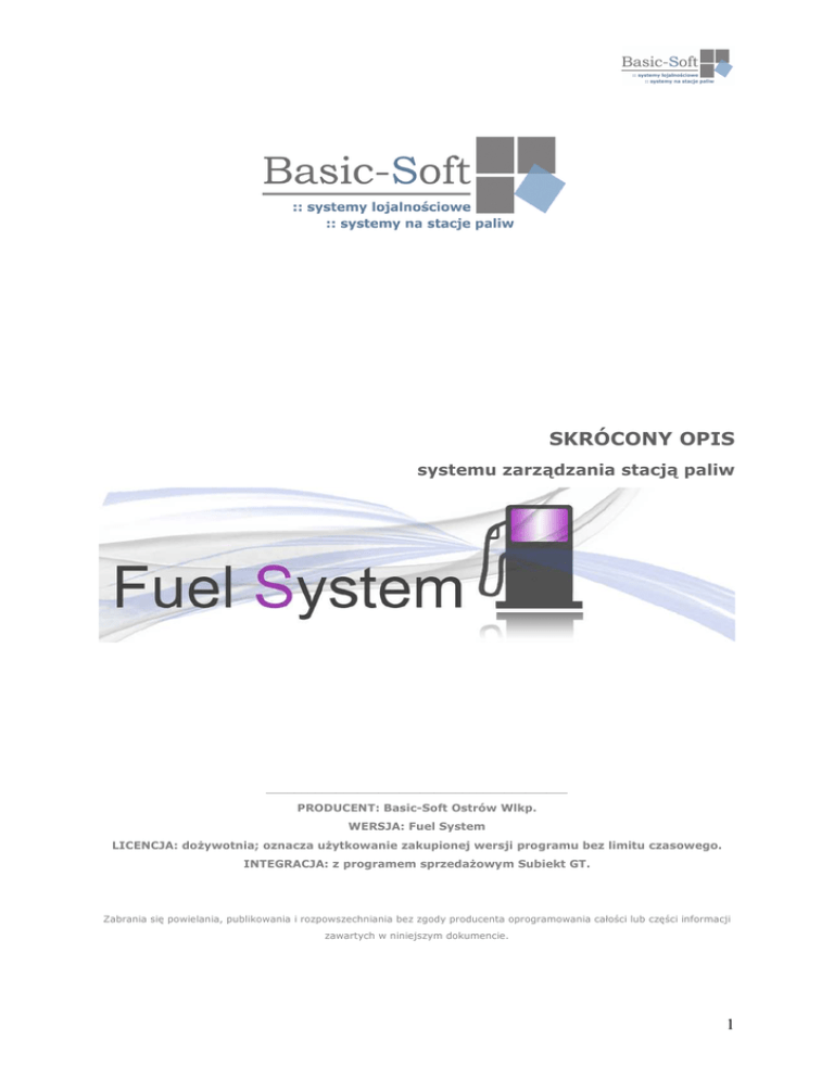 SKRÓCONY OPIS systemu zarządzania stacją paliw ___________________________________________ PRODUCENT: Basic-Soft Ostrów Wlkp. WERSJA: Fuel System LICENCJA: dożywotnia; oznacza użytkowanie zakupionej wersji programu bez limitu czasowego. INTEGRACJA: z programem sprzedażowym Subiekt GT. Zabrania się powielania, publikowania i rozpowszechniania bez zgody producenta oprogramowania całości lub części informacji zawartych w niniejszym dokumencie. 1 Niniejszy dokument dotyczy pakietu Insert, w skład którego wchodzą poniższe moduły: NAZWA OPIS: Fuel System Subiekt GT System zarządzania wydaniem paliw i gazu – obsługa dystrybutorów. Program kasowo-magazynowy. OPIS Fuel System Program do wydaniem System paliw zarządzania i gazu przeznaczony Fuel jest dla średnich i małych stacji paliw oraz stacji LPG [dla stacji większych stacji paliw oraz bezobsługowych bezobsługowego i polecamy bezgotówkowego system zarządzania stacją paliw: Fuel Spedytor wykorzystujący karty zbliżeniowe. Więcej informacji na www.basic-soft.pl lub pod naszymi numerami telefonów]. Program Fuel System jest dedykowany stacjom paliw jako system zarządzania dystrybutorami oraz system sprzedaży (poprzez zintegrowanie z popularnym programem sprzedażowym: Subiektem GT). System rejestruje sprzedaż paliwa i gazu oraz wszystkich pozostałych artykułów na stacji poprzez wywołanie odpowiednich dokumentów rozchodowych z Subiekta GT. Fuel System jest elementem łączącym Subiekta GT z dystrybutorami paliw, w przejrzysty sposób pokazując rzeczywisty stan dystrybutorów. Zapewnia całkowitą kontrolę nad wydaniem paliwa i gazu, posiada możliwość wszechstronnego sterowania dystrybutorami, 2 umożliwia zestawienie totalizerów (liczników dystrybutorów z ilościami wydanymi przez program oraz sprzedażą z Subiekta GT) oraz funkcję preselekcji kwotowej. Dzięki wbudowanej funkcji o nazwie Auto Zwolnienie program automatycznie po wydaniu paliwa lub gazu zwalnia dystrybutor zapisując jednocześnie daną transakcję do tabeli, z której można ją rozliczyć w późniejszym czasie. WYGLĄD OKNA PROGRAMU FUEL SYSTEM ZAKRES FUNKCJONOWANIA Fuel System + Subiekt GT • odczyt stanów tankowania, • wizualizacja stanów dystrybutorów na ekranie monitora, • blokowanie i odblokowywanie dystrybutora z poziomu programu, 3 • programowanie cen na dystrybutory z poziomu programu, • funkcja preselekcji kwotowej na dystrybutor, • funkcja Auto Zwolnienie zapewniająca automatyczne zwolnienie dystrybutora po wylaniu paliwa i przejście transakcji do późniejszego rozliczenia, • tryb dzienny lub nocny pracy systemu, • rozliczanie transakcji poprzez wywoływanie odpowiednich dokumentów sprzedaży z programu Subiekt GT za pomocą Sfery dla Subiekta GT, w zakresie dokumentów: FS, PA, PA imienny, WZ z VAT, RW (opcjonalnie automatyczne wystawianie dokumentów dla FS, WZ z VAT i RW), • zapis w bazie danych informacji o tankowaniach, tworzenie dziennika zdarzeń tankowań, • prowadzenie systemu rabatowania, czyli obsługa kart lojalnościowych – kart z kodem kreskowym, poprzez dodatkowy, płatny moduł Kontrahent (wprowadzanie kart do bazy danych programu, odczytywanie kart, zarządzanie statusem karty – możliwość dodania, usunięcia, zablokowania i odblokowania karty, zarządzanie danymi na karcie, dodawanie i usuwanie kontrahentów, zarządzanie punktami na karcie – dodawanie i usuwanie, podgląd daty rejestracji karty i jej ostatniej aktualizacji, wyszukiwanie kontrahenta lub karty za pomocą wyszukiwarek, podgląd transakcji wykonanych za pomocą kart, podgląd dziennika zdarzeń, drukowanie raportów, • konfiguracja ustawień systemu, • obsługa gospodarki magazynowej sklepu poprzez program Subiekt GT. 4 BUDOWA PROGRAMU Fuel System Program Fuel System składa się z dwóch modułów : >> modułu nasłuchującego dystrybutory, który jest aplikacją komunikującą się za pomocą urządzenia RS 485/RS 232 z liczydłem dystrybutora. Aplikacja odzwierciedla w czasie rzeczywistym zachowanie się dystrybutora, czyli rejestruje na bieżąco wszystkie zdarzenia zachodzące na dystrybutorze (rejestrator transmisji komunikacji). Dodatkowo mamy kontrolę nad dystrybutorem poprzez funkcje takie jak: blokowanie i odblokowanie dystrybutora, programowanie cen paliw oraz programowanie limitu wartości wylania (preselekcja). Zastosowana technologia pozwala sterownik aplikacją symulującą sterownik. zastąpić drogi Takie rozwiązanie jest równie stabilne i wydajne, ale zdecydowanie tańsze, ponieważ nie wymaga nakładów sprzętowych. W tej technologii pracują dystrybutory Adast, MMPetro, Petronova, Adamom (Beta Control). >> modułu sprzedażowego, który jest aplikacją instalowaną na stanowiskach sprzedaży. Pozwala on rozliczać transakcje zarejestrowane przez dystrybutor poprzez wywołanie odpowiedniego dokumentu sprzedaży z systemu Subiekt GT. Aplikacja osobno rejestruje wszystkie tankowania wykonane na dystrybutorze tworząc wiarygodny dziennik zdarzeń tankowań. Z poziomu tej aplikacji można również blokować i odblokowywać dystrybutory oraz programować ceny paliw. 5 FUNKCJONALNOŚĆ DODATKOWA Fuel System Funkcjonalność Fuel System może być poszerzona o moduły płatne. systemie uzgodnieniu z naszym Istnieje możliwość zastosowania indywidualnych rozwiązań dla działem technicznym. Moduły klienta w po dodatkowe przewidziane dla Fuel System: 1. paliw Fuel Kontrahent – system lojalnościowy dla stacji współpracujący Subiektem GT. z Program Fuel System obsługuje lub karty samym z kodem kreskowym odczytywane przez popularne czytniki, w większości przypadków już obecne w punktach sprzedaży. Program gromadzi i zlicza punkty dla danej karty, zapewnia także możliwość indywidualnego ustalenia schematu punktacji (ilość punktów za daną kwotę) oraz rodzaj naliczania (poprzez wprowadzanie kwoty lub punktów). Program Fuel Kontrahent jest systemem modułowym. Dost