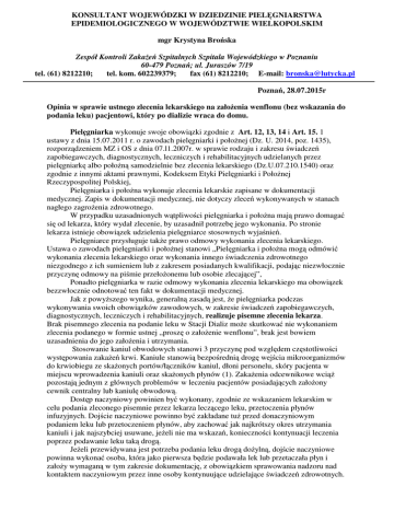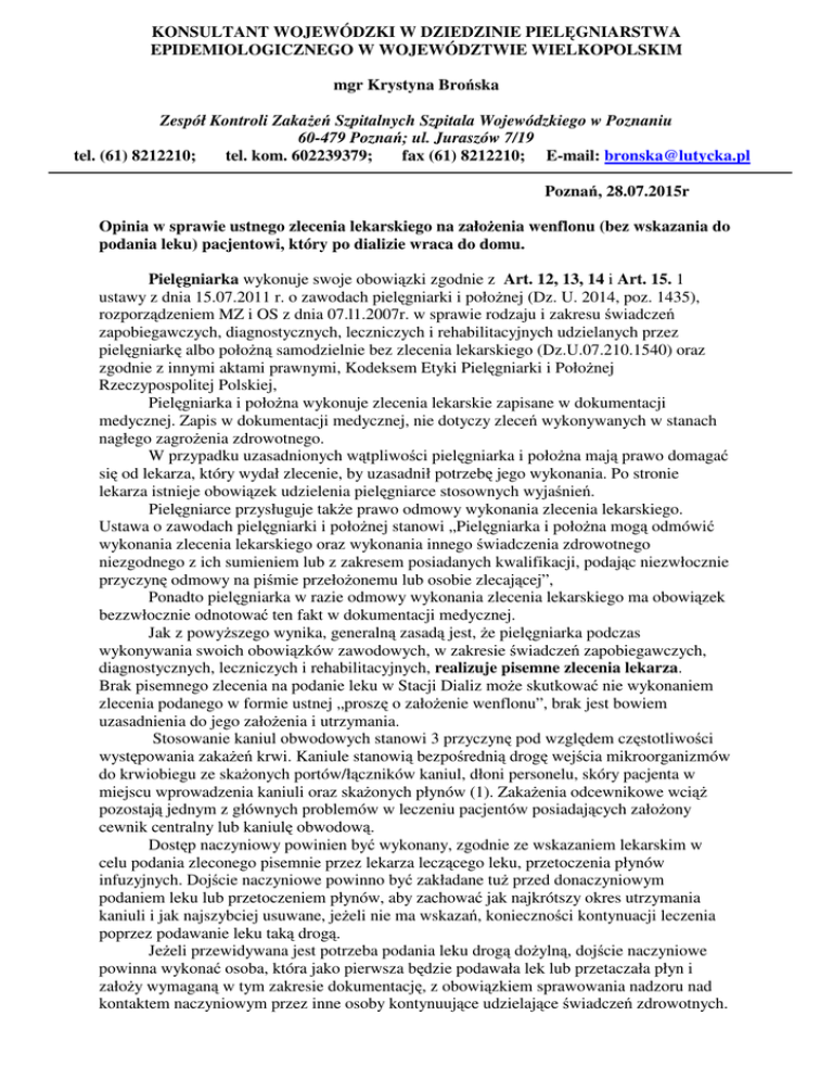 KONSULTANT WOJEWÓDZKI W DZIEDZINIE PIELĘGNIARSTWA EPIDEMIOLOGICZNEGO W WOJEWÓDZTWIE WIELKOPOLSKIM mgr Krystyna Brońska Zespół Kontroli Zakażeń Szpitalnych Szpitala Wojewódzkiego w Poznaniu 60-479 Poznań; ul. Juraszów 7/19 tel. (61) 8212210; tel. kom. 602239379; fax (61) 8212210; E-mail: [email protected] Poznań, 28.07.2015r Opinia w sprawie ustnego zlecenia lekarskiego na założenia wenflonu (bez wskazania do podania leku) pacjentowi, który po dializie wraca do domu. Pielęgniarka wykonuje swoje obowiązki zgodnie z Art. 12, 13, 14 i Art. 15. 1 ustawy z dnia 15.07.2011 r. o zawodach pielęgniarki i położnej (Dz. U. 2014, poz. 1435), rozporządzeniem MZ i OS z dnia 07.l1.2007r. w sprawie rodzaju i zakresu świadczeń zapobiegawczych, diagnostycznych, leczniczych i rehabilitacyjnych udzielanych przez pielęgniarkę albo położną samodzielnie bez zlecenia lekarskiego (Dz.U.07.210.1540) oraz zgodnie z innymi aktami prawnymi, Kodeksem Etyki Pielęgniarki i Położnej Rzeczypospolitej Polskiej, Pielęgniarka i położna wykonuje zlecenia lekarskie zapisane w dokumentacji medycznej. Zapis w dokumentacji medycznej, nie dotyczy zleceń wykonywanych w stanach nagłego zagrożenia zdrowotnego. W przypadku uzasadnionych wątpliwości pielęgniarka i położna mają prawo domagać się od lekarza, który wydał zlecenie, by uzasadnił potrzebę jego wykonania. Po stronie lekarza istnieje obowiązek udzielenia pielęgniarce stosownych wyjaśnień. Pielęgniarce przysługuje także prawo odmowy wykonania zlecenia lekarskiego. Ustawa o zawodach pielęgniarki i położnej stanowi „Pielęgniarka i położna mogą odmówić wykonania zlecenia lekarskiego oraz wykonania innego świadczenia zdrowotnego niezgodnego z ich sumieniem lub z zakresem posiadanych kwalifikacji, podając niezwłocznie przyczynę odmowy na piśmie przełożonemu lub osobie zlecającej”, Ponadto pielęgniarka w razie odmowy wykonania zlecenia lekarskiego ma obowiązek bezzwłocznie odnotować ten fakt w dokumentacji medycznej. Jak z powyższego wynika, generalną zasadą jest, że pielęgniarka podczas wykonywania swoich obowiązków zawodowych, w zakresie świadczeń zapobiegawczych, diagnostycznych, leczniczych i rehabilitacyjnych, realizuje pisemne zlecenia lekarza. Brak pisemnego zlecenia na podanie leku w Stacji Dializ może skutkować nie wykonaniem zlecenia podanego w formie ustnej „proszę o założenie wenflonu”, brak jest bowiem uzasadnienia do jego założenia i utrzymania. Stosowanie kaniul obwodowych stanowi 3 przyczynę pod względem częstotliwości występowania zakażeń krwi. Kaniule stanowią bezpośrednią drogę wejścia mikroorganizmów do krwiobiegu ze skażonych portów/łączników kaniul, dłoni personelu, skóry pacjenta w miejscu wprowadzenia kaniuli oraz skażonych płynów (1). Zakażenia odcewnikowe wciąż pozostają jednym z głównych problemów w leczeniu pacjentów posiadających założony cewnik centralny lub kaniulę obwodową. Dostęp naczyniowy powinien być wykonany, zgodnie ze wskazaniem lekarskim w celu podania zleconego pisemnie przez lekarza leczącego leku, przetoczenia płynów infuzyjnych. Dojście naczyniowe powinno być zakładane tuż przed donaczyniowym podaniem leku lub przetoczeniem płynów, aby zachować jak najkrótszy okres utrzymania kaniuli i jak najszybciej usuwane, jeżeli nie ma wskazań, konieczności kontynuacji leczenia poprzez podawanie leku taką drogą. Jeżeli przewidywana jest potrzeba podania leku drogą dożylną, dojście naczyniowe powinna wykonać osoba, która jako pierwsza będzie podawała lek lub przetaczała płyn i założy wymaganą w tym zakresie dokumentację, z obowiązkiem sprawowania nadzoru nad kontaktem naczyniowym przez inne osoby kontynuujące udzielające świadczeń zdrowotnych. Nie należy zakładać dojść naczyniowych, jeżeli nie ma pisemnego wskazania lekarskiego do podania leku bezpośrednio po założeniu tego wenflonu przez osobę wykonującą dojście. Według przytoczonych poniżej wytycznych dostęp naczyniowy dożylny może być utrzymany przez okres 72-96 godzin, pod warunkiem sprawowania stałego nadzoru nad założonym dostępem i dokumentowaniem wyników tego nadzoru, co właściwie jest możliwe tylko w warunkach szpitalnych. Istnieje zasada, iż chory wypisywany do domu, po zakończeniu procesu leczenia, ma usunięte wszystkie cewniki i dojścia naczyniowe. Celem przeciwdziałania powikłaniom konieczne jest wprowadzenie do praktyki wytycznych (procedur) odnośnie zapobiegania zakażeniom odcewnikowym, skierowanych do całego personelu medycznego, który zleca założenie i usunięcie cewników naczyniowych, zakłada i usuwa je oraz jest odpowiedzialny za opiekę nad nimi oraz obserwuje, nadzoruje i kontroluje zakażenia w szpitalach oraz innych zakładach opieki zdrowotnej (2). W zestawie wymogów działań zapobiegających takim zakażeniom są wzięte pod uwagę 2 elementy mające podstawowe znacznie dla ewentualnego rozwoju zakażenia odcewnikowego. Po pierwsze założenie kaniuli, które musi być dokonane w prawidłowy sposób oraz po drugie pielęgnacja kaniuli wprowadzonej do naczynia. Opieka nad kaniulą jest tym elementem, który podlega okresowej kontroli przy użyciu właściwych pomiarów i kart kontrolnych. W wytycznych podkreśla się poprawę wyników zakażeń szpitalnych (zmniejszenie ilości) poprzez strategię wdrażania „pakietów” oraz dokumentowanie i raportowanie zgodności postępowania ze wszystkimi elementami wdrożonych pakietów, co spełniać ma zadania kryterium pomiaru w ramach poprawy polityki, jakości i wyników. Miejsce wprowadzenia cewnika należy kontrolować badając palpacyjnie poprzez opatrunek w celu wykrycia wrażliwości (bolesności) przy dotyku oraz wzrokowo, jeśli opatrunek jest przezroczysty, wg wytycznych, jest to Kategoria II: Sugerowane do wdrożenia i poparte sugestywnymi badaniami klinicznymi lub epidemiologicznymi lub uzasadnieniem teoretyc