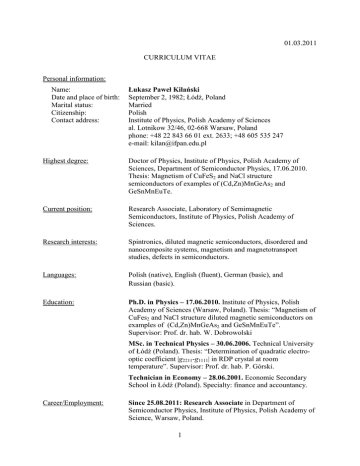 01.03.2011 CURRICULUM VITAE Personal information: Name: Date and place of birth: Marital status: Citizenship: Contact address: Łukasz Paweł Kilański September 2, 1982; Łódź, Poland Married Polish Institute of Physics, Polish Academy of Sciences al. Lotnikow 32/46, 02-668 Warsaw, Poland phone: +48 22 843 66 01 ext. 2633; +48 605 535 247 e-mail: [email protected] Highest degree: Doctor of Physics, Institute of Physics, Polish Academy of Sciences, Department of Semiconductor Physics, 17.06.2010. Thesis: Magnetism of CuFeS2 and NaCl structure semiconductors of examples of (Cd,Zn)MnGeAs2 and GeSnMnEuTe. Current position: Research Associate, Laboratory of Semimagnetic Semiconductors, Institute of Physics, Polish Academy of Sciences. Research interests: Spintronics, diluted magnetic semiconductors, disordered and nanocomposite systems, magnetism and magnetotransport studies, defects in semiconductors. Languages: Polish (native), English (fluent), German (basic), and Russian (basic). Education: Ph.D. in Physics – 17.06.2010. Institute of Physics, Polish Academy of Sciences (Warsaw, Poland). Thesis: “Magnetism of CuFes2 and NaCl structure diluted magnetic semiconductors on examples of (Cd,Zn)MnGeAs2 and GeSnMnEuTe”. Supervisor: Prof. dr. hab. W. Dobrowolski MSc. in Technical Physics – 30.06.2006. Technical University of Łódź (Poland). Thesis: “Determination of quadratic electrooptic coefficient |g2211-g1111| in RDP crystal at room temperature”. Supervisor: Prof. dr. hab. P. Górski. Technician in Economy – 28.06.2001. Economic Secondary School in Łódź (Poland). Specialty: finance and accountancy. Career/Employment: Since 25.08.2011: Research Associate in Department of Semiconductor Physics, Institute of Physics, Polish Academy of Science, Warsaw, Poland. 1 Ł. Kilański. Curriculum vitae 25.08.2010 – 24.08.2011: Post-doctoral Marie Curie Fellow, Department of Applied Physics, Aalto University and School of Science and Technology, Espoo, Finland. 01.07.2010 – 24.08.2010: Research Associate in Department of Semiconductor Physics, Institute of Physics, Polish Academy of Science, Warsaw, Poland. 01.08.2007 – 31.10.2007: Visiting Scientist in Department of Applied Physics, Helsinki University of Technology, Finland. Positron annihilation spectroscopy in semiconductors (with Dr F. Tuomisto, Positron group). 01.10.2006 – 17.06.2010: Ph.D. Student in Department of Semiconductor Physics, Institute of Physics, Polish Academy of Science, Warsaw, Poland. Supervisor: Prof. W. Dobrowolski. 01.07.2005 – 31.07.2005: Assistant in Department of Semiconductor Physics, Institute of Physics, Polish Academy of Science, Warsaw, Poland. Supervisor: Prof. W. Dobrowolski. 01.05.2000 – 30.06.2000: Department manager, Tax Execution Department, 2nd Tax Office in Łódź, Poland. Special appointments: 23.11.2009 – 27.11.2009: Visiting scientist, Laboratoire National des Champs Magnétiques Intenses, CNRS, 38042, Grenoble, France, Project: “High field magnetotransport in ferromagnetic semiconductor Cd1-xMnxGeAs2”. Advisor: dr. D. K. Maude. 20.04.2009 – 24.04.2009: Visiting scientist, Laboratoire National des Champs Magnétiques Intenses, CNRS, 38042, Grenoble, France, Project: “High field carrier transport studies in Mn doped II-IV-V2 semiconductors”. Advisor: dr. D. K. Maude. Publications: List of major publications in refereed journals (Appl. Phys. Lett. Phys. Rev. B, J. Appl. Phys. et al.) includes total of 29 refereed scientific articles: 25 published and 4 submitted. Presentations: 9 contributed talks (1 invited) and 14 poster presentations in international scientific conferences and workshops. 9 seminar talks at several different domestic and foreign physical institutes. Awards: 01.10.2008 – 30.06.2009: 3500 €, "Mazovia Ph.D. Scholarship", award by the Mazovia Marshal for the best Ph.D. students for scientific equipment. Funding and grants: 05.05.2011r. – 04.05.2014 r.: 300 000 PLN, grant of Polish Ministry of Science and Higher Education (main contributor) titled: “Nanocomposite materials based on II-IV-V2 2 Ł. Kilański. Curriculum vitae ferromagnetic semiconductors: magnetic, optical and electrical properties”. 23.12.2010 r. – 31.12.2011 r.: 120 000 PLN, grant of Polish Ministry of Science and Higher Education (project coordinator) titled: “Nanocomposite ferromagnetic semiconductors based on II-IV-V2 group compounds: magnetic, electrical and optical properties”. 25.08.2009 – 17.06.2010: 7000 €, Ph. D. grant of Polish Ministry of Science and Higher Education titled: “New materials for spintronics – transition metal doped II-IV-V2 and IV-VI semiconductors”. 23.11.2009 – 27.11.2009: 5000 €, transnational access grant for high magnetic field facility user. 20.04.2009 – 24.04.2009: 5000 €, transnational access grant for high magnetic field facility user. Collaboration: Kurnakov Institute of General and Inorganic Chemistry, Russian Academy of Sciences, (Group of Prof. S. F. Marenkin). Chernovtsy Department of the Institute of Problems of Materials Science, National Academy of Sciences of Ukraine (Group of Prof. I. E. Slynko). Center for Solid State Physics & New Materials, Institute of Physics, Belgrade (Group of Dr. N. Romcevic). Department of Physics, University of Maryland (Group of Prof. J. R. Anderson). Laboratoire National des Champs Magnétiques Intenses, CNRS, Grenoble, France (Group of Dr D. K. Maude). 3 Ł. Kilański. Curriculum vitae List of publications: I. Articles in international refereed JCR-listed scientific journals: 1. H. Nykänen, S. Suihkonen, Ł. Kilański, M. Sopanen, and F. Tuomisto, “Low energy electron beam induced vacancy activation in GaN”, Appl. Phys. Lett., in press (2012). 2. I. V. Fedorchenko, A. V. Kochura, S. F. Marenkin, A. N. Aronov, L. I. Koroleva, Ł. Kilański, R. Szymczak, W. Dobrowolski, S. Ivanenko, and E. Lahderanta, ”Advanced Materials for Spintronic Based on Zn(Si,Ge)As2 Chalcopyrites”, I