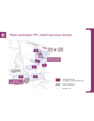 Mapa parkingów PPL wokół biurowca Sonata P20 Biurowiec Sonata Ul. 17 stycznia 49 P31 P32 P33 Terminal General Aviation P33 P - parking dostępny dla co najmniej 1 wariantu abonamentu P - parking niedostępny w ramach abonamentu - kierunek ruchu 2