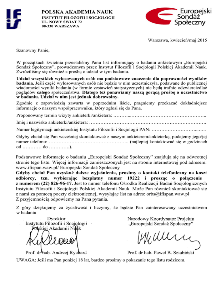 POLSKA AKADEMIA NAUK INSTYTUT FILOZOFII I SOCJOLOGII UL. NOWY ŚWIAT 72 00-330 WARSZAWA Warszawa, kwiecień/maj 2015 Szanowny Panie, W początkach kwietnia przesłaliśmy Panu list informujący o badaniu ankietowym „Europejski Sondaż Społeczny”, prowadzonym przez Instytut Filozofii i Socjologii Polskiej Akademii Nauk. Zwróciliśmy się również z prośbą o udział w tym badaniu. Udział wszystkich wylosowanych osób ma podstawowe znaczenie dla poprawności wyników badania. Jeśli część wylosowanych osób nie będzie w nim uczestniczyła, podawane do publicznej wiadomości wyniki badania (w formie zestawień statystycznych) nie będą trafnie odzwierciedlać poglądów całego społeczeństwa. Dlatego też ponawiamy naszą gorącą prośbę o uczestnictwo w badaniu. Udział w nim jest jednak dobrowolny. Zgodnie z zapowiedzią zawarta w poprzednim liście, pragniemy przekazać dokładniejsze informacje o naszym współpracowniku, który zgłosi się do Pana. Proponowany termin wizyty ankieterki/ankietera: ………...……………………………………….. Imię i nazwisko ankieterki/ankietera: ………………………………………………………………. Numer legitymacji ankieterskiej Instytutu Filozofii i Socjologii PAN: ………………………...….. Gdyby chciał się Pan wcześniej skontaktować z naszym ankieterem/ankieterką, podajemy jego/jej numer telefonu: ………………………………………….. (najlepiej kontaktować się w godzinach od ………… do ………….). Podstawowe informacje o badaniu „Europejski Sondaż Społeczny” znajdują się na odwrotnej stronie tego listu. Więcej informacji zamieszczonych jest na stronie internetowej pod adresem: www.ifispan.waw.pl/ Europejski Sondaż Społeczny Gdyby chciał Pan uzyskać dalsze wyjaśnienia, prosimy o kontakt telefoniczny na koszt odbiorcy, tzn. wybierając bezpłatny numer 19222 i prosząc o połączenie z numerem (22) 826-96-17. Jest to numer telefonu Ośrodka Realizacji Badań Socjologicznych Instytutu Filozofii i Socjologii Polskiej Akademii Nauk. Może Pan również skontaktować się z nami za pomocą poczty elektronicznej, wysyłając list na adres: [email protected] Z przyjemnością odpowiemy na Pana pytania. Z góry dziękujemy za życzliwość i liczymy, że będzie Pan zainteresowany uczestnictwem w badaniu UWAGA: Jeśli ma Pan poniżej 18 lat, bardzo prosimy o pokazanie tego listu rodzicom. Informacja o badaniu „Europejski Sondaż Społeczny” 1. „Europejski Sondaż Społeczny” (ESS) należy do najważniejszych przedsięwzięć badawczych w Europie. W roku 2005 został on uhonorowany Nagrodą Kartezjusza, przyznaną przez Komisję Europejską. Jest to najważniejsza europejska nagroda w dziedzinie nauki. W roku 2013 Komisja Europejska włączyła „Europejski Sondaż Społeczny” do europejskiej infrastruktury badawczej uznając, że jest to jedno z najważniejszych międzynarodowych przedsięwzięć badawczych. 2. W roku 2014 polskie Ministerstwo Nauki i Szkolnictwa Wyższego włączyło „Europejski Sondaż Społeczny” do tzw. Polskiej Mapy Drogowej Infrastruktury Badawczej. Obejmuje ona 53 przedsięwzięcia badawcze ze wszystkich dziedzin nauki, które są szczególnie doniosłe dla naszego kraju. 3. Obecne badanie prowadzone jest po raz siódmy. Z pełnymi wynikami badania „Europejski Sondaż Społeczny” z lat 2002, 2004, 2006, 2008, 2010 i 2012 może zapoznać się każda osoba zainteresowana tym, jak zmieniały się opinie Polaków dotyczące różnych ważnych spraw. Wyniki dostępne są nieodpłatnie na stronie internetowej www.ifispan..pl/ess (wyniki dla Polski) oraz www.europeansocialsurvey.org (dane dla wszystkich krajów uczestniczących w badaniu). 4. Wyniki badania „Europejski Sondaż Społeczny” budzą duże zainteresowanie w Polsce i na świecie. Skorzystało z nich dotąd ponad 77 957 osób z 235 krajów, w tym 3519 osób z naszego kraju. Są to głównie naukowcy, studenci, pracownicy administracji centralnej i lokalnej oraz osoby prywatne. W Polsce zorganizowano sześć konferencji naukowych poświęconych prezentacji wyników badania, a także zostały wydane trzy książki oparte na tych wynikach („Niepokoje polskie” w roku 2004, „W środku Europy?” w roku 2006 oraz „Polska – Europa. Wyniki Europejskiego Sondażu Społecznego 2001-2012”). Czwarta książka, zatytułowana „Nadzieje i niepokoje”, ukaże się w połowie 2015 roku. W sumie w Polsce i na świecie ukazało się ponad 3000 publikacji – książek i artykułów - w których wykorzystano wyniki badania ESS. Wybrane wyniki ESS były także prezentowane w czołowych polskich dziennikach oraz dyskutowane w radio. W ten sposób mogło zapoznać się z nimi całe nasze społeczeństwo. 5. Losowanie adresów osób do badań ankietowych, które prowadzimy, pozostaje w zgodzie z Ustawą o ochronie danych osobowych (z dnia 29 sierpnia 1997 r., opublikowanej w Dzienniku Ustaw Nr 133 poz. 883 z późniejszymi zmianami). 6. Realizacja omawianego badania ankietowego spełnia wszystkie wymogi Ustawy o ochronie danych osobowych. Oznacza to, że udzielone podczas badania odpowiedzi traktowane są jako poufne. Nie będą nikomu udostępniane, ani nigdzie publikowane z podaniem nazwisk ani też żadnych innych informacji umożliwiających identyfikację naszych rozmówców. Odpowiedzi osób ankietowanych zostaną opracowane jedynie w formie zbiorczych zestawień statystycznych. Po zakończeniu badania wszystkie materiały zawierające dane wylosowanych osób zostaną zniszczone, aby nie mogły być wykorzystane do żadnych innych celów. 7. 8. Podstawową sprawą dla poprawności wyników badania jest zgoda na udział w nim wszystkich wylosowanych osób. Jeśli część wylosowanych osób nie weźmie udziału w badaniu, ich poglądy nie zostaną uwidocznione. W rezultacie podawane do publicznej wiadomości wyniki badania nie będą trafnie odzwierciedlać 