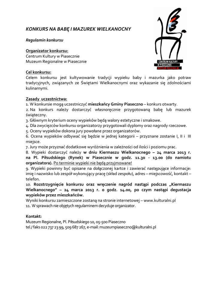 KONKURS NA BABĘ I MAZUREK WIELKANOCNY Regulamin konkursu Organizator konkursu: Centrum Kultury w Piasecznie Muzeum Regionalne w Piasecznie Cel konkursu: Celem konkursu jest kultywowanie tradycji wypieku baby i mazurka jako potraw tradycyjnych, związanych ze Świętami Wielkanocnymi oraz wykazanie się zdolnościami kulinarnymi. Zasady uczestnictwa: 1. W konkursie mogą uczestniczyć mieszkańcy Gminy Piaseczno – konkurs otwarty. 2. Na konkurs należy dostarczyć własnoręcznie przygotowaną babę lub mazurek świąteczny. 3. Głównym kryterium oceny wypieków będą walory estetyczne i smakowe. 4. Dla zwycięzców konkursu organizatorzy przygotowali dyplomy oraz nagrody rzeczowe. 5. Oceny wypieków dokona jury powołane przez organizatorów. 6. Ocena wypieków odbywać się będzie w jednej kategorii – przyznane zostanie I, II i III miejsce. 7. Jury może przyznać dodatkowe wyróżnienia w zależności od ilości i poziomu prac. 8. Wypieki dostarczyć należy w dniu Kiermaszu Wielkanocnego – 24 marca 2013 r. na Pl. Piłsudskiego (Rynek) w Piasecznie w godz. 11.30 - 13.00 (do namiotu organizatora). Po terminie wypieki nie będą przyjmowane! 9. Wypieki powinny być opisane na dołączonej kartce i zawierać następujące informacje: imię i nazwisko lub zespół wykonujący pracę (skład zespołu), adres – miejscowość, kontakt – telefon. 10. Rozstrzygnięcie konkursu oraz wręczenie nagród nastąpi podczas „Kiermaszu Wielkanocnego” – 24 marca 2013 r. o godz. 14.00, po czym nastąpi degustacja wypieków przez mieszkańców. Wyniki konkursu zamieszczone zostaną na stronie internetowej – www.kulturalni.pl 11. W sprawach nie objętych regulaminem decyduje organizator. Kontakt: Muzeum Regionalne, Pl. Piłsudskiego 10, 05-500 Piaseczno tel./ faks 022 737 23 99, 509 687 267, e-mail: [email protected]