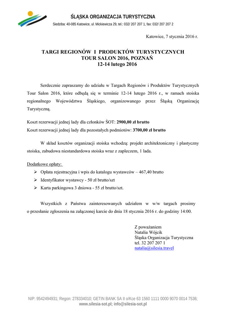 ŚLĄSKA ORGANIZACJA TURYSTYCZNA Siedziba: 40-085 Katowice, ul. Mickiewicza 29, tel.: 032/ 207 207 1, fax: 032/ 207 207 2 Katowice, 7 stycznia 2016 r. TARGI REGIONÓW I PRODUKTÓW TURYSTYCZNYCH TOUR SALON 2016, POZNAŃ 12-14 lutego 2016 Serdecznie zapraszamy do udziału w Targach Regionów i Produktów Turystycznych Tour Salon 2016, które odbędą się w terminie 12-14 lutego 2016 r., w ramach stoiska regionalnego Województwa Śląskiego, organizowanego przez Śląską Organizację Turystyczną. Koszt rezerwacji jednej lady dla członków ŚOT: 2900,00 zł brutto Koszt rezerwacji jednej lady dla pozostałych podmiotów: 3700,00 zł brutto W skład kosztów organizacji stoiska wchodzą: projekt architektoniczny i plastyczny stoiska, zabudowa niestandardowa stoiska wraz z zapleczem, 1 lada. Dodatkowe opłaty: Opłata rejestracyjna i wpis do katalogu wystawców – 467,40 brutto Identyfikator wystawcy - 50 zł brutto/szt Karta parkingowa 3 dniowa - 55 zł brutto/szt. Wszystkich z Państwa zainteresowanych udziałem w w/w targach prosimy o przesłanie zgłoszenia na załączonej karcie do dnia 18 stycznia 2016 r. do godziny 14:00. Z poważaniem Natalia Wójcik Śląska Organizacja Turystyczna tel. 32 207 207 1 [email protected] NIP: 9542494931; Regon: 278334010; GETIN BANK SA II o/Kce 63 1560 1111 0000 9070 0014 7536; www.silesia-sot.pl; [email protected]