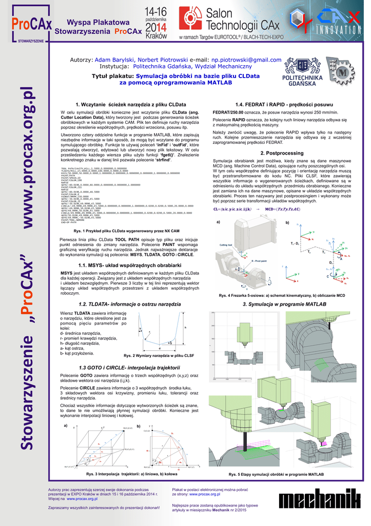 Wyspa Plakatowa Stowarzyszenia ProCAx Stowarzyszenie „ProCAx” www.procax.org.pl Autorzy: Adam Barylski, Norbert Piotrowski e-mail: [email protected] Instytucja: Politechnika Gdańska, Wydział Mechaniczny Tytuł plakatu: Symulacja obróbki na bazie pliku CLData za pomocą oprogramowania MATLAB 1. Wczytanie ścieżek narzędzia z pliku CLData W celu symulacji obróbki konieczne jest wczytanie pliku CLData (ang. Cutter Location Data), który tworzony jest podczas generowania ścieżek obróbkowych w każdym systemie CAM. Plik ten definiuje ruchy narzędzia poprzez określenie współrzędnych, prędkości wrzeciona, posuwu itp. Utworzono cztery oddzielne funkcje w programie MATLAB, które zapisują niezbędne informacje w taki sposób, że mogą być wczytane do programu symulującego obróbkę. Funkcje te używaj poleceń ‘inFid’ i ‘outFid’, które pozwalają otworzyć, edytować lub utworzyć nowy plik tekstowy. W celu prześledzeniu każdego wiersza pliku użyto funkcji ‘fgetl()’. Znalezienie konkretnego znaku w danej linii pozwala polecenie ‘strfind’. 1.4. FEDRAT i RAPID - prędkości posuwu FEDRAT/250.00 oznacza, że posuw narzędzia wynosi 250 mm/min. Polecenie RAPID oznacza, że kolejny ruch liniowy narzędzia odbywa się z maksymalną prędkością maszyny. Należy zwrócić uwagę, że polecenie RAPID wpływa tylko na następny ruch. Kolejne przemieszczenie narzędzia się odbywa się z wcześniej zaprogramowanej prędkości FEDRAT. 2. Postprocessing Symulacja obrabiarek jest możliwa, kiedy znane są dane maszynowe MCD (ang. Machine Control Data), opisujące ruchy poszczególnych osi. W tym celu współrzędne definiujące pozycję i orientację narzędzia muszą być przetransformowane do kodu NC. Pliki CLSF, które zawierają wszystkie informacje o wygenerowanych ścieżkach, definiowane są w odniesieniu do układu współrzędnych przedmiotu obrabianego. Konieczne jest zamiana ich na dane maszynowe, opisane w układzie współrzędnych obrabiarki. Proces ten nazywany jest postprocesingiem i wykonany może być poprzez serie transformacji układów współrzędnych. 𝐂𝐋=(𝐱↓𝐜 ,𝐲↓𝐜 ,𝐳↓𝐜 ,𝐢,𝐣,𝐤) → 𝐌𝐂𝐃=(𝑻𝒙,𝑻𝒚,𝑻𝒛,𝑨,𝐂) a) b) Rys. 1 Przykład pliku CLData wygenerowany przez NX CAM Pierwsza linia pliku CLData TOOL PATH opisuje typ pliku oraz inicjuje punkt odniesienia do zmiany narzędzia. Polecenie PAINT wspomaga graficzną weryfikację ruchu narzędzia. Jednak najważniejsze deklaracje do wykonania symulacji są polecenia: MSYS, TLDATA, GOTO i CIRCLE. 1.1. MSYS- układ współrzędnych obrabiarki MSYS jest układem współrzędnych definiowanym w każdym pliku CLData dla każdej operacji. Związany jest z układem współrzędnych narzędzia i układem bezwzględnym. Pierwsze 3 liczby w tej linii reprezentują wektor łączący układ współrzędnych przestrzeni z układem współrzędnych roboczym. 1.2. TLDATA- informacje o ostrzu narzędzia Rys. 4 Frezarka 5-osiowa: a) schemat kinematyczny, b) obliczanie MCD 3. Symulacja w programie MATLAB Wiersz TLDATA zawiera informację o narzędziu, które określone jest za pomocą pięciu parametrów po kolei: d- średnica narzędzia, r- promień krawędzi narzędzia, h- długość narzędzia, a- kąt ostrza, b- kąt przyłożenia. Rys. 2 Wymiary narzędzia w pliku CLSF 1.3 GOTO i CIRCLE- interpolacja trajektorii Polecenie GOTO zawiera informację o trzech współrzędnych (x,y,z) oraz składowe wektora osi narzędzia (i,j,k). Polecenie CIRCLE zawiera informacje o 3 współrzędnych środka łuku, 3 składowych wektora osi krzywizny, promieniu łuku, tolerancji oraz średnicy narzędzia. Chociaż wszystkie informacje dotyczące wytworzonych ścieżek są znane, to dane te nie umożliwiają płynnej symulacji obróbki. Konieczne jest wykonanie interpolacji liniowej i kołowej. a) b) Rys. 3 Interpolacja trajektorii: a) liniowa, b) kołowa Autorzy prac zaprezentują szerzej swoje dokonania podczas prezentacji w EXPO Kraków w dniach 15 i 16 października 2014 r. Więcej na www.procax.org.pl Zapraszamy wszystkich zainteresowanych do prezentacji dokonań! Rys. 5 Etapy symulacji obróbki w programie MATLAB Plakat w postaci elektronicznej można pobrać ze strony: www.procax.org.pl Najlepsze prace zostaną opublikowane jako typowe artykuły w miesięczniku Mechanik nr 2/2015