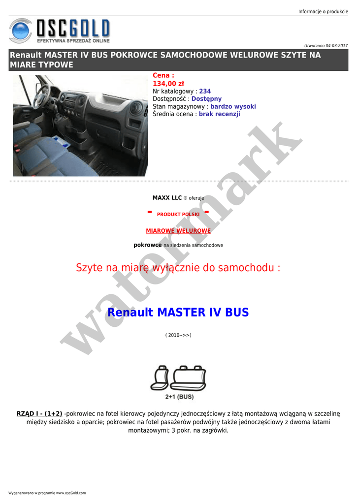 Informacje o produkcie Utworzono 04-03-2017 Renault MASTER IV BUS POKROWCE SAMOCHODOWE WELUROWE SZYTE NA MIARE TYPOWE Cena : 134,00 zł er m ar k Nr katalogowy : 234 Dostępność : Dostępny Stan magazynowy : bardzo wysoki Średnia ocena : brak recenzji MAXX LLC ® oferuje - PRODUKT POLSKI - MIAROWE WELUROWE pokrowce na siedzenia samochodowe at Szyte na miarę wyłącznie do samochodu : w Renault MASTER IV BUS ( 2010-->>) RZĄD I - (1+2) -pokrowiec na fotel kierowcy pojedynczy jednoczęściowy z łatą montażową wciąganą w szczelinę między siedzisko a oparcie; pokrowiec na fotel pasażerów podwójny także jednoczęściowy z dwoma łatami montażowymi; 3 pokr. na zagłówki. Wygenerowano w programie www.oscGold.com KOMPLET ZAWIERA - komplet pokrowców na przednie fotele - pokrowce na zagłówki - haczyki oraz inne elementy montażowe - instrukcję montażu w at er m ar k Pokrowce oferowane przez nas posiadają atest bezpieczeństwa na poduszki powietrzne AIRBAG Przemysłowego Instytutu Motoryzacji (PIMOT) w Warszawie. Posiadają one specjalne szycie po stronie poduszki powietrznej, oznaczone wszywką z napisem "airbag", dzięki czemu poduszki bez najmniejszego problemu będą mogły wystrzelić gdy zajdzie taka potrzeba. Dzięki czemu przystosowane są do samochodów zarówno z bocznymi poduszkami powietrznymi w fotelach, jak i do standardowych siedzeń. er m ar k Informacje o produkcie Pokrowce wykonane są z wysokiej jakości weluru dodatkowo laminowanego pianką poliuretanową oraz podszewką co zapobiega wykruszaniu się gąbki i ułatwia zakładanie Boczki foteli, zagłówki oraz plecy wykonane są z grubej dzianiny poliestrowej koloru ciemno grafitowego, w całości laminowanej pianką, w at w miejscach szczególnie podatnych na przetarcia dodatkowo wzmocnione podszewką. Wygenerowano w programie www.oscGold.com er m ar k at w Informacje o produkcie er m ar k Pokrowce są bardzo solidnie wykończone, otwory do regulacji foteli, lub pod zagłówki i pasy bezpieczeństwa są wycięte, obszyte i dopasowane pod każdy model indywidualnie. at Po dokładnym montażu naszych pokrowców uzyskujemy efekt praktycznie nie odróżniający się od orginalnej tapicerki co zresztą widać na powyższych zdjęciach. w W trzech wzorach: Wygenerowano w programie www.oscGold.com er m ar k at w w at er m ar k Informacje o produkcie Wygenerowano w programie www.oscGold.com er m ar k at w