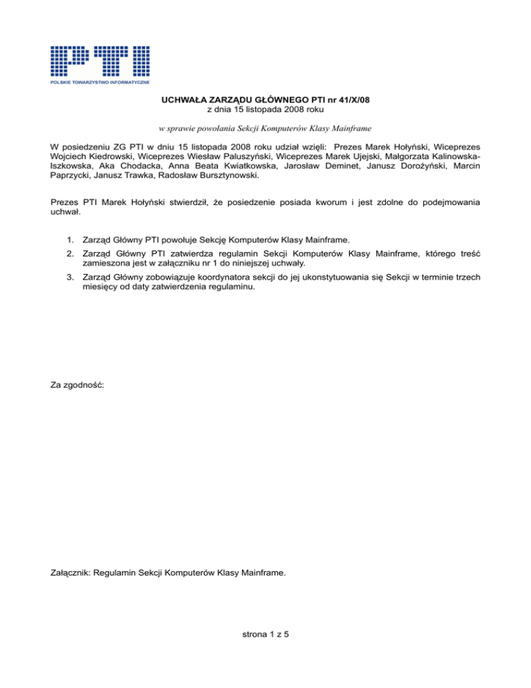 UCHWAŁA ZARZĄDU GŁÓWNEGO PTI nr 41/X/08 z dnia 15 listopada 2008 roku w sprawie powołania Sekcji Komputerów Klasy Mainframe W posiedzeniu ZG PTI w dniu 15 listopada 2008 roku udział wzięli: Prezes Marek Hołyński, Wiceprezes Wojciech Kiedrowski, Wiceprezes Wiesław Paluszyński, Wiceprezes Marek Ujejski, Małgorzata KalinowskaIszkowska, Aka Chodacka, Anna Beata Kwiatkowska, Jarosław Deminet, Janusz Dorożyński, Marcin Paprzycki, Janusz Trawka, Radosław Bursztynowski. Prezes PTI Marek Hołyński stwierdził, że posiedzenie posiada kworum i jest zdolne do podejmowania uchwał. 1. Zarząd Główny PTI powołuje Sekcję Komputerów Klasy Mainframe. 2. Zarząd Główny PTI zatwierdza regulamin Sekcji Komputerów Klasy Mainframe, którego treść zamieszona jest w załączniku nr 1 do niniejszej uchwały. 3. Zarząd Główny zobowiązuje koordynatora sekcji do jej ukonstytuowania się Sekcji w terminie trzech miesięcy od daty zatwierdzenia regulaminu. Za zgodność: Załącznik: Regulamin Sekcji Komputerów Klasy Mainframe. strona 1 z 5 Załącznik nr 1 do uchwały Zarządu Głównego PTI nr 41/X/08 Regulamin Sekcji Komputerów Klasy Mainframe. Regulamin Sekcji Na wrześniowym posiedzeniu ZG PTI przyjęto następujący REGULAMIN Sekcji Komputerów Klasy Mainframe regulamin ten został opracowany przez kol. G. Plucińskiego na podstawie wzorca, dostarczonego przez kol. A. Niemca regulaminu SBI (dziękujemy!), a ten z kolei był wzorowany na regulaminie dostarczonym przez kol. J. Nowaka (dziękujemy) Postanowienia ogólne. §1 Sekcja prowadzi działalność w oparciu o statut Polskiego Towarzystwa Informatycznego oraz niniejszy Regulamin. §2 Sekcja nosi nazwę “Sekcja Komputerów Klasy Mainframe” (w dalszej części regulaminu „Sekcja KKM”). §3 Sekcja KM może współpracować z krajowymi lub zagranicznymi organizacjami o podobnym profilu działania, w zakresie uzgodnionym z Zarządem Głównym PTI. Cele i środki działania. §4 Celami działania Sekcji KKM są: Wymiana doświadczeń i informacji sprzyjających zapewnieniu szeroko pojętej popularyzacji komputerów mainframe Wspomaganie rozwoju gospodarczego, w tym rozwoju przedsiębiorczości, oraz nauki i edukacji. Popularyzacja architektury komputerów mainframe Propagowanie nowych, innowacyjnych rozwiązań dla platformy mainframe Kształcenie kadr §5 Powyższe cele Sekcja KKM realizuje przez: Promowanie nowoczesnych technologii i rozwiązań związanych z KKM. Organizowanie konferencji tematycznych dotyczących KKM i obejmowanie patronatem konferencji o takiej tematyce. strona 2 z 5 Organizowanie odczytów, szkoleń, stażów z zakresu projektowania systemów zarządzania systemów informatycznych opartych o KKM. Stworzenie i utrzymywanie platformy informatycznej, przeznaczonej dla członków Sekcji KKM, służącej prezentacji wiedzy oraz ułatwiającej wymianę doświadczeń z zakresu KKM. Ułatwianie współpracy użytkowników z firmami oferującymi rozwiązania z zakresu KKM. zachęcanie członków sekcji do promocji usług Izby Rzeczoznawców PTI obejmujących opracowywanie ekspertyz, opinii i stanowisk w zakresie KKM. Opracowywanie i upowszechnianie minimalnych wymagań dla szkoleń z zakresu KKM. Opracowanie systemu certyfikacji szkoleń z zakresu KM, gwarantujących poziom wiedzy oraz jakość kształcenia. Dla celów edukacji, szkoleń i certyfikacji Sekcja KKM używać będzie nazwy „Mainframe Academy” §6 Sekcja KKM bierze aktywny udział w innych działaniach Towarzystwa zmierzających do osiągania statutowych celów PTI. Członkowie, ich prawa i obowiązki. §7 1. Członkami Sekcji mogą być: Osoby prawne Członkowie wspierający PTI Przedsiębiorstwa i inne instytucje zainteresowane zagadnieniami KKM Osoby fizyczne działalności sekcji członkowie zwyczajni PTI i inne osoby zainteresowane zakresem 2. Przyjęcie na członka Sekcji KM odbywa się po zgłoszeniu zainteresowania pracami w sekcji i zarejestrowaniu na witrynie internetowej Sekcji. 3. Inne sprawy związane z członkostwem w Sekcji reguluje statut PTI. Organizacja pracy i władze Sekcji KKM. §8 1. Pracą Sekcji KM kieruje jego Zarząd, w skład którego wchodzą: przewodniczący, zastępca przewodniczącego, sekretarz, członkowie zarządu. 2. Liczebność Zarządu nie może być mniejsza niż dwie osoby. strona 3 z 5 3. Członkami założycielami Sekcji są (w kolejności alfabetycznej): 1. Anna Cetnarowicz-Jutkiewicz 2. Janusz Dorożyński 3. Jerzy Kurowski 4. Zbigniew Maryniak 5. Andrzej Niemiec 6. Grzegorz Pluciński 7. Ryszard Jurczak 8. Michał Wolański §9 1. Kadencja pierwszego zarządu trwa pół roku. Pierwszy zarząd wybierany jest przez członków założycieli sekcji. 2. Kadencja zarządu trwa trzy lata. W przypadku rezygnacji osoby ze składu zarządu w trakcie kadencji, zarząd może zorganizować wybór uzupełniający, przeprowadzany na tych samych zasadach, jak w przypadku wyboru Zarządu. 3. Zarząd Sekcji KKM jest wybierany zwykłą większością głosów na ogólnym zebraniu członków Sekcji KKM, przy udziale co najmniej połowy ogólnej liczby członków. Dopuszczalne jest przeprowadzenie wyborów za pomocą środków elektronicznych. § 10 1. Ukonstytuowanie się zarządu następuje na pierwszym posiedzeniu, bezpośrednio po wyborach. Przewodniczącym Zarządu Sekcji zostaje osoba, która w wyborach uzyskała największą liczbę głosów. 2. Przewodniczący Zarządu Sekcji rekomenduje Zarządowi osobę na stanowisko swego Zastępcy. Decyzja w sprawie wyboru Zastępcy Prezesa zapada zwykłą większością głosów. 3. Zmiana funkcji członków zarządu w trakcie trwania kadencji może nastąpić na posiedzeniu zarządu, przy obecności co najmniej połowy składu zarządu i w obecności przedstawiciela Zarządu Głównego PTI. Decyzje w tej sprawie zapadają zwykłą większością głosów. § 11 Posiedzenia zarządu Sekcji KKM są zwoływane w miarę potrzeby i mogą być prowadzone także za pomocą elek