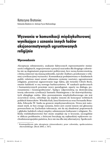 Katarzyna Brataniec Krakowska Akademia im. Andrzeja Frycza Modrzewskiego Wyzwania w komunikacji międzykulturowej wynikające z uznania innych ładów aksjonormatywnych ugruntowanych religijnie Wprowadzenie Akceptacja odmienności, szukanie faktycznych reprezentantów mniejszości religijnych, negocjowanie z pozycji szacunku dla drugiego człowieka nie są dogmatami poprawności politycznej, lecz nową koniecznością, z którą zmierzyć się muszą jednostki, narody i kultury, przekonane o własnej cywilizacyjnej wyższości. Komunikacja podejmowana w działaniach public relations musi uznać odmienne systemy wartości, ugruntowane religijnie, ponieważ zignorowanie tego faktu, jak twierdzi Ulrich Beck, osunie ludzkość w erę nowego barbarzyństwa. W naukach społecznych i humanistycznych powstaje nowy paradygmat, oparty na dialogu, porozumieniu i kosmopolityzmie1, będący odpowiedzią na destrukcyjną teorię zderzenia cywilizacji Samuela Huntingtona z lat dziewięćdziesiątych ubiegłego wieku. Idea porozumienia międzykulturowego nie jest oczywiście nowa, odwołuje się między innymi do koncepcji wybitnych polskich historyków: Witolda Kuli, Jana Kieniewicza oraz Fernanda Braudela, Edwarda W. Saida na gruncie międzynarodowym. Nowa jest natomiast myśl, że bez owego uznania, które jest czymś innym niż głoszona powszechnie na Zachodzie tolerancja, nie da się zbudować poprawnych i głęboko ludzkich relacji między odmiennymi kulturami i religiami. Polityka wielokulturowości być może znajduje się w kryzysie, szczególnie w obliczu problemów, z którymi borykają się najbardziej wpływowe zachodnioeuropejskie państwa, lecz nie ma dla niej alternatywy. Społeczeń1 Kosmopolityzm jako akceptacja różnorodności, praw człowieka, społeczeństwa obywatelskiego. [Beck 2005, s. 347]. PIECHOTA - PR.indb 19 2013-03-11 12:44:55 20 Katarzyna Brataniec stwa zachodnie muszą ożywić ideę współżycia kultur w Europie i dokonać rozróżnienia między procesami integracji i asymilacji [Kula 2011, s. 60]. Powinny także zdefiniować w nowym duchu wszelkie działania public relations jako tych, które mogą wprowadzić w życie idee postrzegania rzeczywistości oczami Innego i zaproponować społeczeństwu formułę uznania dla różnych tradycji etnicznych, narodowych i przede wszystkim religijnych. Rozważania akademickie i przekonania, które istnieją wyłącznie jako koncepcje teoretyczne, nie zmienią postaw ludzkich. Jedynie przemyślane i spójne działania ze strony instytucji, ruchów społecznych i organizacji są władne dzięki długotrwałej perswazji wpłynąć na opinię publiczną. Organizacje i instytucje public relations w naszym kraju powinny określić jasno swój cel jako misję o charakterze publicznym, mającą wprowadzić społeczeństwo w erę nowoczesności pojmowanej jako otwarcie na Innych. Migracja do Polski z państw muzułmańskich nie jest jeszcze zbyt liczna, mamy jednak do czynienia z uchodźcami z Czeczenii i Iraku. Wkrótce zmierzymy się z imigrantami z Afganistanu. Nie jest to tylko problem rządu i jego polityki zagranicznej. Dotyczy stosunku społeczeństwa polskiego do szeroko pojmowanych Innych. Proces ten jasno pokazuje kierunek zmian: muzułmanie staną się naszymi sąsiadami, a islam religią, która powinniśmy uszanować. Tymczasem jak wskazują dane z badań opinii publicznej w Polsce, które zostaną zinterpretowane w ostatnim rozdziale nie jesteśmy na to przygotowani, ani moralnie, ani obywatelsko. Pojawia się więc pytanie, czy organizacje public relations podejmą to wyzwanie i stworzą odpowiednie instrumenty do wdrażania programu zrozumienia i tolerancji wobec wyznawców islamu. Program ten powinien być zintegrowany z działaniami mediów, polityków i edukacją dzieci i młodzieży. Globalizacja a komunikacja międzykulturowa W ujęciu Rolanda Robertsona globalizacja oznacza intensywne „kurczenie się świata”. Globalizacja przejawia się w stale rosnącej liczbie globalnych powiązań i zaistnieniu w świadomości społecznej rozumienia tego nowego stanu rzeczy [Robertson 1992, s. 189]. „Kurczenie się świata” odnosi się do przedstawionych przez Giddensa instytucji nowoczesności: kapitalizmu, industrializmu, systemu nadzoru, państwa narodowego i władzy wojskowej, ponieważ owe instytucje zdolne są do działania w skali globalnej. Umożliwiają także rozdzielenie czasoprzestrzeni oraz wyniesienie stosunków społecznych z danej lokalizacji i ich ponowne osadzenie w zupełnie innej i wybranej dowolnie rzeczywistości, zgod- PIECHOTA - PR.indb 20 2013-03-11 12:44:55 Wyzwania w komunikacji międzykulturowej… 21 nie z reprezentowanymi przez nie interesami. Dzięki rozdzieleniu czasu, miejsca i przestrzeni pojawiła się nowa forma stosunków społecznych, która nie wymaga obecności uczestników w tym samym czasie i miejscu. Wraz z nimi powstały nowe formy komunikacji i kontroli informacji, odnoszą się one nie tylko do sfery ekonomicznej i politycznej. Globalny przepływ kulturowy uwarunkował także nowe ujęcie kultury, wykraczające poza określone miejsce i konkretną społeczność. Kultura zatem to otwarta i skierowana na zewnątrz całość, a tożsamość zbiorowa wyrosła na gruncie tak rozumianej kultury ma charakter hybrydyczny, mieszany i względny. Zatem nie można jej określać za pomocą starych pojęć i kategorii: ciągłości tradycji, jednorodności kultury, autentyczności [Clifford 2000, s. 17]. Relacje między kulturami w świetle tego rozumienia oddają raczej krzyżujące się sieci niż odgraniczone od siebie terytoria. Do zrozumienia danej formy kultury lub jej elementu nie wystarczy już umiejscowienie go w tej strukturze kulturowej. Ważniejsze jest uwzględnienie relacji tego elementu w stosunku do innych sieci kulturowych. Znaczna część wzorów kultury w wyniku wzajemnych wpływów posiada status hybrydy kulturowej. Dlatego relacje międzykulturowe są oparte na prz