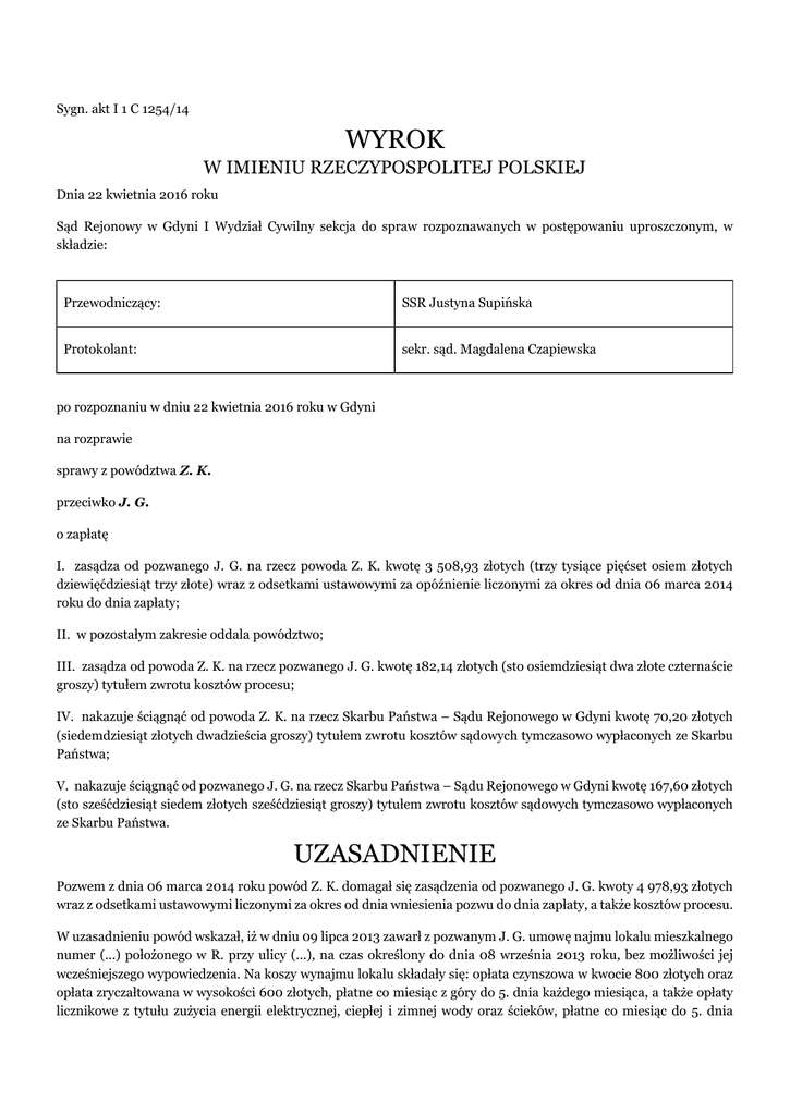 Sygn. akt I 1 C 1254/14 WYROK W IMIENIU RZECZYPOSPOLITEJ POLSKIEJ Dnia 22 kwietnia 2016 roku Sąd Rejonowy w Gdyni I Wydział Cywilny sekcja do spraw rozpoznawanych w postępowaniu uproszczonym, w składzie: Przewodniczący: SSR Justyna Supińska Protokolant: sekr. sąd. Magdalena Czapiewska po rozpoznaniu w dniu 22 kwietnia 2016 roku w Gdyni na rozprawie sprawy z powództwa Z. K. przeciwko J. G. o zapłatę I. zasądza od pozwanego J. G. na rzecz powoda Z. K. kwotę 3 508,93 złotych (trzy tysiące pięćset osiem złotych dziewięćdziesiąt trzy złote) wraz z odsetkami ustawowymi za opóźnienie liczonymi za okres od dnia 06 marca 2014 roku do dnia zapłaty; II. w pozostałym zakresie oddala powództwo; III. zasądza od powoda Z. K. na rzecz pozwanego J. G. kwotę 182,14 złotych (sto osiemdziesiąt dwa złote czternaście groszy) tytułem zwrotu kosztów procesu; IV. nakazuje ściągnąć od powoda Z. K. na rzecz Skarbu Państwa – Sądu Rejonowego w Gdyni kwotę 70,20 złotych (siedemdziesiąt złotych dwadzieścia groszy) tytułem zwrotu kosztów sądowych tymczasowo wypłaconych ze Skarbu Państwa; V. nakazuje ściągnąć od pozwanego J. G. na rzecz Skarbu Państwa – Sądu Rejonowego w Gdyni kwotę 167,60 złotych (sto sześćdziesiąt siedem złotych sześćdziesiąt groszy) tytułem zwrotu kosztów sądowych tymczasowo wypłaconych ze Skarbu Państwa. UZASADNIENIE Pozwem z dnia 06 marca 2014 roku powód Z. K. domagał się zasądzenia od pozwanego J. G. kwoty 4 978,93 złotych wraz z odsetkami ustawowymi liczonymi za okres od dnia wniesienia pozwu do dnia zapłaty, a także kosztów procesu. W uzasadnieniu powód wskazał, iż w dniu 09 lipca 2013 zawarł z pozwanym J. G. umowę najmu lokalu mieszkalnego numer (...) położonego w R. przy ulicy (...), na czas określony do dnia 08 września 2013 roku, bez możliwości jej wcześniejszego wypowiedzenia. Na koszy wynajmu lokalu składały się: opłata czynszowa w kwocie 800 złotych oraz opłata zryczałtowana w wysokości 600 złotych, płatne co miesiąc z góry do 5. dnia każdego miesiąca, a także opłaty licznikowe z tytułu zużycia energii elektrycznej, ciepłej i zimnej wody oraz ścieków, płatne co miesiąc do 5. dnia każdego następnego miesiąca. Powód wskazał również, iż pozwany wpłacił powodowi kaucję w kwocie 1 000 złotych, a nadto, że w wynajmowanym lokalu mieszkali pracownicy (...) spółki z ograniczoną odpowiedzialnością z siedzibą G. i opuścili oni lokal po upływie zastrzeżonego w umowie terminu. W dniu 29 września 2013 roku powód wraz z K. Ż. i T. C. dokonali komisyjnego odbioru lokalu ustalając, iż w lokalu zostały uszkodzone jedynie panele (przy wejściu do salonu po lewej stronie). Pismem procesowym z datą w nagłówku „dnia 28 lipca 2014 roku” (data prezentaty: 2014-08-04, k. 31-32 akt) powód sprecyzował, iż na dochodzoną w niniejszym postępowaniu kwotę składają się: kwota 2 800 złotych (z tytułu opłaty czynszowej i opłaty zryczałtowanej za miesiąc lipiec i sierpień 2013 roku), kwota 283,47 złotych z tytułu należności za zużycie mediów za miesiąc lipiec 2013 roku, kwota 208,64 złotych z tytułu należności za zużycie mediów za miesiąc sierpień 2013 roku, kwota 142,22 złotych z tytułu należności za zużycie mediów za miesiąc wrzesień 2013 roku, kwota 74,60 złotych z tytułu opłaty za odświeżenie mieszkania, która to kwota wynika z potrącenia przez powoda kaucji w kwocie 1 000 złotych z należnościami z tytułu wykonanej przez powoda na rzecz pozwanego wymiany pościeli – 200 złotych (10 sztuk po 20 złotych), jednokrotnej usługi sprzątania w kwocie 24,60 złotych, należności za uszkodzone panele w kwocie 150 złotych oraz z pozostałej części kaucji – kwoty 625,40 złotych (z kwoty 700 złotych z tytułu odświeżenia lokalu) oraz kwota 1 470 złotych z tytułu odszkodowania za brak wydania lokalu na dzień zakończenia umowy i bezumowne zajmowanie lokalu przez okres od dnia 09 września do dnia 29 września 2013 roku (21 dni po 70 złotych). W odpowiedzi na pozew pozwany J. G. przyznał, iż zawarł z powodem Z. K. umowę najmu przedmiotowego lokalu numer (...), z tym, że podniósł, iż umowa ta została zawarta przez niego jako pracownika (...) spółki z ograniczoną odpowiedzialnością z siedzibą w G., w której jako dyrektor do spraw technicznych działał w imieniu i na rzecz tej spółki. Nadto, pozwany wskazał, że wynajmowany lokal mieszkalny został opuszczony w dniu 08 września 2013 roku, powód zaś jako datę zajmowania lokalu po upływie określonego w umowie terminu wskazuje datę, w której dokonał komisyjnego odebrania lokalu (w dniu 29 września 2013 roku), podczas gdy pracownicy pozwanego zabrali swoje rzeczy i zwrócili klucze do mieszkania pracownikowi powoda, zaś powód nie informował najemcy o konieczności przeprowadzenia odbioru lokalu. O facie, że lokal numer (...) nie był zajmowany przez pracowników (...) spółki z ograniczoną odpowiedzialnością z siedzibą w G. w ocenie pozwanego świadczy również fakt, że zużycie mediów w miesiącu wrześniu 2013 roku było znacznie niższe niż w poprzednich miesiącach, co wynikało z tego, że lokal był użytkowany tylko przez pierwsze dni września 2013 roku. Pozwany J. G. zakwestionował także zasadność żądania kwoty 700 złotych za odświeżenie mieszkania, gdyż powód nie wykazał, iż po zakończeniu najmu mieszkanie wymagało malowania, czy innego remontu. Nadto pozwany uznał za uzasadnione potrącenie z wpłaconej przez niego kaucji w kwocie 1 000 złotych kosztu wymiany pościeli, sprzątania i wymiany uszkodzonych paneli. Jednocześnie pozwany wskazał, iż czynsz został zapłacony w całości, albowiem (...) spółka z ograniczoną odpowiedzialnością z siedzibą w G. wynajmowała od powoda sześć lokali mieszkalnych i rozliczała się z nich łącznie. Powód wystawił pozwanemu faktury na łączną kwotę 15