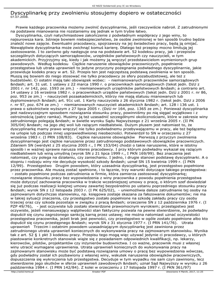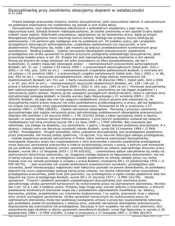 KZ NSZZ Solidarność przy IC we Wrocławiu Dyscyplinarkę przy zwolnieniu stosujemy dopiero w ostateczności 07.07.2008. Prawie każdego pracownika możemy zwolnić dyscyplinarnie, jeśli rzeczywiście nabroił. Z zatrudnionymi na podstawie mianowania nie rozstaniemy się jednak w tym trybie łatwo. Dyscyplinarka, czyli natychmiastowe zakończenie z podwładnym współpracy z jego winy, to najsurowsza kara. Istnieje bowiem niebezpieczeństwo, że osobie zwolnionej w ten sposób trudno będzie znaleźć nowe zajęcie. Ewentualni pracodawcy, spojrzawszy na jej świadectwo pracy, będą ją omijać. Niewątpliwie dyscyplinarka może zwichnąć komuś karierę. Dlatego też przepisy mocno limitują jej zastosowanie. I to zarówno gdy następuje ona na podstawie art. 52 kodeksu pracy, jak i przepisów szczególnych dotyczących samorządowców, urzędników państwowych czy nauczycieli, w tym akademickich. Przyjrzyjmy się, kiedy i jak możemy ją wręczyć przedstawicielom wymienionych grup zawodowych. Według kodeksu Ciężkie naruszenie obowiązków pracowniczych, popełnienie przestępstwa lub utrata uprawnień to jedyne przyczyny pożegnania podwładnego dyscyplinarnie, jakie przewiduje kodeks pracy w art. 52. Przepis ten jest najczęstszą podstawą zwolnienia w ten sposób. Muszą się bowiem do niego stosować nie tylko pracodawcy ze sfery pozabudżetowej, ale też z budżetówki. Ci ostatni mają taki obowiązek wobec: - niemianowanych pracowników samorządowych – art. 31 ust. 1 ustawy z 22 marca 1990 r. o pracownikach samorządowych (tekst jedn. DzU z 2001 r. nr 142, poz. 1593 ze zm.) - niemianowanych urzędników państwowych – a contrario art. 14 ustawy z 16 września 1982 r. o pracownikach urzędów państwowych (tekst jedn. DzU z 2001 r. nr 86, poz. 953 ze zm.) - nauczycieli pozaakademickich, którzy nie mają statusu mianowanych lub dyplomowanych – art. 91c ust. 1 Karty nauczyciela z 26 stycznia 1982 r. (tekst jedn. DzU z 2006 r. nr 97, poz. 674 ze zm.) - niemianowanych nauczycieli akademickich – art. 128 i 136 ust. 1 prawa o szkolnictwie wyższym z 27 lipca 2005 r. (DzU nr 164, poz. 1365 ze zm.) Ponieważ dyscyplinarka jest nadzwyczajnym sposobem rozwiązania stosunku pracy, powinniśmy po nią sięgać wyjątkowo i z ostrożnością (patrz ramka). Musimy ją też uzasadnić szczególnymi okolicznościami, które w zakresie winy zatrudnionego polegają – w świetle wyroku Sądu Najwyższego z 21 września 2005 r. (II PK 305/04) – na jego złej woli lub rażącym niedbalstwie. Dużym plusem jest natomiast to, że dyscyplinarkę mamy prawo wręczyć nie tylko podwładnemu przebywającemu w pracy, ale też będącemu na urlopie lub podczas innej usprawiedliwionej nieobecności. Potwierdził to SN w orzeczeniu z 27 września 1983 r. (I PRN 108/83). Ciężkie naruszenie obowiązków Pierwszą z przyczyn zwolnienia dyscyplinarnego jest ciężkie naruszenie przez zatrudnionego podstawowych obowiązków pracowniczych. Zdaniem SN (werdykt z 25 stycznia 2005 r., I PK 153/04) chodzi o takie naruszenie, które w istotny sposób i w ważnej sprawie narusza interes pracodawcy. I przy którym podwładny wykazał się rażącym niedbalstwem lub winą umyślną (wyrok SN z 21 lipca 1999 r., I PKN 169/99). Bez znaczenia jest natomiast, czy polega na działaniu, czy zaniechaniu. I jedno, i drugie stanowi podstawę dyscyplinarki. A o stopniu i rodzaju winy nie decyduje wysokość szkody – uznał SN 15 kwietnia 1999 r. (I PKN 12/99). Przestępstwo Drugim powodem, który uzasadnia dyscyplinarkę, jest przestępstwo popełnione przez pracownika. Ale muszą zostać spełnione, i to łącznie, trzy warunki dotyczące takiego przestępstwa: - zostało popełnione podczas zatrudnienia w firmie, która zamierza zastosować dyscyplinarkę; rozwiązanie stosunku pracy bez wypowiedzenia z winy pracownika z powodu popełnienia przestępstwa może dotyczyć zachowania pracownika w trakcie wcześniejszej umowy o pracę, o którym szef dowiedział się już podczas realizacji kolejnej umowy zawartej bezpośrednio po ustaniu poprzedniego stosunku pracy – wyrok SN z 12 listopada 2003 r. (I PK 625/02), - uniemożliwia dalsze zatrudnianie tej osoby na zajmowanym dotychczas stanowisku, np. księgowa zostaje skazana za fałszowanie dokumentów; nie ma w takiej sytuacji znaczenia, czy przestępstwo zostało popełnione na szkodę zakładu pracy czy osoby trzeciej oraz czy szkoda pozostaje w związku z pracą – orzeczenie SN z 12 października 1976 r. (I PZP 49/76), - jest oczywiste lub zostało stwierdzone prawomocnym wyrokiem; przestępstwo jest oczywiste, jeżeli nienasuwający wątpliwości stan faktyczny pozwala na pewne stwierdzenie, że podwładny dopuścił się czynu zagrożonego sankcją karną przez ustawę; nie można natomiast uznać oczywistości przestępstwa pracownika, jeżeli brak jest pewności, czy przestępstwo w ogóle zostało popełnione albo kto dopuścił się czynu przestępnego – wyrok SN z 31 stycznia 1977 r. (I PRN 141/76). Utrata uprawnień Trzecim i ostatnim powodem uzasadniającym dyscyplinarkę jest zawiniona przez zatrudnionego utrata uprawnień koniecznych do wykonywania pracy na zajmowanym stanowisku. Wynika tak z art. 52 § 1 pkt 3 kodeksu pracy. Przepisu tego mogą więc używać jedynie ci pracodawcy, u których piastowanie konkretnych stanowisk wiąże się z posiadaniem odpowiednich kwalifikacji, np. lekarzy, kierowców, pilotów, projektantów czy inżynierów budownictwa. I co ważne, pracownik musi z własnej winy utracić wymagane uprawnienia. Utrata uprawnień koniecznych do wykonywania pracy na zajmowanym stanowisku może być podstawą rozwiązania umowy o pracę bez wypowiedzenia wówczas, gdy podwładny został ich pozbawiony z własnej winy, wskutek naruszenia obowiązków pracowniczych, dopuszczenia się wykroczenia lub przestępstwa. Decyduje w tym wypadku nie sam czyn zawiniony, lecz stwierdzenie jego skutków w sferze uprawnień zawodowych 