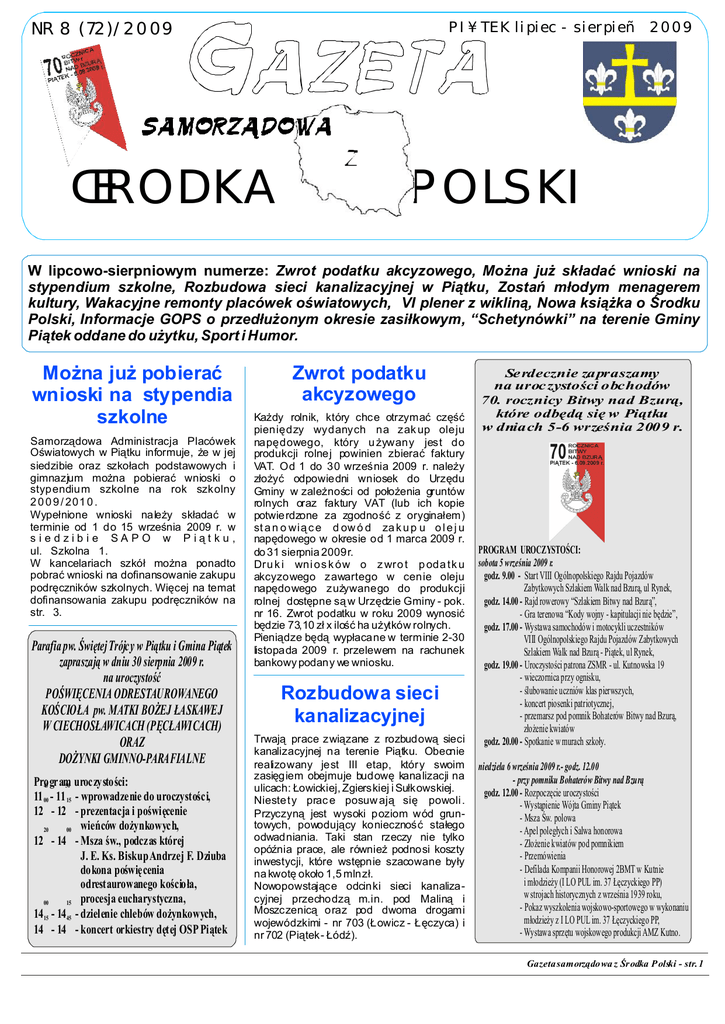 PI¥TEK lipiec - sierpieñ NR 8 (72)/2009 ŒRODKA z 2009 POLSKI W lipcowo-sierpniowym numerze: Zwrot podatku akcyzowego, Mo na ju sk ada wnioski na stypendium szkolne, Rozbudowa sieci kanalizacyjnej w Pi tku, Zosta odym menagerem kultury, Wakacyjne remonty placówek o wiatowych, VI plener z wiklin , Nowa ksi ka o rodku Polski, Informacje GOPS o przed onym okresie zasi kowym, “Schetynówki” na terenie Gminy Pi tek oddane do u ytku, Sport i Humor. Mo na ju pobiera wnioski na stypendia szkolne Samorz dowa Administracja Placówek wiatowych w Pi tku informuje, e w jej siedzibie oraz szko ach podstawowych i gimnazjum mo na pobiera wnioski o stypendium szkolne na rok szkolny 2 0 0 9 / 201 0 . Wype nione wnioski nale y sk ada w terminie od 1 do 15 wrze nia 2009 r. w siedzibie SAPO w Pi tku, ul. Szkolna 1. W kancelariach szkó mo na ponadto pobra wnioski na dofinansowanie zakupu podr czników szkolnych. Wi cej na temat dofinansowania zakupu podr czników na str. 3. Parafia pw. wi tejTrójcy w Pi tku i Gmina Pi tek zapraszaj w dniu 30 sierpnia 2009 r. na uroczysto PO WI CENIA ODRESTAUROWANEGO KO CIO A pw. MATKI BO EJ ASKAWEJ W CIECHOS AWICACH (P AWICACH) ORAZ DO YNKI GMINNO-PARAFIALNE Program 40 50 uroczysto ci: 11 00 - 11 15 - wprowadzenie do uroczysto ci, 12 - 12 - prezentacja i po wi cenie 20 00 wie ców do ynkowych, 12 - 14 - Msza w., podczas której J. E. Ks. BiskupAndrzej F. Dziuba dokona po wi cenia odrestaurowanego ko cio a, 00 15 procesja eucharystyczna, 1415 - 1445 - dzielenie chlebów do ynkowych, 14 - 14 - koncert orkiestry d tej OSP Pi tek Zwrot podatku akcyzowego Ka dy rolnik, który chce otrzyma cz pieni dzy wydanych na zak up oleju nap dowego, który u ywany jest do produkcji rolnej powinien zbiera faktury VAT. Od 1 do 30 wrze nia 2009 r. nale y odpowiedni wniosek do Urz du Gminy w zale no ci od po enia gruntów rolnych oraz faktury VAT (lub ich kopie potwierdzone za zgodno z orygina em) st a n o wi c e d ow ó d za k u p u o l e j u nap dowego w okresie od 1 marca 2009 r. do 31 sierpnia 2009r. Dru k i wni os k ów o z wro t p oda tk u akcyzowego zawartego w cenie oleju nap dowego zu ywanego do produkcji rolnej dost pne s w Urz dzie Gminy - pok. nr 16. Zwrot podatku w roku 2009 wynosi dzie 73,10 z x ilo ha u ytków rolnych. Pieni dze b wyp acane w terminie 2-30 listopada 2009 r. przelewem na rachunek bankowy podany we wniosku. Rozbudowa sieci kanalizacyjnej Trwaj prace zwi zane z rozbudow sieci kanalizacyjnej na terenie Pi tku. Obecnie realizowany jest III etap, który swoim zasi giem obejmuje budow kanalizacji na ulicach: owickiej, Zgierskiej i Su kowskiej. Niestety prac e posuw aj si powoli . Przyczyn jest wysoki poziom wód gruntowych, powoduj cy konieczno sta ego odwadniania. Taki stan rzeczy nie tylko opó nia prace, ale równie podnosi koszty inwestycji, które wst pnie szacowane by y na kwot oko o 1,5 mlnz . Nowopowstaj ce odcinki sieci kanalizacyjnej przechodz m.in. pod Malin i Moszczenic oraz pod dwoma drogami wojewódzkimi - nr 703 ( owicz czyca) i nr 702 (Pi tek- ód ). Se rdecznie zapraszamy na uroc zysto ci obchodów 70. rocznicy Bitwy nad Bzur , które odb si w Pi tku w dniach 5-6 wrze nia 2009 r. PROGRAM UROCZYSTO CI: sobota 5 wrze nia 2009 r. godz. 9.00 - Start VIII Ogólnopolskiego Rajdu Pojazdów Zabytkowych Szlakiem Walk nad Bzur , ul Rynek, godz. 14.00 - Rajd rowerowy “Szlakiem Bitwy nad Bzur ”, - Gra terenowa “Kody wojny - kapitulacji nie b dzie”, godz. 17.00 - Wystawa samochodów i motocykli uczestników VIII Ogólnopolskiego Rajdu Pojazdów Zabytkowych Szlakiem Walk nad Bzur - Pi tek, ul Rynek, godz. 19.00 - Uroczysto ci patrona ZSMR - ul. Kutnowska 19 - wieczornica przy ognisku, lubowanie uczniów klas pierwszych, - koncert piosenki patriotycznej, - przemarsz pod pomnik Bohaterów Bitwy nad Bzur , enie kwiatów godz. 20.00 - Spotkanie w murach szko y. niedziela 6 wrze nia 2009 r.- godz. 12.00 - przy pomniku Bohaterów Bitwy nad Bzur godz. 12.00 - Rozpocz cie uroczysto ci - Wyst pienie Wójta Gminy Pi tek - Msza w. polowa - Apel poleg ych i Salwa honorowa - Z enie kwiatów pod pomnikiem - Przemówienia - Defilada Kompanii Honorowej 2BMT w Kutnie i m odzie y (I LO PUL im. 37 czyckiego PP) w strojach historycznych z wrze nia 1939 roku, - Pokaz wyszkolenia wojskowo-sportowego w wykonaniu odzie y z I LO PUL im. 37 czyckiego PP, - Wystawa sprz tu wojskowego produkcji AMZ Kutno. Gazetasamorz dowa z rodka P olski - str. 1