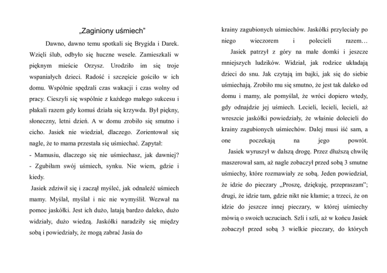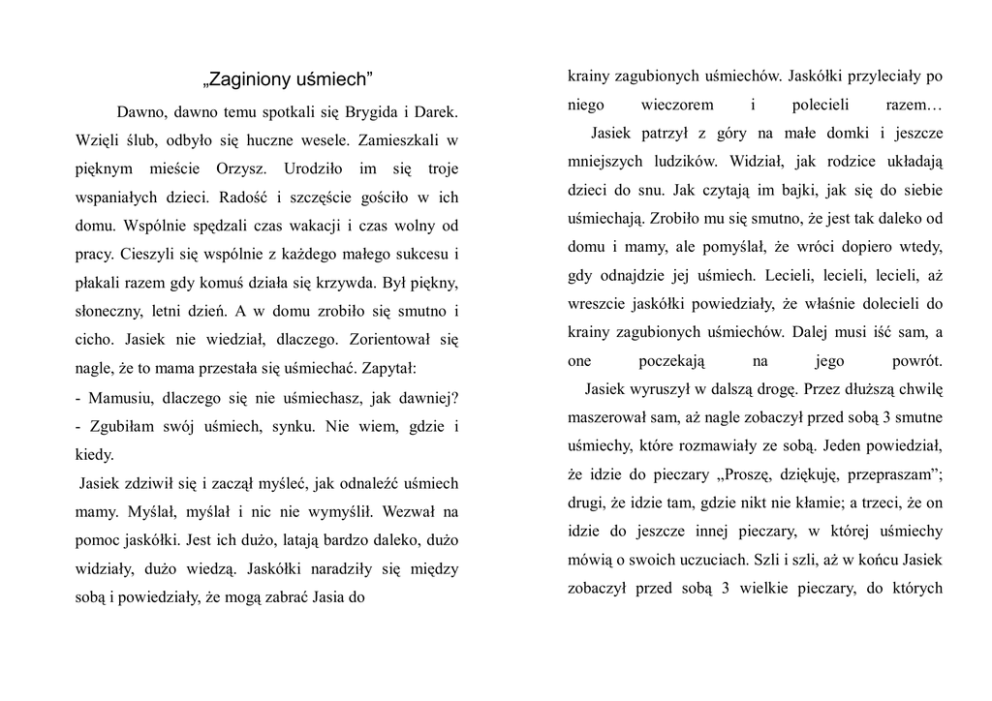 krainy zagubionych uśmiechów. Jaskółki przyleciały po „Zaginiony uśmiech” Dawno, dawno temu spotkali się Brygida i Darek. niego wieczorem i polecieli razem… Jasiek patrzył z góry na małe domki i jeszcze Wzięli ślub, odbyło się huczne wesele. Zamieszkali w troje mniejszych ludzików. Widział, jak rodzice układają wspaniałych dzieci. Radość i szczęście gościło w ich dzieci do snu. Jak czytają im bajki, jak się do siebie domu. Wspólnie spędzali czas wakacji i czas wolny od uśmiechają. Zrobiło mu się smutno, że jest tak daleko od pracy. Cieszyli się wspólnie z każdego małego sukcesu i domu i mamy, ale pomyślał, że wróci dopiero wtedy, płakali razem gdy komuś działa się krzywda. Był piękny, gdy odnajdzie jej uśmiech. Lecieli, lecieli, lecieli, aż słoneczny, letni dzień. A w domu zrobiło się smutno i wreszcie jaskółki powiedziały, że właśnie dolecieli do cicho. Jasiek nie wiedział, dlaczego. Zorientował się krainy zagubionych uśmiechów. Dalej musi iść sam, a nagle, że to mama przestała się uśmiechać. Zapytał: one pięknym mieście Orzysz. Urodziło im się - Mamusiu, dlaczego się nie uśmiechasz, jak dawniej? - Zgubiłam swój uśmiech, synku. Nie wiem, gdzie i kiedy. Jasiek zdziwił się i zaczął myśleć, jak odnaleźć uśmiech mamy. Myślał, myślał i nic nie wymyślił. Wezwał na pomoc jaskółki. Jest ich dużo, latają bardzo daleko, dużo widziały, dużo wiedzą. Jaskółki naradziły się między sobą i powiedziały, że mogą zabrać Jasia do poczekają na jego powrót. Jasiek wyruszył w dalszą drogę. Przez dłuższą chwilę maszerował sam, aż nagle zobaczył przed sobą 3 smutne uśmiechy, które rozmawiały ze sobą. Jeden powiedział, że idzie do pieczary „Proszę, dziękuję, przepraszam”; drugi, że idzie tam, gdzie nikt nie kłamie; a trzeci, że on idzie do jeszcze innej pieczary, w której uśmiechy mówią o swoich uczuciach. Szli i szli, aż w końcu Jasiek zobaczył przed sobą 3 wielkie pieczary, do których weszły spotkane przez niego uśmiechy. Ale przed nim przytulił się do niej i powiedział: - Mamusiu, brama zatrzasnęła się i nie mógł wejść do środka, więc przepraszam Cię za to, że często kłamałem. Nie będę już też smutno. tego robił, przyrzekam. Proszę, nie gniewaj się na mnie. Co tu robić? Pomyślał, że przyjdzie tu jeszcze, ale Dziękuję Ci, że jesteś taka kochana i dobra dla mnie. teraz powinien już wracać do mamy. Miał dużo czasu na Mamusia popatrzyła na niego uważnie i uśmiechnęła rozmyślania i podczas samotnej wędrówki i podczas się po raz pierwszy od wielu dni. Jasiek odpowiedział lotu z jaskółkami do domu. Przypomniał sobie, że on już szerokim uśmiechem. Był szczęśliwy. Już wiedział, co dawno nie mówił do nikogo: „proszę, dziękuję, robić, żeby w domu było wesoło i radośnie. zrobiło mu się przepraszam”. Przypomniał sobie także, że ostatnio Nigdy się nie rozstawali, zawsze byli mili i uśmiechali się okłamywał mamę i że dawno nie mówił jej, jak ją do siebie i innych. Dzieci rosły, były coraz mądrzejsze, kocha. Już wiedział, że to przez niego mama przestała wyuczyły się wspaniałych zawodów i wciąż zawsze byli się uśmiechać. I postanowił, że zrobi wszystko, żeby całą rodziną blisko siebie, a mama nigdy nie traciła mamy uśmiech wrócił z krainy zagubionych uśmiechów. uśmiechu na twarzy. Żyli długo i szczęśliwie. Niepotrzebna będzie pieczara „proszę, dziękuję, przepraszam”, bo Jasiek będzie często mówił te słowa; ani pieczara, gdzie nikt nie kłamie, bo Jasiek przestanie kłamać; ani pieczara uczuć, bo Jasiek będzie często okazywał mamie swoje uczucia. Podziękował jaskółkom za pomoc. Wrócił do mamy, Jan Smakosz kl. IV b, SP w Orzyszu