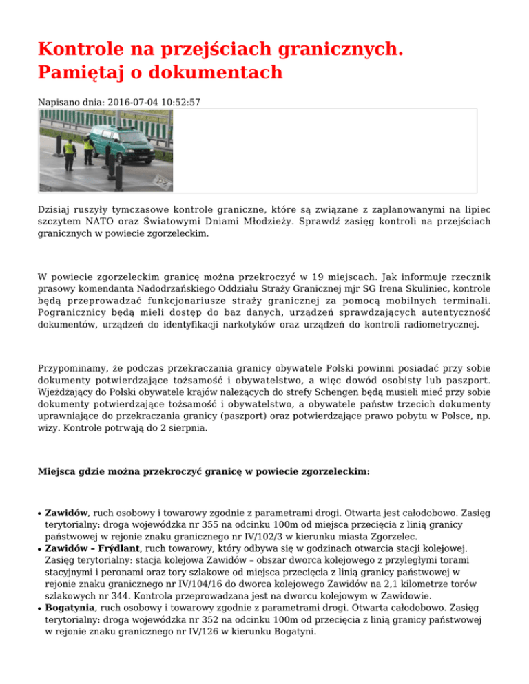Kontrole na przejściach granicznych. Pamiętaj o dokumentach Napisano dnia: 2016-07-04 10:52:57 Dzisiaj ruszyły tymczasowe kontrole graniczne, które są związane z zaplanowanymi na lipiec szczytem NATO oraz Światowymi Dniami Młodzieży. Sprawdź zasięg kontroli na przejściach granicznych w powiecie zgorzeleckim. W powiecie zgorzeleckim granicę można przekroczyć w 19 miejscach. Jak informuje rzecznik prasowy komendanta Nadodrzańskiego Oddziału Straży Granicznej mjr SG Irena Skuliniec, kontrole będą przeprowadzać funkcjonariusze straży granicznej za pomocą mobilnych terminali. Pogranicznicy będą mieli dostęp do baz danych, urządzeń sprawdzających autentyczność dokumentów, urządzeń do identyfikacji narkotyków oraz urządzeń do kontroli radiometrycznej. Przypominamy, że podczas przekraczania granicy obywatele Polski powinni posiadać przy sobie dokumenty potwierdzające tożsamość i obywatelstwo, a więc dowód osobisty lub paszport. Wjeżdżający do Polski obywatele krajów należących do strefy Schengen będą musieli mieć przy sobie dokumenty potwierdzające tożsamość i obywatelstwo, a obywatele państw trzecich dokumenty uprawniające do przekraczania granicy (paszport) oraz potwierdzające prawo pobytu w Polsce, np. wizy. Kontrole potrwają do 2 sierpnia. Miejsca gdzie można przekroczyć granicę w powiecie zgorzeleckim: ● ● ● Zawidów, ruch osobowy i towarowy zgodnie z parametrami drogi. Otwarta jest całodobowo. Zasięg terytorialny: droga wojewódzka nr 355 na odcinku 100m od miejsca przecięcia z linią granicy państwowej w rejonie znaku granicznego nr IV/102/3 w kierunku miasta Zgorzelec. Zawidów – Frýdlant, ruch towarowy, który odbywa się w godzinach otwarcia stacji kolejowej. Zasięg terytorialny: stacja kolejowa Zawidów – obszar dworca kolejowego z przyległymi torami stacyjnymi i peronami oraz tory szlakowe od miejsca przecięcia z linią granicy państwowej w rejonie znaku granicznego nr IV/104/16 do dworca kolejowego Zawidów na 2,1 kilometrze torów szlakowych nr 344. Kontrola przeprowadzana jest na dworcu kolejowym w Zawidowie. Bogatynia, ruch osobowy i towarowy zgodnie z parametrami drogi. Otwarta całodobowo. Zasięg terytorialny: droga wojewódzka nr 352 na odcinku 100m od przecięcia z linią granicy państwowej w rejonie znaku granicznego nr IV/126 w kierunku Bogatyni. ● ● ● ● ● ● ● ● ● ● ● ● ● Kopaczów-Oldrichov, ruch osobowy i towarowy zgodnie parametrami drogi. Otwarta całodobowo. Zasięg terytorialny: droga wojewódzka, tranzytowa nr 352, pomiędzy Republiką Federalną Niemiec a Republiką Czeską na odcinku 100m od miejsca przecięcia z linią granicy państwowej w rejonie znaku granicznego IV/144/10 w kierunku miejscowości Kopaczów oraz działka bezpośrednio przyległa do drogi. Kontrola jest prowadzona na kierunku wjazdowym oraz na kierunku wjazdowym na działce przyległej do drogi tranzytowej. Porajów-Hradem nad Nisou, ruch osobowy i towarowy zgodnie z parametrami drogi. Ruch odbywa się całodobowo. Zasięg terytorialny: droga powiatowa nr 2364D na odcinku 100m od miejsca przecięcia z linią granicy państwowej w rejonie znaku granicznego nr IV/146 w kierunku miejscowości Porajów. Spytków-Ves, ruch pieszy i rowerowy. Droga otwarta jest całodobowo. Zasięg terytorialny: szlak turystyczny w rejonie znaku granicznego nr IV/74. Lutogniewice-Andelka, ruch pieszy i rowerowy. Droga otwarta jest całodobowo. Zasięg terytorialny: szlak turystyczny w rejonie znaku granicznego nr IV/111. Wigancice Żytawskie-Visnovska, ruch pieszy i rowerowy. Droga otwarta całodobowo. Zasięg terytorialny: szlak turystyczny w rejonie znaku granicznego nr IV/119. Porajów-Zittau, ruch osobowy i towarowy zgodnie z parametrami drogi. Droga otwarta całodobowo. Zasięg terytorialny: droga powiatowa nr 2364D na odcinku 100m od miejsca przecięcia z linią granicy państwowej w rejonie znaku granicznego nr 5 w kierunku miejscowości Porajów. Kontrola jest przeprowadzana na drodze powiatowej nr 2364D. Sieniawka, ruch osobowy i towarowy zgodnie z parametrami drogi. Droga otwarta całodobowo. Zasięg terytorialny: droga wojewódzka nr 354 na odcinku 100m od miejsca przecięcia z linią granicy państwowej w rejonie znaku granicznego nr 9 w kierunku miejscowości Sieniawka oraz działka nr 158/1 bezpośrednio przylegająca do drogi nr 354 (zarządca działki – Miasto i Gmina Bogatynia). Kontrola jest przeprowadzana w kierunku wjazdowym na drodze 354 i na działce nr 158/1 oraz w kierunku wjazdowym na drodze wojewódzkiej nr 354. Sieniawka tranzyt-Zittau, ruch osobowy i tranzytowy zgodnie z parametrami drogi. Droga otwarta całodobowo. Zasięg terytorialny: droga wojewódzka, tranzytowa nr 332, pomiędzy Republiką Federalną Niemiec a Republiką Czeską na odcinku 75m od miejsca przecięcia z linią granicy państwowej w rejonie znaku granicznego nr 10 w kierunku miejscowości Sieniawka oraz działka bezpośrednio przylegająca do drogi tranzytowej. Kontrola jest przeprowadzana na kierunku wjazdowym oraz na kierunku wyjazdowym na działce przylegającej do drogi tranzytowej. Krzewina Zgorzelecka, ruch osobowy (pieszy). Droga jest otwarta w godzinach 8.00-20.00. Zasięg terytorialny: w miejscowości Krzewina most graniczny, na odcinku 30m od miejsca przecięcia z linią granicy państwowej na wysokości znaku granicznego nr 71 w kierunku miejscowości Krzewina Zgorzelecka. Kontrola jest przeprowadzana przed mostem granicznym. Radomierzyce, ruch osobowy i towarowy zgodnie z parametrami drogi. Droga otwarta jest całodobowo. Zasięg terytorialny: droga wojewódzka nr 352A na odcinku 100m od miejsca przecięcia z linią granicy państwowej w rejonie znaku granicznego nr 96 w kierunku miejscowości Radomierzyce. Zgorzelec-Goerlitz, ruch osobowy i towarowy w godzinach otwarcia stacji kolejowej. Prowadzenie kontroli w pociągach osobowych na wjazd i wyjazd z Polski na stacji kolejowej Zgorzelec Ujazd i Z