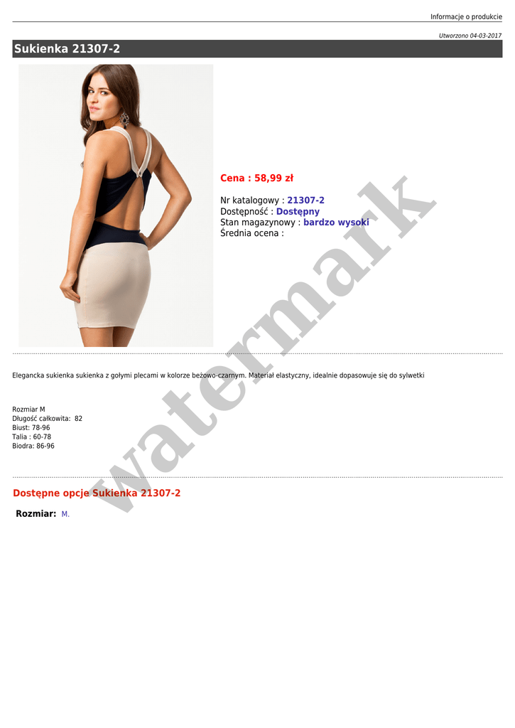 Informacje o produkcie Utworzono 04-03-2017 Sukienka 21307-2 Cena : 58,99 zł er m ar k Nr katalogowy : 21307-2 Dostępność : Dostępny Stan magazynowy : bardzo wysoki Średnia ocena : w Rozmiar M Długość całkowita: 82 Biust: 78-96 Talia : 60-78 Biodra: 86-96 at Elegancka sukienka sukienka z gołymi plecami w kolorze beżowo-czarnym. Materiał elastyczny, idealnie dopasowuje się do sylwetki Dostępne opcje Sukienka 21307-2 Rozmiar: M.