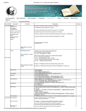 6.09.2015 Gimnazjum nr 3 im. Janusza Korczaka w Kielcach Gimnazjum nr 3 im. Janusza Korczaka w Kielcach Strona główna Galeria Home Dla rodziców + Osiągnięcia Rok szkolny Dla uczniów + O szkole + Osiągnięcia + Inne + Kontakt Rekrutacja Konkursy sportowe Dyscyplina Uczniowie 2014/2015 chłopcy Lekkoatletyka Dziewczęta Lekkoatletyka Chłopcy koszykówka Chłopcy piłka nożna Dziewczęta piłka nożna Dziewczęta piłka siatkowa Taniec Marta Gałecka (Candela Team) Taniec Ola Olszak Kl. II b Ewa Lelas II b – Jump Kielce 2013/2014 Osiągnięcie VII miejsce Sztafetowe biegi przełajowe (A. Matyja) VII Sztafetowe biegi przełajowe (R. Ligas) Opiekun III miejsce, Mistrzostwa Kielc Szkół Gimnazjalnych (T. Michalski) I miejsce Mistrzostwa Kielc Szkół Gimnazjalnych (A. Matyja) VI miejsce Mistrzostwa Kielc Szkół Gimnazjalnych (R. Ligas, A. Ambrozik) V miejsce Mistrzostwa Kielc Szkół Gimnazjalnych I. Motyl II wicemistrzostwo w Europie w salsie solo 16+ – Szkoła Tańca i Ruchu Scenicznego Mimesis XIV Festiwal Tańca w Skarżysku III m‐ce ‘ Złota Miotła ’ w WDK Mistrzostwa Polski w tańcu par i synchro Dance 2014r. I m‐ce ‐ Formacje Latino Show I m‐ce ‐ Duet Disco pow. 12 lat Kielce I m‐ce ‐ Formacja Disco Dance pow. 12 lat Kielce III m‐ce ‐ Solo Disco Dance Kielce I miejsce w Międzynarodowym Turnieju Salsy (salsa solo) Marta Gałecka (Candela Team) Biegi uliczne Gimnastyka Pływanie Lekkoatletyka Koszykówka Piłka nożna Piłka siatkowa 2012/2013 Lekkoatletyka Piłka Koszykowa Piłka siatkowa dziewcząt II miejsce w Mistrzostwach Europy Tańców Kubańskich w salsie solo „Kielce Biegają” „Bieg Papieski” II mce Jakub Piskulak kl. III e III mce Katarzyna Barchan kl. II c V Gimnazjalne Zawody Gimnastyczne „Społeczna 2014” II mce Julia Rabiej kl. III e Mistrzostwa Kielc w Pływaniu I mce 100m stylem dowolnym Paulina Rogowska kl. III b I mce 100m stylem zmiennym Paulina Rogowska kl. III b III mce 100m stylem grzbietowym – Patrycja Salwa kl. III d Biegi Przełajowe IV mce dziewczęta Halowe Mistrzostwa Kielc Szkół Gimnazjalnych w Wieloboju Lekkoatletycznym: I mce rzut piłką lekarską – Mateusz Tamborski kl. III c III mce skok w dal – Mateusz Tamborski kl. III c IV mce w klasyfikacji generalnej – Mateusz Tamborski kl. III c Orlik Basketmania: I mce chłopcy I mce dziewczęta III mce w grupie Mistrzostw Szkół Gimnazjalnych Kielc dziewczęta Mistrzostwa Kielc Szkół Gimnazjalnych w piłce nożnej dziewcząt VI mce udział w ‘ Turnieju o Puchar Czwartaków ’ organizowany przez MOSiR Kielce piłka nożna chłopców Halowe Mistrzostwa Kielc Szkół Gimnazjalnych w Piłce nożnej chłopców Vmce Mistrzostwa Kielc Szkół Gimnazjalnych w Piłce Siatkowej dziewcząt III mce w grupie udział w IV Biegu Ulicznym „ Kielce Biegają” udział w Biegu Niepodległości III miejsce – Mistrzostwa Kielc Szkół Gimnazjalnych chłopców I miejsce Mistrzostw Kielc Szkół Gimnazjalnych dziewcząt awans do półfinału Mistrzostw Kielc Szkół Gimnazjalnych III miejsce Turniej Piłki siatkowej o puchar dyrektora Szkół Profil awans do półfinału Mistrzostw Kielc Szkół Gimnazjalnych file:///J:/Przenoszenie%20strony%20www/Gim3/gim3kielce.pl/Konkursysportowe.html 1/3 6.09.2015 Gimnazjum nr 3 im. Janusza Korczaka w Kielcach Piłka siatkowa chłopców II miejsce w VII Turnieju Halowej Piłki Nożnej „O Puchar Czwartaków” I miejsce Mistrzostwa Kielc Szkół Gimnazjalnych III miejsce Mistrzostwa Kielc Szkół Gimnazjalnych w Pływaniu w klasyfikacji szkół Piłka nożna chłopcy Piłka nożna dziewcząt Gawlik Mariola III miejsce na 100m stylem dowolnym Rogowska Paulina I miejsce na 100m stylem dowolnym i grzbietowym Lipka Łukasz II miejsce na 50m stylem motylkowym Pływanie 2011/2012 lekkoatletyka piłka koszykowa piłka nożna piłka siatkowa 2010/2011 piłka koszykowa chłopcy dziewczęta chłopcy chłopcy dziewczęta chłopcy piłka koszykowa piłka nożna piłka siatkowa dziewczęta chłopcy chłopcy piłka siatkowa dziewczęta pływanie Piotr Salwa Paulina Marzec tenis stołowy 2009/2010 piłka koszykowa Patryk Gzik Emil Litwin Sara Domagała Katarzyna Majchrzak chłopcy piłka siatkowa dziewczęta piłka siatkowa chłopcy pływanie tenis stołowy Maja Słopiecka Kaja Kijewska Piotr Salwa Karolina Chmielarz Martyna Łakomiec Karolina Chmielarz Martyna Łakomiec Emil Litwin Michał Majchrzak Jakub Figiel VI miejsce Mistrzostwa Kielc Szkół Gimnazjalnych w Przełajowych Biegach Sztafetowych udział w III Biegu Ulicznym "Kielce biegają" awans do finału Mistrzostw Kielc Szkół Gimnazjalnych dziewcząt i chłopców I miejsce Mistrzostwa Kielc Szkół Gimnazjalnych III miejsce Mistrzostwa Kielc Szkół Gimnazjalnych II miejsce półfinał Turnieju Piłki Nożnej Halowej org. przez MOSiR V miejsce Turniej Piłki Siatkowej Szkół Gimnazjalnych org. przez MOSiR IV miejsce Turniej Piłki Siatkowej Szkół Gimnazjalnych org. przez MOSiR awans do ćwierćfinału Mistrzostwa Kielc Szkół Gimnazjalnych I miejsce Finał Wojewódzki Świętokrzyskich Igrzysk Młodzieży Szkolnej I miejsce Mistrzostwa Kielc Szkół Gimnazjalnych I miejsce Półfinał Wojewódzki Świętokrzyskich Igrzysk Młodzieży Szkolnej Finał turnieju "Echa Dnia" I miejsce Mistrzostwa Kielc klas 1. III miejsce Mistrzostwa Kielc klas 1. I miejsce Turniej o puchar dyrektora szkół "Awans" II miejsce Finał Wojewódzki Świętokrzyskich Igrzysk Młodzieży Szkolnej I miejsce Półfinał Wojewódzki Świętokrzyskich Igrzysk Młodzieży Szkolnej I miejsce Mistrzostwa Kielc Szkół Gimnazjalnych I miejsce Liga Miasta Szkół Gimnazjalnych II miejsce Turniej o puchar dyrektora SZO nr 1 IV miejsce Mistrzostwa Kielc Szkół Gimnazjalnych IV miejsce Liga Miasta Szkół Gimnazjalnych Liga Szkół Gimnazjalnych w Pływaniu: I miejsce 100 m stylem dowolnym I miejsce 100 m stylem grzbietowym III miejsce 50 m stylem motylkowym III miejsce 50 m stylem zmiennym I miejsce Mistrzostwa Ki
