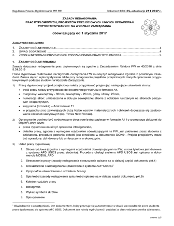 Regulamin Procesu Dyplomowania WZ PW Dokument DOK-05, aktualizacja 27 I 2017 r. ZASADY REDAGOWANIA PRAC DYPLOMOWYCH, PROJEKTÓW PRZEJŚCIOWYCH I INNYCH OPRACOWAŃ PRZYGOTOWYWANYCH NA WYDZIALE ZARZĄDZANIA obowiązujący od 1 stycznia 2017 ZAWARTOŚĆ DOKUMENTU 1. ZASADY OGÓLNE REDAKCJI ................................................................................................................................. 1 2. UWAGI DODATKOWE ............................................................................................................................................ 4 3. ŹRÓDŁA INFORMACJI PRZYDATNYCH PODCZAS PISANIA PRACY DYPLOMOWEJ ................................................ 5 1. ZASADY OGÓLNE REDAKCJI Zasady dotyczące redagowania prac dyplomowych są zgodne z Zarządzeniem Rektora PW nr 43/2016 z dnia 8.09.2016 Prace dyplomowe realizowane na Wydziale Zarządzania PW muszą być redagowane zgodnie z poniższymi zasadami. Zaleca się ich wykorzystywanie także przy redagowaniu projektów przejściowych i innych opracowań przygotowywanych podczas studiów na Wydziale Zarządzania. 1) Pracę dyplomową i projekt przejściowy należy przygotować przyjmując następujące ustawienia strony: treść pracy należy przygotować do dwustronnego wydruku o formacie A4, marginesy: wewnętrzny - 30mm, zewnętrzny - 20mm, górny i dolny: 25mm, numeracja stron: umieszczona u dołu po zewnętrznej stronie z odbiciem lustrzanym na stronach parzystych i nieparzystych, krój pisma (czcionka) – Arial rozmiar 11 w przypadku prac zawierających dużą liczbę wzorów matematycznych i obliczeń dopuszcza się zastosowanie czcionek szeryfowych (np. Times New Roman). 2) Opracowanie powinno być wydrukowane dwustronnie (na papierze w formacie A4 i o gramaturze zbliżonej do 90g/m2), przy czym: praca dyplomowa musi być oprawiona introligatorsko, okładka pracy, zgodna z wymogami edytorskimi obowiązującymi na PW, jest pobierana przez studenta z dziekanatu, procedura pobrania okładki jest określona w dokumencie DOK01. Projekt przejściowy może być oprawiony, zbindowany lub umieszczony w skoroszycie. 3) Układ pracy dyplomowej 1. Strona tytułowa (zgodna z wymogami edytorskimi obowiązującymi na PW, strona tytułowa jest drukowa z systemu APD USOS przez studenta). Procedura obsługi systemu APD USOS jest opisana w dokumencie MODUŁ APD 2. Streszczenie pracy (zasady redagowania streszczenia opisane są w dalszej części dokumentu pkt.4) 3. Oświadczenie o udostępnianiu (drukowane z systemu ADP USOS)1 4. Opcjonalnie oświadczenie o udzieleniu licencji 5. Spis treści (zasady redagowania spisu treści opisane są w dalszej części dokumentu pkt.5) 6. Kolejne rozdziały pracy 7. Bibliografia 8. Wykaz symboli i skrótów 9. Spis rysunków 1 Oświadczenie o udostępnianiu jest dokumentem, który generuje się automatycznie w chwili wprowadzenia przez studenta pracy dyplomowej do systemu APD USOS. Dokument ten należy wydrukować i podpisać w obecności pracownika dziekanatu. strona 1/5 Regulamin Procesu Dyplomowania WZ PW Dokument DOK-05, aktualizacja 27 I 2017 r. 10. Spis tabel 11. Spis załączników 12. Załączniki 4) Streszczenie pracy 1. Streszczenie pracy pisane jest czcionką Arial 12 z odstępem pojedynczym 2. Jeżeli praca dyplomowa jest napisana w języku polskim to: – streszczenie pracy w języku polskim, zawierające tytuł pracy, zestaw słów kluczowych (objętość 1 strona), – streszczenie pracy w języku angielskim, zawierające tytuł pracy, zestaw słów kluczowych (objętość 1 strona,), – streszczenie pracy w języku obcym, zawierające tytuł pracy, zestaw słów kluczowych – jeśli student występuje o wydanie odpisu dyplomu w tłumaczeniu na język inny niż angielski (objętość 1 strona,) – opcjonalnie. 3. Jeżeli praca dyplomowa jest napisana w języku angielskim to: - streszczenie pracy w języku angielskim, zawierające tytuł pracy, zestaw słów kluczowych (objętość 1 strona), - streszczenie pracy w języku polskim, zawierające tytuł pracy, zestaw słów kluczowych (objętość 1 strona), - streszczenie pracy w języku obcym, zawierające tytuł pracy, zestaw słów kluczowych – jeśli student występuje o wydanie odpisu dyplomu w tłumaczeniu na język inny niż angielski (objętość 1 strona) – opcjonalnie. 4. Jeżeli praca dyplomowa jest napisana w języku obcym innym niż język angielski to: 5) - streszczenie pracy w języku obcym, w którym napisana jest praca, zawierające tytuł pracy, zestaw słów kluczowych (objętość 1 strona), - streszczenie pracy w języku polskim, zawierające tytuł pracy, zestaw słów kluczowych (objętość 1 strona), - streszczenie pracy w języku angielskim, zawierające tytuł pracy, zestaw słów kluczowych (objętość 1 strona), - streszczenie pracy w języku obcym, zawierające tytuł pracy, zestaw słów kluczowych – jeśli student występuje o wydanie odpisu dyplomu w tłumaczeniu na język inny niż angielski (objętość 1 strona, odstęp pojedynczy, czcionka 12) – opcjonalnie. W spisie treści (generowanym automatyczne), przy numeracji rozdziałów i podrozdziałów, nie zaleca się stawiania kropek po ostatniej cyfrze. Przykład redakcji spisu treści: SPIS TREŚCI 1 TYTUŁ ROZDZIAŁU 1.................................................................................................................. 5 1.1 Tytuł podrozdziału 1.1 ................................................................................................ 10 1.2 Tytuł podrozdziału 1.2 ................................................................................................ 13 6) Redakcja rozdziałów i podrozdziałów: podział treści na rozdziały i podrozdziały musi być zgodny ze spisem treści, przy zachowaniu dwustopniowej hierarchii podziału (w uzasadnionych przypadkach, za zgodą promotora, można wprowadzić trzeci poziom numeracji), tytuły rozdziałów I poziomu należy zapisać: od nowej str