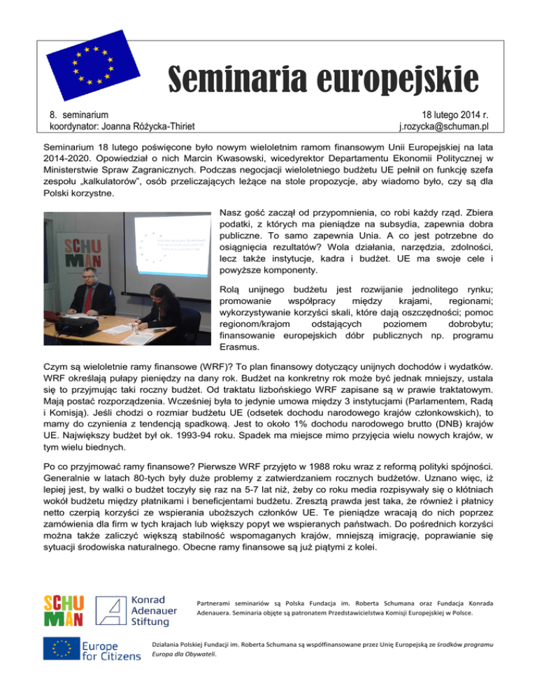 Seminaria europejskie 8. seminarium koordynator: Joanna Różycka-Thiriet 18 lutego 2014 r. [email protected] Seminarium 18 lutego poświęcone było nowym wieloletnim ramom finansowym Unii Europejskiej na lata 2014-2020. Opowiedział o nich Marcin Kwasowski, wicedyrektor Departamentu Ekonomii Politycznej w Ministerstwie Spraw Zagranicznych. Podczas negocjacji wieloletniego budżetu UE pełnił on funkcję szefa zespołu „kalkulatorów”, osób przeliczających leżące na stole propozycje, aby wiadomo było, czy są dla Polski korzystne. Nasz gość zaczął od przypomnienia, co robi każdy rząd. Zbiera podatki, z których ma pieniądze na subsydia, zapewnia dobra publiczne. To samo zapewnia Unia. A co jest potrzebne do osiągnięcia rezultatów? Wola działania, narzędzia, zdolności, lecz także instytucje, kadra i budżet. UE ma swoje cele i powyższe komponenty. Rolą unijnego budżetu jest rozwijanie jednolitego rynku; promowanie współpracy między krajami, regionami; wykorzystywanie korzyści skali, które dają oszczędności; pomoc regionom/krajom odstających poziomem dobrobytu; finansowanie europejskich dóbr publicznych np. programu Erasmus. Czym są wieloletnie ramy finansowe (WRF)? To plan finansowy dotyczący unijnych dochodów i wydatków. WRF określają pułapy pieniędzy na dany rok. Budżet na konkretny rok może być jednak mniejszy, ustala się to przyjmując taki roczny budżet. Od traktatu lizbońskiego WRF zapisane są w prawie traktatowym. Mają postać rozporządzenia. Wcześniej była to jedynie umowa między 3 instytucjami (Parlamentem, Radą i Komisją). Jeśli chodzi o rozmiar budżetu UE (odsetek dochodu narodowego krajów członkowskich), to mamy do czynienia z tendencją spadkową. Jest to około 1% dochodu narodowego brutto (DNB) krajów UE. Największy budżet był ok. 1993-94 roku. Spadek ma miejsce mimo przyjęcia wielu nowych krajów, w tym wielu biednych. Po co przyjmować ramy finansowe? Pierwsze WRF przyjęto w 1988 roku wraz z reformą polityki spójności. Generalnie w latach 80-tych były duże problemy z zatwierdzaniem rocznych budżetów. Uznano więc, iż lepiej jest, by walki o budżet toczyły się raz na 5-7 lat niż, żeby co roku media rozpisywały się o kłótniach wokół budżetu między płatnikami i beneficjentami budżetu. Zresztą prawda jest taka, że również i płatnicy netto czerpią korzyści ze wspierania uboższych członków UE. Te pieniądze wracają do nich poprzez zamówienia dla firm w tych krajach lub większy popyt we wspieranych państwach. Do pośrednich korzyści można także zaliczyć większą stabilność wspomaganych krajów, mniejszą imigrację, poprawianie się sytuacji środowiska naturalnego. Obecne ramy finansowe są już piątymi z kolei. Partnerami seminariów są Polska Fundacja im. Roberta Schumana oraz Fundacja Konrada Adenauera. Seminaria objęte są patronatem Przedstawicielstwa Komisji Europejskiej w Polsce. Działania Polskiej Fundacji im. Roberta Schumana są współfinansowane przez Unię Europejską ze środków programu Europa dla Obywateli. Kto zarządza pieniędzmi z unijnego budżetu? Największą pulą pieniędzy zarządzają wspólnie Komisja i państwa członkowskie (np. w ramach polityki spójności, polityki rolnej). To ponad 70% budżetu. Około 20% zarządza sama Komisja Europejska (to programy typu Erasmus czy Programy Ramowe). Co do głównych kategorii wydatków, to od swojego powstania w 1963 roku główną pozycją budżetową jest wspólna polityka rolna (teraz jej udział jest nieco mniejszy). Po rozszerzeniu Europejskiej Wspólnoty Gospodarczej w 1975 roku powstaje Europejski Fundusz Rozwoju Regionalnego, pojawia się polityka regionalna. Aktualnie wspieranie uboższych krajów i regionów to druga istotna kategoria wydatków. Stopniowo rozwijają się też inne polityki np. zagraniczna. Swój udział w wydatkach ma też administracja UE. W latach 2007-2013 największymi pozycjami w WRF była wspólna polityka rolna (42,5% wydatków) i polityka spójności (35,6%). Na konkurencyjność przekazano 9% pieniędzy, na administrację 5,8%, na działania zewnętrzne 5,7%. Co do dochodów do unijnego budżetu, początkowo poprzedniczka Unii Europejskiej – Europejska Wspólnota Gospodarcza finansowana była ze składek. W 1968 roku zaczęła działać między państwami członkowskimi unia celna – dochody z ceł i tzw. opłaty cukrowe powędrowały do wspólnej kasy. W latach 70-tych państwa zaczęły wpłacać część podatku VAT. W połowie lat 80-tych pojawiło się kolejne źródło finansowania oparte na dochodzie narodowym brutto. Kraje wpłacają odpowiedni procent swojego DNB. W istocie jest to składka członkowska. To największe źródło dochodów budżetowych. Polska składka to około 3% DNB. Ważną zasadną unijnego budżetu jest to, że Unia nie może się zadłużać. Wydatki muszą się równać dochodom. Jakie czynniki wpływały na negocjacje obecnych wieloletnich ram finansowych? Niewątpliwy wpływ miał kryzys zadłużenia w strefie euro. Równolegle z tymi negocjacjami toczyły się negocjacje dotyczące wyjścia z kryzysu. Kraje południowe miały duże deficyty i zadłużały się głównie w Niemczech. Toczyła się dyskusja o tym, czy koszty kryzysu mają ponieść kraje południowe (czy ich ceny i płace mają spaść; czy mają zacisnąć pasa?). Czy też zwiększamy inflację, nakręcając koniunkturę, uwspólniamy dług? Ostatecznie wierzyciele narzucili korzystniejszy dla siebie pierwszy wariant. W związku z oszczędnościami w krajach członkowskich pojawiło się pytanie o oszczędności w samej UE, a co za tym idzie mniejszy budżet. Polska uważała, że unijny budżet należy traktować jako korzystną w kryzysie inwestycję. Część ekspertów, zwłaszcza w Niemczech, sądziła, że fundusze spójności przyczyniły się do kryzysu – spowodowały spadek konkurencyjności. Polityka spójności wprowadza bowiem do gospoda
