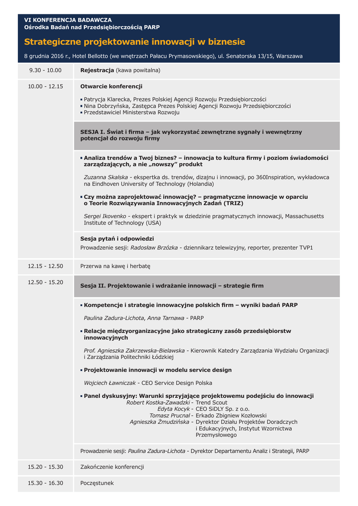 VI KONFERENCJA BADAWCZA Ośrodka Badań nad Przedsiębiorczością PARP Strategiczne projektowanie innowacji w biznesie 8 grudnia 2016 r., Hotel Bellotto (we wnętrzach Pałacu Prymasowskiego), ul. Senatorska 13/15, Warszawa 9.30 - 10.00 Rejestracja (kawa powitalna) 10.00 - 12.15 Otwarcie konferencji atrycja Klarecka, Prezes Polskiej Agencji Rozwoju Przedsiębiorczości P Nina Dobrzyńska, Zastępca Prezes Polskiej Agencji Rozwoju Przedsiębiorczości Przedstawiciel Ministerstwa Rozwoju SESJA I. Świat i firma – jak wykorzystać zewnętrzne sygnały i wewnętrzny potencjał do rozwoju firmy A naliza trendów a Twoj biznes? – innowacja to kultura firmy i poziom świadomości zarządzających, a nie „nowszy” produkt Zuzanna Skalska - ekspertka ds. trendów, dizajnu i innowacji, po 360Inspiration, wykładowca na Eindhoven University of Technology (Holandia) C zy można zaprojektować innowację? – pragmatyczne innowacje w oparciu o Teorie Rozwiązywania Innowacyjnych Zadań (TRIZ) Sergei Ikovenko - ekspert i praktyk w dziedzinie pragmatycznych innowacji, Massachusetts Institute of Technology (USA) Sesja pytań i odpowiedzi Prowadzenie sesji: Radosław Brzózka - dziennikarz telewizyjny, reporter, prezenter TVP1 12.15 - 12.50 12.50 - 15.20 Przerwa na kawę i herbatę Sesja II. Projektowanie i wdrażanie innowacji – strategie firm K ompetencje i strategie innowacyjne polskich firm – wyniki badań PARP Paulina Zadura-Lichota, Anna Tarnawa - PARP R elacje międzyorganizacyjne jako strategiczny zasób przedsiębiorstw innowacyjnych Prof. Agnieszka Zakrzewska-Bielawska - Kierownik Katedry Zarządzania Wydziału Organizacji i Zarządzania Politechniki Łódzkiej P rojektowanie innowacji w modelu service design Wojciech Ławniczak - CEO Service Design Polska P anel dyskusyjny: Warunki sprzyjające projektowemu podejściu do innowacji Robert Kostka-Zawadzki -Trend Scout Edyta Kocyk -CEO SiDLY Sp. z o.o. Tomasz Prucnal -Erkado Zbigniew Kozłowski Agnieszka Żmudzińska - Dyrektor Działu Projektów Doradczych i Edukacyjnych, Instytut Wzornictwa Przemysłowego Prowadzenie sesji: Paulina Zadura-Lichota - Dyrektor Departamentu Analiz i Strategii, PARP 15.20 - 15.30 Zakończenie konferencji 15.30 - 16.30 Poczęstunek
