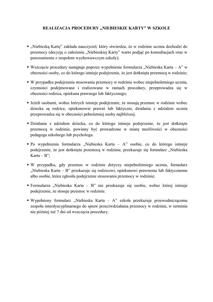 REALIZACJA PROCEDURY „NIEBIESKIE KARTY” W SZKOLE  „Niebieską Kartę” zakłada nauczyciel, który stwierdza, że w rodzinie ucznia dochodzi do przemocy (decyzję o założeniu „Niebieskiej Karty” warto podjąć po konsultacjach oraz w porozumieniu z zespołem wychowawczym szkoły);  Wszczęcie procedury następuje poprzez wypełnienie formularza „Niebieska Karta – A” w obecności osoby, co do którego istnieje podejrzenie, że jest dotknięta przemocą w rodzinie;  W przypadku podejrzenia stosowania przemocy w rodzinie wobec niepełnoletniego ucznia, czynności podejmowane i realizowane w ramach procedury, przeprowadza się w obecności rodzica, opiekuna prawnego lub faktycznego;  Jeżeli osobami, wobec których istnieje podejrzenie, że stosują przemoc w rodzinie wobec dziecka są rodzice, opiekunowie prawni lub faktyczni, działania z udziałem ucznia przeprowadza się w obecności pełnoletniej osoby najbliższej.  Działania z udziałem dziecka, co do którego istnieje podejrzenie, że jest dotknięte przemocą w rodzinie, powinny być prowadzone w miarę możliwości w obecności pedagoga szkolnego lub psychologa.  Po wypełnieniu formularza „Niebieska Karta – A” osobie, co do którego istnieje podejrzenie, że jest dotknięta przemocą w rodzinie, przekazuje się formularz „Niebieska Karta – B”;  W przypadku, gdy przemoc w rodzinie dotyczy niepełnoletniego ucznia, formularz „Niebieska Karta – B” przekazuje się rodzicowi, opiekunowi prawnemu lub faktycznemu albo osobie, która zgłosiła podejrzenie stosowania przemocy w rodzinie;  Formularza „Niebieska Karta – B” nie przekazuje się osobie, wobec której istnieje podejrzenie, że stosuje przemoc w rodzinie.  Wypełniony formularz „Niebieska Karta – A” szkoła przekazuje przewodniczącemu zespołu interdyscyplinarnego do spraw przeciwdziałania przemocy w rodzinie, w terminie nie później niż 7 dni od wszczęcia procedury.