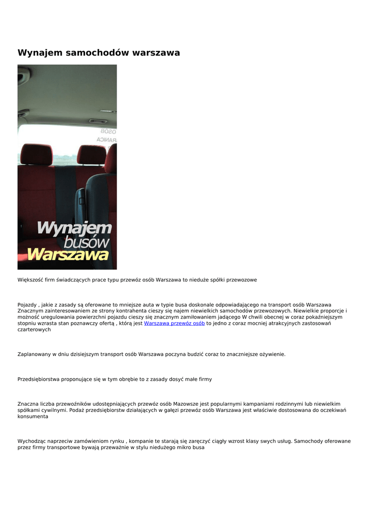 Wynajem samochodów warszawa Większość firm świadczących prace typu przewóz osób Warszawa to nieduże spółki przewozowe Pojazdy , jakie z zasady są oferowane to mniejsze auta w typie busa doskonale odpowiadającego na transport osób Warszawa Znacznym zainteresowaniem ze strony kontrahenta cieszy się najem niewielkich samochodów przewozowych. Niewielkie proporcje i możność uregulowania powierzchni pojazdu cieszy się znacznym zamiłowaniem jadącego W chwili obecnej w coraz pokaźniejszym stopniu wzrasta stan poznawczy ofertą , którą jest Warszawa przewóz osób to jedno z coraz mocniej atrakcyjnych zastosowań czarterowych Zaplanowany w dniu dzisiejszym transport osób Warszawa poczyna budzić coraz to znaczniejsze ożywienie. Przedsiębiorstwa proponujące się w tym obrębie to z zasady dosyć małe firmy Znaczna liczba przewoźników udostępniających przewóz osób Mazowsze jest popularnymi kampaniami rodzinnymi lub niewielkim spółkami cywilnymi. Podaż przedsiębiorstw działających w gałęzi przewóz osób Warszawa jest właściwie dostosowana do oczekiwań konsumenta Wychodząc naprzeciw zamówieniom rynku , kompanie te starają się zaręczyć ciągły wzrost klasy swych usług. Samochody oferowane przez firmy transportowe bywają przeważnie w stylu niedużego mikro busa Powered by TCPDF (www.tcpdf.org)