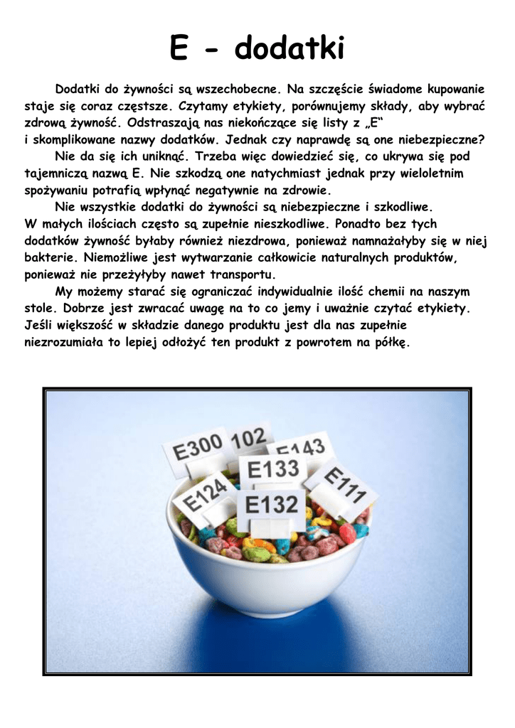 E - dodatki Dodatki do żywności są wszechobecne. Na szczęście świadome kupowanie staje się coraz częstsze. Czytamy etykiety, porównujemy składy, aby wybrać zdrową żywność. Odstraszają nas niekończące się listy z „E“ i skomplikowane nazwy dodatków. Jednak czy naprawdę są one niebezpieczne? Nie da się ich uniknąć. Trzeba więc dowiedzieć się, co ukrywa się pod tajemniczą nazwą E. Nie szkodzą one natychmiast jednak przy wieloletnim spożywaniu potrafią wpłynąć negatywnie na zdrowie. Nie wszystkie dodatki do żywności są niebezpieczne i szkodliwe. W małych ilościach często są zupełnie nieszkodliwe. Ponadto bez tych dodatków żywność byłaby również niezdrowa, ponieważ namnażałyby się w niej bakterie. Niemożliwe jest wytwarzanie całkowicie naturalnych produktów, ponieważ nie przeżyłyby nawet transportu. My możemy starać się ograniczać indywidualnie ilość chemii na naszym stole. Dobrze jest zwracać uwagę na to co jemy i uważnie czytać etykiety. Jeśli większość w składzie danego produktu jest dla nas zupełnie niezrozumiała to lepiej odłożyć ten produkt z powrotem na półkę. Symbol E Nazwa Zastosowanie Uwagi Barwniki i pigmenty E 102 tartrazyna E 103 E 104 żółcień chinolinowa E 122 niektóre wyroby cukiernicze szkodliwy w dużych ilościach ZABRONIONY żółcień pomarańczowa E 111 E 120 NIEBEZPIECZNY ZABRONIONY E 105 E 110 napoje w proszku, esencje owocowe, musztarda marmolady, żele, guma do żucia NIEBEZPIECZNY ZABRONIONY karmin / kwas karminowy różne NIEBEZPIECZNY azorubina, chromotrop dżemy i marmolady wiśniowe, budynie, lody, polewy podejrzany (zabroniony w Polsce) E 123 amarant różne NIEBEZPIECZNY (w niektórych krajach zabroniony) E 124 róż koszenilinowa cukierki pudrowe NIEBEZPIECZNY E 125 ZABRONIONY E 126 ZABRONIONY E 127 erytrozyna / tetrajodofluoresceina E 130 E 131 wiśnie koktailowe, owoce kandyzowane NIEBEZPIECZNY ZABRONIONY błękit patentowy kosmetyki, drażetki NIEBEZPIECZNY (możliwe działanie rakotwórcze) E 141 zwiazek miedziowy chlorofilu barwienie groszku konserwowego podejrzany E 142 zieleń lisaminowa barwienie słodyczy NIEBEZPIECZNY (rakotwórczy) E 150 karmel wyroby cukiernicze podejrzany E 151 czerń brylantowa barwnik słodyczy żelowych podejrzany E 152 ZABRONIONY E 171 dwutlenek tytanu guma do żucia, drażetki, pasta do zębów podejrzany (zabroniony w Polsce) E 172 wodorotlenek żelaza stosowany rzadko podejrzany E 173 glin / aluminium dekoracja słodyczy podejrzany Konserwanty E 210, 211, 212, 213, 214, 215, 216, 217, 218, 219 benzoesany m.in. napoje gazowane, marynaty, konserwy NIEBEZPIECZNE (możliwe działanie rakotwórcze) E 220 dwutlenek siarki soki, koncentraty szkodliwy E 221, 222, 223, 224, 226, 227 siarczany, wodosiarczany, pirosiarczany różne NIEBEZPIECZNE E 230, 231, 232, 233 difenyl / bifenyl, fenol, fenolan stosowany do zabezpieczania skórki owoców cytrusowych NIEBEZPIECZNE E 234 niazyna sery topione, antybiotyki podejrzny różne NIEBEZPIECZNY (możliwe działanie rakotwórcze) E 239 heksamina E 249, 250 azotyny sodu i potasu szkodliwe E 251 azotany sodu m. in. sery topione E 252 azotan potasu sery topione (powoduja nadcisnienie) Antyutleniacze, stabilizatory E 310, 311, 312 gallusany: propylu, oktylu, dodecylu płatki ziemniaczne, guma do żucia szkodliwe w dużych ilościach E 320 butylo-hydroksy-anizol biszkopty, tłuszcze piekarskie E 321 butylo-hydroksytoluen guma do żucia, opakowania żywności szkodliwe (wpływa niekorzystnie na poziom cholesterolu) E 330 kwas cytrynowy różne E 338 kwas fosforowy napoje E 339, 340, 341 odmiany kwasu ortofosforowego sery, proszek do pieczenia NIEBEZPIECZNY ( możliwe działanie rakotwórcze) szkodliwe (zakłócanie procesu trawienia) Zagęszczacze (emulgatory) E 407 karagen desery mleczne, galaretki w proszku, dżemy, keczup szkodliwy (zakłócanie procesu trawienia) E 422 glicerol, gliceryna wyroby cukiernicze podejrzany E 450, 451a, 451b fosforany, polifosforany sery topione szkodliwe (zakłócanie procesu trawienia) E 507 kwas solny E 524 wodorotlenek sodu podejrzany słone paluszki środek o działaniu żrącym