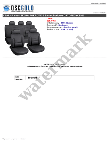 Informacje o produkcie Utworzono 04-03-2017 CZARNA eko* SKóRA POKROWCE Samochodowe ORTOPEDYCZNE Cena : 135,00 zł er m ar k Nr katalogowy : 8595DZ/czar Dostępność : Dostępny Stan magazynowy : bardzo wysoki Średnia ocena : brak recenzji MAXX LLC ® oferuje komplet uniwersalne SKÓRZANE pokrowce na siedzenia samochodowe KOD 8595DZ w at WYROBU: Wygenerowano w programie www.oscGold.com Komplet pokrowców na przód i tył- składa się z : 2 szt. pokrowce na przednie kanapy, 2 szt. pokrowce na przednie oparcia, 5 szt. pokrowce na zagłówki, 1 szt. pokrowiec na tylną kanapę, 1 szt. pokrowiec na tylne oparcie., komplet haczyków do naciągów DO KAŻDEGO ZAKUPIONEGO KOMPLETU POKROWCÓW 3 GRATISÓW !!! OPIS: * nakładka na kierownicę * 2 szt nakładka na pasy er m ar k • Pokrowce chronią oryginalną tapicerkę przed brudem i zużyciem • Zapewniają wysoki komfort podróżowania i utrzymanie foteli w czystości i dobrym stanie. • Tył przednich pokrowców oraz obszycia tylnych siedzeń wykonane z dobranego kolorystycznie materiału. • W przednich fotelach wykonano rozcięcia umożliwiające zakładanie pokrowca bez wyjmowania zagłówka, w pokrowcu tylnego oparcia otwory pod zagłówki wykonuje się samemu. • Dwa suwaki wszyte w oparcie i siedzisko tylnego pokrowca umożliwiają jego dzielenie i rozkładanie w kombinacjach: 1/3-2/3 i 2/3-1/3 oraz używanie podłokietnika. • Kolory odporne na światło i czyszczenie • Zapakowane w praktyczną torbę do przenoszenia at INSTRUKCJA PRANIA: w MATERIAŁ: Eko-skóra imitująca skórę naturalną - kolory są matowe, w dotyku i wyglądzie jak skóra naturalna, po jej wewnętrznej stronie znajduje się 2,5 mm gąbka, dzięki której pokrowce nie ślizgają się na siedzeniach. Pokrowce zaopatrzone są w gumki i haczyki pozwalające na odpowiednie naciągnięcie i dopasowanie ich na siedzenia. at er m ar k Informacje o produkcie w Dzięki poduszkom pod lędźwie wszytym w pokrowce przednich foteli nawet długa podróż nie powoduje nadmiernego przemęczenia kręgosłupa. Wygenerowano w programie www.oscGold.com er m ar k at w Model uniwersalny można stosować do samochodów: w at er m ar k Informacje o produkcie Wygenerowano w programie www.oscGold.com