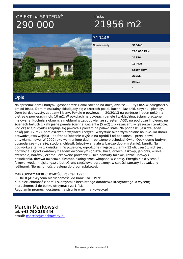 OBIEKT na SPRZEDAŻ 290 000 Ińsko 21956 m2 310448 Numer oferty 310448 290 000 PLN 21956 13 PLN Secondary 21956 Other 1 Opis Na sprzedaż dom i budynki gospodarcze zlokalizowane na dużej działce – 30 tys m2. w odległości 5 km od Ińska. Dom mieszkalny składający się z czterech pokoi, kuchni, łazienki, strychu i piwnicy. Dom bardzo czysty, zadbany i jasny. Pokoje o powierzchni 20/20/13 na parterze i jeden pokój na piętrze o powierzchni ok. 10 m2. W pokojach na połogach panele i wykładzina, ściany gładzone i malowane. Kuchnia z oknem, z meblami w zabudowie i ze sprzętem AGD, na podłodze linoleum, na ścianach fartuch z kafli jasne panele ścienne. Łazienka (5 m2) z prysznicem, w glazurze i terakocie. Pod częścią budynku znajduje się piwnica z piecem na paliwo stałe. Na poddaszu jeszcze jeden pokój (ok. 12 m2), pomieszczenie wędzarni i strych. Wszystkie okna wymienione na PCV. Do domu prowadzą dwa wejścia – od frontu (obecnie wyjście na ogród) i od podwórza – przez drzwi antywłamaniowe. W 2009 roku wymieniono dach – położono blachodachówkę. Obok domu budynki gospodarcze – garaże, stodoła, chlewik (nieużywany ale w bardzo dobrym stanie), kurnik. Na podwórku altanka z kwiatkami. Wydzielone, ogrodzone miejsce z ulami - 12 uli, część z nich jest podwójna. Ogród kwiatowy z sadem owocowym (grusza, śliwa, orzech laskowy, jabłonki, wiśnie, czereśnie, borówki, czarne i czerwone porzeczki). Dwa namioty foliowe, liczne uprawy i nasadzenia, drzewa owocowe. Szambo ekologiczne, wkopane w ziemię. Energia elektryczna 3 fazowa, woda miejska, gaz z butli.Grunt częściowo ogrodzony, w całości zaorany i obsadzony roślinami. Nieruchomość przylega do drogi asfaltowej. MARKOWSCY NIERUCHOMOŚCI, rok zał. 1993 PROMOCJA: "Wycena nieruchomości do banku za 1 PLN" Kup nieruchomość z nami i skorzystaj z bezpłatnego doradztwa kredytowego, a wycenę nieruchomości do banku otrzymasz za 1 PLN. Regulamin promocji dostępny na stronie www.markowscy.pl Marcin Markowski tel. +48 790 333 444 email: [email protected] Markowscy Nieruchomości Powered by TCPDF (www.tcpdf.org)