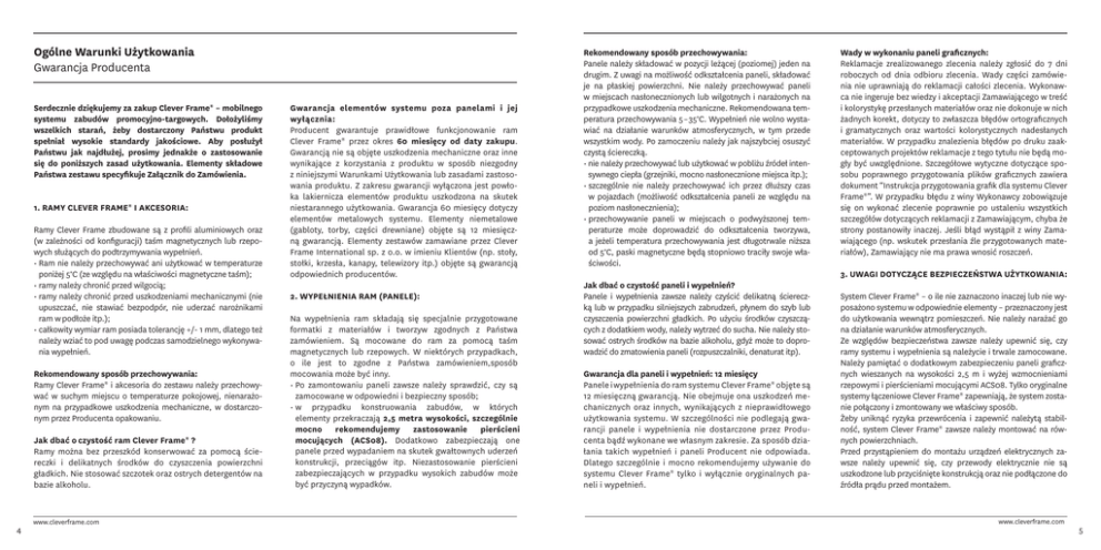 Ogólne Warunki Użytkowania Gwarancja Producenta Serdecznie dziękujemy za zakup Clever Frame® – mobilnego systemu zabudów promocyjno-targowych. Dołożyliśmy wszelkich starań, żeby dostarczony Państwu produkt spełniał wysokie standardy jakościowe. Aby posłużył Państwu jak najdłużej, prosimy jednakże o zastosowanie się do poniższych zasad użytkowania. Elementy składowe Państwa zestawu specyfikuje Załącznik do Zamówienia. 1. RAMY CLEVER FRAME® I AKCESORIA: Ramy Clever Frame zbudowane są z profili aluminiowych oraz (w zależności od konfiguracji) taśm magnetycznych lub rzepowych służących do podtrzymywania wypełnień. • Ram nie należy przechowywać ani użytkować w temperaturze poniżej 5°C (ze względu na właściwości magnetyczne taśm); • ramy należy chronić przed wilgocią; • ramy należy chronić przed uszkodzeniami mechanicznymi (nie upuszczać, nie stawiać bezpodpór, nie uderzać narożnikami ram w podłoże itp.); • całkowity wymiar ram posiada tolerancję +/- 1 mm, dlatego też należy wziać to pod uwagę podczas samodzielnego wykonywania wypełnień. Rekomendowany sposób przechowywania: Ramy Clever Frame® i akcesoria do zestawu należy przechowywać w suchym miejscu o temperaturze pokojowej, nienarażonym na przypadkowe uszkodzenia mechaniczne, w dostarczonym przez Producenta opakowaniu. Jak dbać o czystość ram Clever Frame® ? Ramy można bez przeszkód konserwować za pomocą ściereczki i delikatnych środków do czyszczenia powierzchni gładkich. Nie stosować szczotek oraz ostrych detergentów na bazie alkoholu. 4 www.cleverframe.com Gwarancja elementów systemu poza panelami i jej wyłącznia: Producent gwarantuje prawidłowe funkcjonowanie ram Clever Frame® przez okres 60 miesięcy od daty zakupu. Gwarancją nie są objęte uszkodzenia mechaniczne oraz inne wynikające z korzystania z produktu w sposób niezgodny z niniejszymi Warunkami Użytkowania lub zasadami zastosowania produktu. Z zakresu gwarancji wyłączona jest powłoka lakiernicza elementów produktu uszkodzona na skutek niestarannego użytkowania. Gwarancja 60 miesięcy dotyczy elementów metalowych systemu. Elementy niemetalowe (gabloty, torby, części drewniane) objęte są 12 miesięczną gwarancją. Elementy zestawów zamawiane przez Clever Frame International sp. z o.o. w imieniu Klientów (np. stoły, stołki, krzesła, kanapy, telewizory itp.) objęte są gwarancją odpowiednich producentów. 2. WYPEŁNIENIA RAM (PANELE): Na wypełnienia ram składają się specjalnie przygotowane formatki z materiałów i tworzyw zgodnych z Państwa zamówieniem. Są mocowane do ram za pomocą taśm magnetycznych lub rzepowych. W niektórych przypadkach, o ile jest to zgodne z Państwa zamówieniem,sposób mocowania może być inny. • Po zamontowaniu paneli zawsze należy sprawdzić, czy są zamocowane w odpowiedni i bezpieczny sposób; • w przypadku konstruowania zabudów, w których elementy przekraczają 2,5 metra wysokości, szczególnie mocno rekomendujemy zastosowanie pierścieni mocujących (ACS08). Dodatkowo zabezpieczają one panele przed wypadaniem na skutek gwałtownych uderzeń konstrukcji, przeciągów itp. Niezastosowanie pierścieni zabezpieczających w przypadku wysokich zabudów może być przyczyną wypadków. Rekomendowany sposób przechowywania: Panele należy składować w pozycji leżącej (poziomej) jeden na drugim. Z uwagi na możliwość odkształcenia paneli, składować je na płaskiej powierzchni. Nie należy przechowywać paneli w miejscach nasłonecznionych lub wilgotnych i narażonych na przypadkowe uszkodzenia mechaniczne. Rekomendowana temperatura przechowywania 5 – 35°C. Wypełnień nie wolno wystawiać na działanie warunków atmosferycznych, w tym przede wszystkim wody. Po zamoczeniu należy jak najszybciej osuszyć czystą ściereczką. • nie należy przechowywać lub użytkować w pobliżu źródeł intensywnego ciepła (grzejniki, mocno nasłonecznione miejsca itp.); • szczególnie nie należy przechowywać ich przez dłuższy czas w pojazdach (możliwość odkształcenia paneli ze względu na poziom nasłonecznienia); • przechowywanie paneli w miejscach o podwyższonej temperaturze może doprowadzić do odkształcenia tworzywa, a jeżeli temperatura przechowywania jest długotrwale niższa od 5°C, paski magnetyczne będą stopniowo traciły swoje właściwości. Jak dbać o czystość paneli i wypełnień? Panele i wypełnienia zawsze należy czyścić delikatną ściereczką lub w przypadku silniejszych zabrudzeń, płynem do szyb lub czyszczenia powierzchni gładkich. Po użyciu środków czyszczących z dodatkiem wody, należy wytrzeć do sucha. Nie należy stosować ostrych środków na bazie alkoholu, gdyż może to doprowadzić do zmatowienia paneli (rozpuszczalniki, denaturat itp). Gwarancja dla paneli i wypełnień: 12 miesięcy Panele i wypełnienia do ram systemu Clever Frame® objęte są 12 miesięczną gwarancją. Nie obejmuje ona uszkodzeń mechanicznych oraz innych, wynikających z nieprawidłowego użytkowania systemu. W szczególności nie podlegają gwarancji panele i wypełnienia nie dostarczone przez Producenta bądź wykonane we własnym zakresie. Za sposób działania takich wypełnień i paneli Producent nie odpowiada. Dlatego szczególnie i mocno rekomendujemy używanie do systemu Clever Frame® tylko i wyłącznie oryginalnych paneli i wypełnień. Wady w wykonaniu paneli graficznych: Reklamacje zrealizowanego zlecenia należy zgłosić do 7 dni roboczych od dnia odbioru zlecenia. Wady części zamówienia nie uprawniają do reklamacji całości zlecenia. Wykonawca nie ingeruje bez wiedzy i akceptacji Zamawiającego w treść i kolorystykę przesłanych materiałów oraz nie dokonuje w nich żadnych korekt, dotyczy to zwłaszcza błędów ortograficznych i gramatycznych oraz wartości kolorystycznych nadesłanych materiałów. W przypadku znalezienia błędów po druku zaakceptowanyc