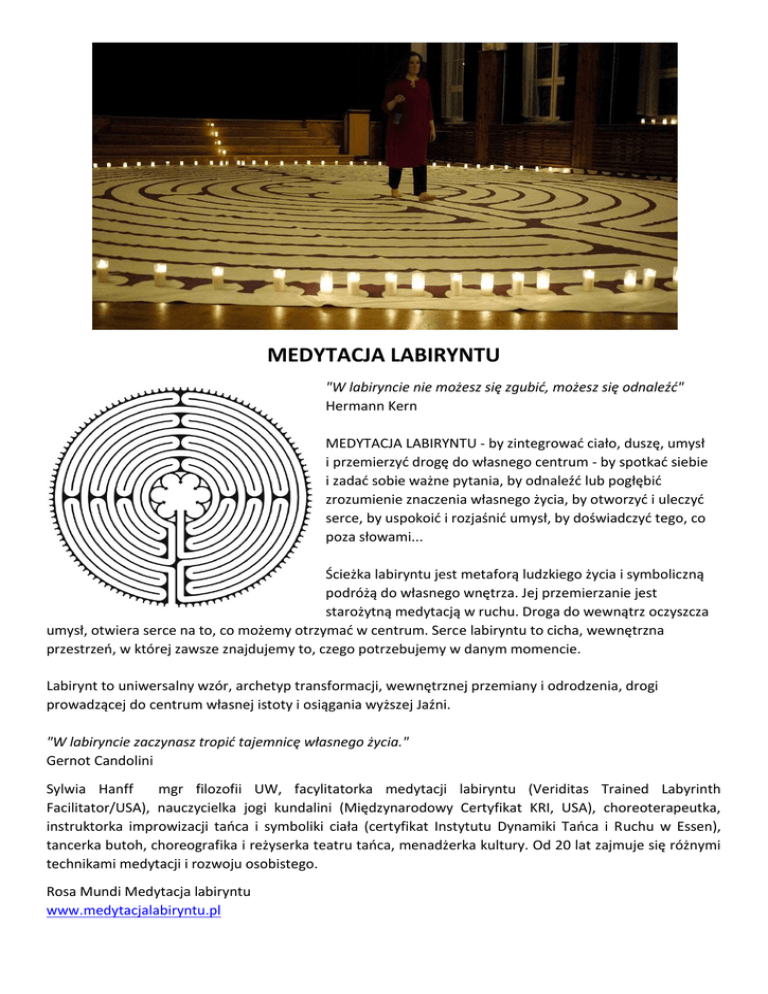 MEDYTACJA LABIRYNTU "W labiryncie nie możesz się zgubić, możesz się odnaleźć" Hermann Kern MEDYTACJA LABIRYNTU - by zintegrować ciało, duszę, umysł i przemierzyć drogę do własnego centrum - by spotkać siebie i zadać sobie ważne pytania, by odnaleźć lub pogłębić zrozumienie znaczenia własnego życia, by otworzyć i uleczyć serce, by uspokoić i rozjaśnić umysł, by doświadczyć tego, co poza słowami... Ścieżka labiryntu jest metaforą ludzkiego życia i symboliczną podróżą do własnego wnętrza. Jej przemierzanie jest starożytną medytacją w ruchu. Droga do wewnątrz oczyszcza umysł, otwiera serce na to, co możemy otrzymać w centrum. Serce labiryntu to cicha, wewnętrzna przestrzeń, w której zawsze znajdujemy to, czego potrzebujemy w danym momencie. Labirynt to uniwersalny wzór, archetyp transformacji, wewnętrznej przemiany i odrodzenia, drogi prowadzącej do centrum własnej istoty i osiągania wyższej Jaźni. "W labiryncie zaczynasz tropić tajemnicę własnego życia." Gernot Candolini Sylwia Hanff mgr filozofii UW, facylitatorka medytacji labiryntu (Veriditas Trained Labyrinth Facilitator/USA), nauczycielka jogi kundalini (Międzynarodowy Certyfikat KRI, USA), choreoterapeutka, instruktorka improwizacji tańca i symboliki ciała (certyfikat Instytutu Dynamiki Tańca i Ruchu w Essen), tancerka butoh, choreografika i reżyserka teatru tańca, menadżerka kultury. Od 20 lat zajmuje się różnymi technikami medytacji i rozwoju osobistego. Rosa Mundi Medytacja labiryntu www.medytacjalabiryntu.pl