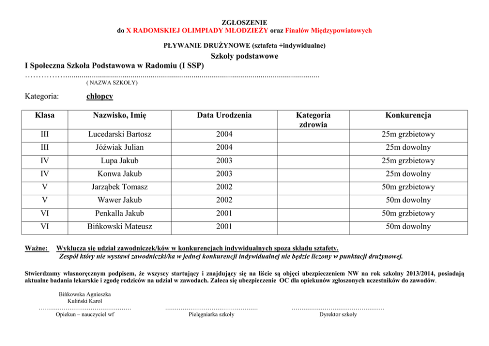 ZGŁOSZENIE do X RADOMSKIEJ OLIMPIADY MŁODZIEŻY oraz Finałów Międzypowiatowych PŁYWANIE DRUŻYNOWE (sztafeta +indywidualne) Szkoły podstawowe I Społeczna Szkoła Podstawowa w Radomiu (I SSP) ……………............................................................................................................................. ( NAZWA SZKOŁY) Kategoria: chłopcy Klasa Nazwisko, Imię Data Urodzenia III Lucedarski Bartosz 2004 25m grzbietowy III Jóźwiak Julian 2004 25m dowolny IV Lupa Jakub 2003 25m grzbietowy IV Konwa Jakub 2003 25m dowolny V Jarząbek Tomasz 2002 50m grzbietowy V Wawer Jakub 2002 50m dowolny VI Penkalla Jakub 2001 50m grzbietowy VI Bińkowski Mateusz 2001 50m dowolny Ważne: Kategoria zdrowia Konkurencja Wyklucza się udział zawodniczek/ków w konkurencjach indywidualnych spoza składu sztafety. Zespół który nie wystawi zawodniczki/ka w jednej konkurencji indywidualnej nie będzie liczony w punktacji drużynowej. Stwierdzamy własnoręcznym podpisem, że wszyscy startujący i znajdujący się na liście są objęci ubezpieczeniem NW na rok szkolny 2013/2014, posiadają aktualne badania lekarskie i zgodę rodziców na udział w zawodach. Zaleca się ubezpieczenie OC dla opiekunów zgłoszonych uczestników do zawodów. Bińkowska Agnieszka Kuliński Karol ………………………………………… Opiekun – nauczyciel wf ………………………………………… Pielęgniarka szkoły ………………………………………… Dyrektor szkoły ZGŁOSZENIE do X RADOMSKIEJ OLIMPIADY MŁODZIEŻY oraz Finałów Międzypowiatowych PŁYWANIE DRUŻYNOWE (sztafeta +indywidualne) Szkoły podstawowe I Społeczna Szkoła Podstawowa w Radomiu (I SSP) ……………............................................................................................................................. ( NAZWA SZKOŁY) Kategoria: dziewczęta Klasa Nazwisko, Imię Data Urodzenia III Okulska Magdalena 2004 25m grzbietowy III Kwiatkowska Aleksandra 2004 25m dowolny IV Bieńkowska Anna 2003 25m grzbietowy IV Frankowska Wiktoria 2003 25m dowolny V Dąbrowska Julia 2002 50m grzbietowy V Spólna Alicja 2002 50m dowolny VI Olszewska Natalia 2001 50m grzbietowy VI Świątek Julia 2001 50m dowolny Ważne: Kategoria zdrowia Konkurencja Wyklucza się udział zawodniczek/ków w konkurencjach indywidualnych spoza składu sztafety. Zespół który nie wystawi zawodniczki/ka w jednej konkurencji indywidualnej nie będzie liczony w punktacji drużynowej. Stwierdzamy własnoręcznym podpisem, że wszyscy startujący i znajdujący się na liście są objęci ubezpieczeniem NW na rok szkolny 2013/2014, posiadają aktualne badania lekarskie i zgodę rodziców na udział w zawodach. Zaleca się ubezpieczenie OC dla opiekunów zgłoszonych uczestników do zawodów. Bińkowska Agnieszka Kuliński Karol ………………………………………… Opiekun – nauczyciel wf ………………………………………… Pielęgniarka szkoły ………………………………………… Dyrektor szkoły