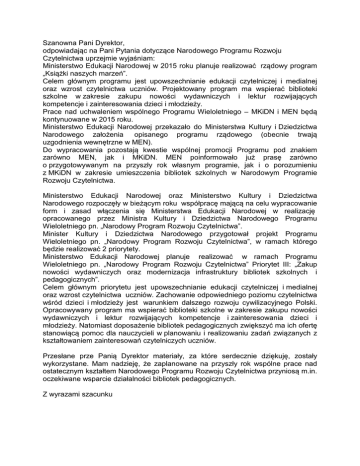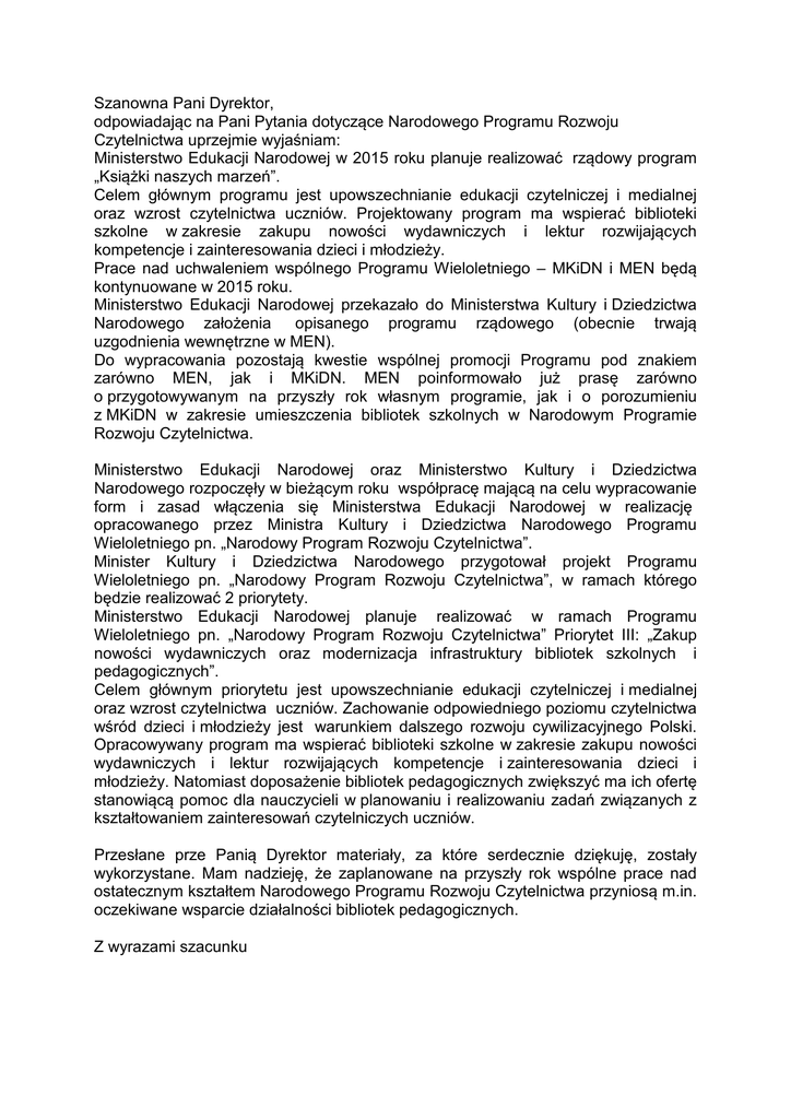 Szanowna Pani Dyrektor, odpowiadając na Pani Pytania dotyczące Narodowego Programu Rozwoju Czytelnictwa uprzejmie wyjaśniam: Ministerstwo Edukacji Narodowej w 2015 roku planuje realizować rządowy program „Książki naszych marzeń”. Celem głównym programu jest upowszechnianie edukacji czytelniczej i medialnej oraz wzrost czytelnictwa uczniów. Projektowany program ma wspierać biblioteki szkolne w zakresie zakupu nowości wydawniczych i lektur rozwijających kompetencje i zainteresowania dzieci i młodzieży. Prace nad uchwaleniem wspólnego Programu Wieloletniego – MKiDN i MEN będą kontynuowane w 2015 roku. Ministerstwo Edukacji Narodowej przekazało do Ministerstwa Kultury i Dziedzictwa Narodowego założenia opisanego programu rządowego (obecnie trwają uzgodnienia wewnętrzne w MEN). Do wypracowania pozostają kwestie wspólnej promocji Programu pod znakiem zarówno MEN, jak i MKiDN. MEN poinformowało już prasę zarówno o przygotowywanym na przyszły rok własnym programie, jak i o porozumieniu z MKiDN w zakresie umieszczenia bibliotek szkolnych w Narodowym Programie Rozwoju Czytelnictwa. Ministerstwo Edukacji Narodowej oraz Ministerstwo Kultury i Dziedzictwa Narodowego rozpoczęły w bieżącym roku współpracę mającą na celu wypracowanie form i zasad włączenia się Ministerstwa Edukacji Narodowej w realizację opracowanego przez Ministra Kultury i Dziedzictwa Narodowego Programu Wieloletniego pn. „Narodowy Program Rozwoju Czytelnictwa”. Minister Kultury i Dziedzictwa Narodowego przygotował projekt Programu Wieloletniego pn. „Narodowy Program Rozwoju Czytelnictwa”, w ramach którego będzie realizować 2 priorytety. Ministerstwo Edukacji Narodowej planuje realizować w ramach Programu Wieloletniego pn. „Narodowy Program Rozwoju Czytelnictwa” Priorytet III: „Zakup nowości wydawniczych oraz modernizacja infrastruktury bibliotek szkolnych i pedagogicznych”. Celem głównym priorytetu jest upowszechnianie edukacji czytelniczej i medialnej oraz wzrost czytelnictwa uczniów. Zachowanie odpowiedniego poziomu czytelnictwa wśród dzieci i młodzieży jest warunkiem dalszego rozwoju cywilizacyjnego Polski. Opracowywany program ma wspierać biblioteki szkolne w zakresie zakupu nowości wydawniczych i lektur rozwijających kompetencje i zainteresowania dzieci i młodzieży. Natomiast doposażenie bibliotek pedagogicznych zwiększyć ma ich ofertę stanowiącą pomoc dla nauczycieli w planowaniu i realizowaniu zadań związanych z kształtowaniem zainteresowań czytelniczych uczniów. Przesłane prze Panią Dyrektor materiały, za które serdecznie dziękuję, zostały wykorzystane. Mam nadzieję, że zaplanowane na przyszły rok wspólne prace nad ostatecznym kształtem Narodowego Programu Rozwoju Czytelnictwa przyniosą m.in. oczekiwane wsparcie działalności bibliotek pedagogicznych. Z wyrazami szacunku MARZENNA SZCZEPAŃSKA Główny Specjalista al. J.Ch. Szucha 25, 00-918 Warszawa tel. 22 34-74-650, fax 22 34 74 160 e-mail: [email protected] Marzenna Szczepańska, Chief expert Ministry of National Education, Quality of Education Department al. J. Ch. Szucha 25, 00-918 Warszawa tel. +48 22 34-74-650, fax +48 22 34 74 160