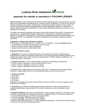 Ludowy Klub Jeździecki zaprasza do udziału w zawodach o PUCHAR LEWADY Puchar Lewady to cykl czterech jednodniowych zawodów ujeżdżeniowych, przeznaczonych dla osób, które nie są zawodnikami zarejestrowanymi w Polskim Związku Jeździeckim. W roku 2013 zawody te odbywać się będą po raz szósty i podobnie jak w poprzednich edycjach będzie to miało miejsce na wiosnę i jesienią. Rywalizacja przebiegać będzie w trzech kategoriach wiekowych, wyłącznie na koniach zapewnionych przez organizatora. O zwycięstwie decydowała będzie suma procent z trzech najlepszych przejazdów. W związku ze zmianami przepisów dotyczącymi organizacji zawodów towarzyskich i koniecznością zgłaszania ich w Wojewódzkim Związku Jeździeckim , przypominamy wszystkim zawodnikom i opiekunom zawodników niepełnoletnich o konieczności posiadania aktualnych badań lekarskich oraz ubezpieczenia NW, a w przypadku zawodników niepełnoletnich także zgody opiekuna na start w zawodach. Organizator: Ludowy Klub Jeździecki "Lewada", ul. Parkowa 23, 47-263 Zakrzów, tel. 77 4875417, fax. 77 4875364, e-mail: [email protected] Przewodniczący komitetu organizacyjnego Daniel Karpiński Dyrektor Pucharu Lewady Joanna Skowerska Sędzia Główny Pucharu Lewady Marek Ruda Regulamin Pucharu Lewady 1. Zawodnicy: w Pucharze Lewady mogą brać udział amatorzy i zawodnicy zarejestrowani w Wojewódzkich Związkach Jeździeckich. Zawodnicy muszą posiadać aktualne badania lekarskie oraz ubezpieczenie NW. Osoby, które są lub były zarejestrowane w Polskim Związku Jeździeckim, nie mogą brać udziału w zawodach. 2. Kategorie wiekowe: Puchar Lewady będzie rozgrywany w następujących kategoriach: Puchar Lewady w Ujeżdżeniu Juniorów Młodszych (do 13 lat) Puchar Lewady w Ujeżdżeniu Juniorów (do 18 lat) Puchar Lewady w Ujeżdżeniu Seniorów (od 19 lat) 3. Konie Zawodnicy będą startować na koniach losowanych, udostępnionych przez organizatora. Zawodnik w ciągu całego Pucharu nie może startować dwa razy na tym samym koniu. 4. Terminy zawodów: 20.04.2013 25.05.2013 08.09.2013 05.10.2013 Organizator zastrzega sobie prawo zmiany terminu, jednak nie później, niż na dwa tygodnie przed planowanymi zawodami. 5. Dokumenty: zawodników obowiązuje zaświadczenie lekarskie o braku przeciwwskazań do uprawiania jeździectwa, ubezpieczenie NW, juniorów młodszych i juniorów dodatkowo zgoda rodziców. 6. Zasady klasyfikacji: Zawodnicy są klasyfikowani w swoich grupach wiekowych. Za każdym razem, zawodnicy w poszczególnych kategoriach wiekowych, startować będą w tych samych programach: Juniorzy Młodsi klasa L-3, czworobok konkursowy 20x60m Juniorzy klasa P-2, czworobok konkursowy 20x60m Seniorzy klasa N-7, czworobok konkursowy 20x60m O zajętym miejscu decyduje suma % z trzech najlepszych przejazdów. Jeśli zawodnik startował mniej niż trzy razy, sumuje się wszystkie jego wyniki. Jeden zawodnik może startować w jednej edycji tylko w jednej kategorii wiekowej. Programy nie mogą być czytane. 7. Ubiór: Zgodnie z przepisami ujeżdżenia Polskiego Związku Jeździeckiego. Ostrogi nie są obowiązkowe, organizator dopuszcza używanie bata. 8. Czworobok: Konkursy rozgrywane będą na terenie otwartym, podłoże piaskowe, czworobok 20x60m 9. Zgłoszenia: wyłącznie na drukach organizatora (dostępnych na www.kjlewada.pl w zakładce Puchar Lewady) - "KARTA ZGŁOSZENIA", nie później niż do odpowiednio: 16.04.2013 21.05.2013 03.09.2013 01.10.2013 10. Opłaty: wpisowe: 80 zł za każdy start zawodnika noclegi LKJ "LEWADA" - pokoje wieloosobowe - cena 25 zł/ od osoby wyżywienie: śniadanie 15zł, obiad 25zł, kolacja 15zł Z uwagi na ograniczoną ilość miejsc noclegowych na terenie LKJ "LEWADA" o zakwaterowaniu na terenie klubu decyduje biuro zawodów. Opłaty pobierane będą po przyjeździe nie później niż na godzinę przed rozpoczęciem zawodów. 11. Odprawa techniczna zawsze w przeddzień zawodów o godz.20.00 w siedzibie LKJ "LEWADA" 12. Nagrody - organizator zapewnia flot's dla zwycięzców poszczególnych konkursów. Pula nagród w całym Pucharze Lewady będzie uzależniona od ilości startujących zawodników. 13. Organizator nie odpowiada za wypadki i kradzieże podczas zawodów KODEKS POSTĘPOWANIA Z KONIEM Polski Związek Jeździecki prosi wszystkie osoby zaangażowane w jakikolwiek sposób w sporty konne, o przestrzeganie poniżej przedstawionego kodeksu oraz zasady, że dobro konia jest najważniejsze. Dobro konia musi być zawsze i wszędzie uwzględniane w sportach konnych i nie może być podporządkowane współzawodnictwu sportowemu ani innym celom np. komercyjnym. I. Na wszystkich etapach treningu i przygotowań konia do startu w zawodach, dobro konia musi stać ponad wszelkimi innymi wymaganiami. Dotyczy to stałej opieki, metod treningu, starannego obrządku, kucia i transportu. II. Konie i jeźdźcy muszą być wytrenowani, kompetentni i zdrowi zanim wezmą udział w zawodach. Odnosi się to także do podawania leków i środków medycznych, zabiegów chirurgicznych zagrażających dobru konia lub ciąży klaczy, oraz do przypadków nadużywania pomocy. III. Zawody nie mogą zagrażać dobru konia. Wymaga to zwrócenia szczególnej uwagi na teren zawodów, powierzchnię podłoża, pogodę, warunki stajenne, kondycję koni i ich bezpieczeństwo także podczas podróży powrotnej z zawodów. IV. Należy dołożyć wszelkich starań, aby zapewnić koniom staranną opiekę po zakończeniu zawodów, a także humanitarne traktowanie po zakończeniu kariery sportowej. Dotyczy to właściwej opieki weterynaryjnej obrażeń odniesionych na zawodach, spokojnej starości, ewentualnie eutanazji. V. PZJ zachęca wszystkie osoby działające w sporcie jeździeckim do stałego podnoszenia swojej wiedzy oraz umiejętności dotyczących wszelkich aspektów współpracy z koniem.
