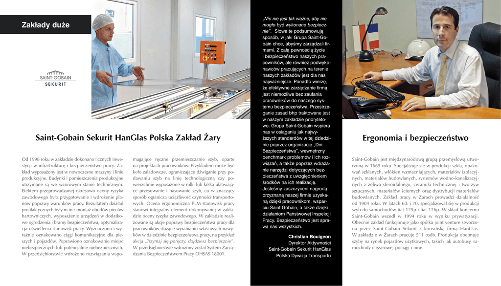 Zakłady duże Saint-Gobain Sekurit HanGlas Polska Zakład Żary Od 1998 roku w zakładzie dokonano licznych inwestycji w infrastrukturę i bezpieczeństwo pracy. Zakład wyposażony jest w nowoczesne maszyny i linie produkcyjne. Budynki i pomieszczenia produkcyjne utrzymane są we wzorowym stanie technicznym. Efektem przeprowadzanej okresowo oceny ryzyka zawodowego było przygotowanie i wdrożenie planów poprawy warunków pracy. Rezultatem działań profilaktycznych były m.in.: montaż obudów pieców hartowniczych, wyposażenie urządzeń w dodatkowe ogrodzenia i bramy bezpieczeństwa, optymalizacja oświetlenia stanowisk pracy. Wyznaczono i wyraźnie oznakowano ciągi komunikacyjne dla pieszych i pojazdów. Poprawiono oznakowanie miejsc niebezpiecznych lub potencjalnie niebezpiecznych. W przedsiębiorstwie wdrożono rozwiązania wspo- magające ręczne przemieszczanie szyb, oparte na projektach pracowników. Przykładem może być koło załadowcze, ograniczające dźwiganie przy podawaniu szyb na linię technologiczną czy powierzchnie wyposażone w rolki lub kółka ułatwiające przesuwanie i nasuwanie szyb, co w znaczący sposób ogranicza uciążliwość czynności transportowych. Ocena ergonomiczna PLM stanowisk pracy stanowi integralny element dokonywanej w zakładzie oceny ryzyka zawodowego. W zakładzie realizowane są akcje poprawy bezpieczeństwa pracy dla pracowników służące wyrabianiu właściwych nawyków w dziedzinie bezpieczeństwa pracy, na przykład akcja „Trzymaj się poręczy, dojdziesz bezpiecznie”. W przedsiębiorstwie wdrożony został System Zarządzania Bezpieczeństwem Pracy OHSAS 18001. „Nic nie jest tak ważne, aby nie mogło być wykonane bezpiecznie”. Słowa te podsumowują sposób, w jaki Grupa Saint-Gobain chce, abyśmy zarządzali firmami. Z całą pewnością życie i bezpieczeństwo naszych pracowników, ale również podwykonawców pracujących na terenie naszych zakładów jest dla nas najważniejsze. Ponadto wierzę, że efektywne zarządzanie firmą jest niemożliwe bez zaufania pracowników do naszego systemu bezpieczeństwa. Przestrzeganie zasad bhp traktowane jest w naszym zakładzie priorytetowo. Grupa Saint-Gobain wspiera nas w osiąganiu jak najwyższych standardów w tej dziedzinie poprzez organizację „Dni Bezpieczeństwa”, wewnętrzny benchmark problemów i ich rozwiązań, a także poprzez wdrażanie narzędzi dotyczących bezpieczeństwa z uwzględnieniem środków na ich realizację. Jesteśmy zaszczyceni nagrodą przyznaną naszej firmie uzyskaną dzięki pracownikom, wsparciu Saint-Gobain, a także dzięki działaniom Państwowej Inspekcji Pracy. Bezpieczeństwo jest sprawą nas wszystkich. Christian Bouigeon Dyrektor Aktywności Saint-Gobain Sekurit HanGlas Polska Dywizja Transportu Ergonomia i bezpieczeństwo Saint-Gobain jest międzynarodową grupą przemysłową utworzoną w 1665 roku. Specjalizuje się w produkcji szkła, opakowań szklanych, włókien wzmacniających, materiałów izolacyjnych, materiałów budowlanych, systemów wodno-kanalizacyjnych z żeliwa sferoidalnego, ceramiki technicznej i tworzyw sztucznych, materiałów ściernych oraz dystrybucji materiałów budowlanych. Zakład pracy w Żarach prowadzi działalność od 1904 roku. W latach 60. i 70. specjalizował się w produkcji szyb do samochodów fiat 125p i fiat 126p. W skład koncernu Saint-Gobain wszedł w 1994 roku w wyniku prywatyzacji. Obecnie zakład funkcjonuje jako spółka joint venture stworzona przez Saint-Gobain Sekurit z koreańską firmą HanGlas. W zakładzie w Żarach pracuje 511 osób. Produkcja obejmuje szyby na rynek pojazdów użytkowych, takich jak autobusy, samochody ciężarowe, pociągi i inne.
