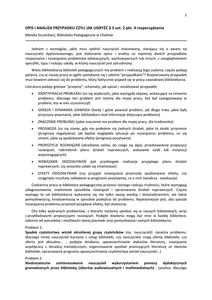 1 OPIS I ANALIZA PRZYPADKU CZYLI JAK UGRYŹĆ § 5 ust. 2 pkt. 4 rozporządzenia Monika Szczerbacz, Biblioteka Pedagogiczna w Chełmie Jednym z wymogów, jakie musi spełnić nauczyciel mianowany, starający się o awans na nauczyciela dyplomowanego, jest dokonanie opisu i analizy co najmniej dwóch przypadków rozpoznania i rozwiązania problemów edukacyjnych, wychowawczych lub innych, z uwzględnieniem specyfiki, typu i rodzaju szkoły, w której nauczyciel jest zatrudniony. Wielu bibliotekarzy bibliotek pedagogicznych ma problem z realizacją tego zadania; często padają pytania, czy w naszej pracy w ogóle spotykamy się z jakimiś "przypadkami"? Rozpatrywany przypadek musi bowiem odnosić się do problemu, który faktycznie pojawił się w pracy zawodowej bibliotekarza. Literatura podaje gotowe "przepisy", schematy, jak opisać i zanalizować przypadek: • IDENTYFIKACJA PROBLEMU (co się wydarzyło, jakie wystąpiły objawy, wskazujące na istnienie problemu, dlaczego ten problem jest istotny dla mojej pracy, kto był zaangażowany w problem, kto w nim uczestniczył) • GENEZA I DYNAMIKA ZJAWISKA (kiedy i gdzie powstał problem, jak długo trwa, jakie były przyczyny powstania, jakie bibliotekarz miał informacje dotyczące problemu) • ZNACZENIE PROBLEMU (jakie znaczenie ma problem dla mojej pracy, dla środowiska) • PROGNOZA (co się stanie, gdy nie podejmie się żadnych działań, jakie to skutki przyniesie (prognoza negatywna); jak będzie wyglądała sytuacja po rozwiązaniu problemu, co się zmieni, jakie są spodziewane efekty (prognoza pozytywna) • PROPOZYCJE ROZWIPZAP (określenie celów, do czego się dąży; przedstawienie propozycji rozwiązań, nakreślenie planu działań naprawczych, wskazanie osób lub instytucji wspomagających) • WDRAŻANIE ODDZIAŁYWAP (jak przebiegała naprawczych, czy wszystko udało się zrealizować) • EFEKTY ODDZIAŁYWAP (czy przyjęte rozwiązania przyniosły spodziewane efekty, czy osiągnięto rezultaty zakładane w prognozie pozytywnej, co o nich świadczy - ewaluacja) realizacja przyjętego planu działań Codzienna praca w bibliotece pedagogicznej przynosi różnego rodzaju trudności, które wymagają zdiagnozowania, znalezienia sposobów rozwiązań i opracowania działań naprawczych. Często wymaga to od bibliotekarza wykazania się nie tylko swoją wiedzą i doświadczeniem, ale także pomysłowością, kreatywnością w sposobie podejścia do problemu. Najważniejsze jest, aby sposób rozwiązania problemu przyniósł pożądane efekty, był skuteczny. Oto kilka wybranych problemów, z którymi możemy spotkać się w naszych bibliotekach, wraz z przykładowymi propozycjami rozwiązań. Podjęte działania mogą być inne w każdej bibliotece, zależnie od warunków i możliwości danej placówki oraz pomysłowości samych bibliotekarzy: Problem 1: Spadek czytelnictwa wśród określonej grupy czytelników (np. nauczycieli) -(analiza problemu: dlaczego mniej nauczycieli korzysta z usług biblioteki, czy nauczyciele znają ofertę biblioteki, czy oferta jest aktualna... ; podjęte działania: upowszechnianie wykazów literatury, nawiązanie współpracy z doradcą metodycznym, organizowanie spotkań promujących literaturę ze zbiorów biblioteki, opracowanie programu upowszechniania czytelnictwa wśród nauczycieli...) Problem 2: Niedostateczne zainteresowanie nauczycieli wykorzystaniem pomocy dydaktycznych gromadzonych przez bibliotekę (zbiorów audiowizualnych i multimedialnych) - (analiza: dlaczego 2 tak się dzieje? Czy nauczyciele znają ofertę biblioteczną, czy wiedzą, jakie pomoce dydaktyczne zalecane przez MENiS do użytku szkolnego znajdują się w jej zbiorach. Działania podjęte przez bibliotekarza: prezentacje zbiorów w szkołach i placówkach, organizowanie pokazowych zajęć i spotkań metodycznych z wykorzystaniem multimedialnych pomocy dydaktycznych...) Problem 3: Spadek liczby gromadzonych zbiorów (brak dostatecznych funduszy na zakup nowości do zbiorów bibliotecznych) - (analiza: z czego wynikają mniejsze zakupy nowości wydawniczych; propozycje rozwiązań: nawiązanie kontaktów z wydawnictwami i hurtowniami, wynegocjowanie korzystnych dla biblioteki rabatów cenowych; pozyskanie książek z darów instytucji i osób prywatnych; współpraca z bibliotekami w kraju - wymiana dubletów; szukanie dodatkowych funduszy na zakup nowości kiermasze, loterie; pozyskiwanie sponsorów...) Problem P: Brak dostatecznych umiejętności w posługiwaniu się nowoczesnym warsztatem informacyjnym (katalogi automatyczne, komputerowe bazy danych) przez użytkowników biblioteki (analiza: czy użytkownicy potrafią posługiwać się komputerem oraz udostępnionym w bibliotece oprogramowaniem? czy odczuwają lęk przed kontaktem z komputerem? Podjęte działania: opracowanie programu szkoleń dla użytkowników; przeprowadzanie szkoleń zbiorowych, indywidualnych; opracowanie i upowszechnianie materiałów informacyjno-edukacyjnych; bieżące udzielanie instruktażu, pomoc w korzystaniu z katalogu komputerowego ...) Problem 5: Organizowanie dzieciom i młodzieży czasu wolnego podczas ferii szkolnych (podjęte działania: zorganizowanie zajęć i warsztatów plastycznych, teatralnych, muzycznych, konkursów czytelniczych, głośnego czytania bajek dla najmłodszych, gier i zabaw; projekcje filmów wideo; zajęcia z komputerem i Internetem; wystawy prac; współpraca z innymi placówkami - domem kultury, muzeum ...) Problem 6: Wspomaganie nauczycieli (szkół podstawowych, gimnazjów, szkół ponadgimnazjalnych) w realizacji edukacji czytelniczej i medialnej (propozycje rozwiązań: zapoznanie się z treściami edukacji czytelniczej i medialnej na wszystkich etapach edukacji; wybranie tematów możliwych do realizacji w warunkach biblioteki, z wykorzystaniem posiadanych pomocy dydaktycznych; opracowanie programu zajęć dla poszczególnych etapów edukacyjnych; przeprowadzanie zajęć dla dzieci i młodzieży