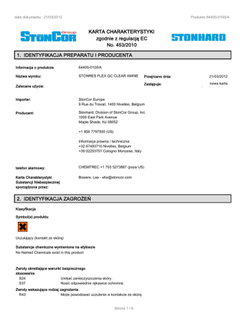 data dokumentu: 21/03/2012 Produkto 64400-0100/A KARTA CHARAKTERYSTYKI zgodnie z regulacją EC No. 453/2010 1. IDENTYFIKACJA PREPARATU I PRODUCENTA Informacja o produkcie 64400-0100/A Nazwa wyrobu: STONRES FLEX GC CLEAR AMINE Przejrzano dnia: Zastępuje: Zalecane użycie: Importer: StonCor Europe 9 Rue du Travail, 1400 Nivelles, Belgium Producent: Stonhard, Division of StonCor Group, Inc. 1000 East Park Avenue Maple Shade, NJ 08052 +1 856 7797500 (US) Informacja prawna / techniczna: +32 67493710 Nivelles, Belgium +39 02253751 Cologno Monzese, Italy telefon alarmowy: CHEMTREC +1 703 5273887 (poza US) Karta Charakterystyki Substancji Niebezpiecznej sporządzona przez: Bowers, Lee - [email protected] 2. IDENTYFIKACJA ZAGROŻEŃ Klasyfikacja Symbol(e) produktu Uczulający (kontakt ze skórą) Substancje chemiczne wymienione na etykiecie No Named Chemicals exist in this product Zwroty określające warunki bezpiecznego stosowania S24 Unikać zanieczyszczenia skóry. S37 Nosić odpowiednie rękawice ochronne. Zwroty wskazujące rodzaj zagrożenia R43 Może powodować uczulenie w kontakcie ze skórą Strona 1 / 6 21/03/2012 nowa karta bezpieczeństwa data dokumentu: 21/03/2012 Produkto 64400-0100/A 3. SKŁAD/INFORMACJA O SKŁADNIKACH Składniki niebezpieczne Nazwa Zgodnie z EEC 623-91-6 Nr WE (EINEC) 210-819-7 Nr CAS Nr rej REACH Symbole CLP Określenia zagrożeń CLP Współczynniki M GHS07, GHS08 H302-371 0 Nr CAS 2.5-10 623-91-6 Informacje dodatkowe: % Symbol(e) produktu Xn Zwroty określające warunki bezpiecznego stosowania R22-43 Pełny tekst zwrotów R i określeń zagrożeń CLP podanych powyżej (jeśli podano) znajduje się w sekcji 16 4. PIERWSZA POMOC Zalecenia ogólne: Dziala szkodliwie po polknieciu. Dziala drazniaco na skóre. Moze powodowac uczulenie w nastepstwie narazenia droga oddechowa. Moze powodowac uczulenie w kontakcie ze skóra. Wdychanie: Przeniesc na swieze powietrze. Zasiegnac porady lekarza po istotnym narazeniu. Skóra: Jezeli to mozliwe zastosowac lagodne mydlo. Zmyc natychmiast duza iloscia wody z mydlem po zdjeciu zanieczyszczonej odziezy i obuwia. Oczy: Jesli podraznienie oczu utrzymuje sie, skonsultowac sie ze specjalista. Natychmiast plukac duza iloscia wody, takze pod powiekami przynajmniej przez 15 minut. Usunac szkla (szklo) kontaktowe. Połknięcie: Delikatnie wytrzec lub wyplukac usta woda. NIE prowokowac wymiotów. Nieprzytomnej osobie nigdy nie podawac nic doustnie. 5. POSTĘPOWANIE W PRZYPADKU POŻARU Środki gaśnicze: dwutlenek węgla, Suche proszki gaśnicze, Piana NIE używać ze względów bezpieczeństwa: Alkohol, roztwory alkoholowe, wszystkie inne nośniki nie wymienione powyżej. Niebezpieczne produkty spalania: brak informacji Specjalny gaśniczy sprzęt ochronny: W razie pozaru, zalozyc aparat oddechowy z zamknietym obiegiem powietrza. Stosowac zraszanie woda, piany alkoholoodporne, suche chemikalia lub dwutlenek wegla. 6. POSTĘPOWANIE W PRZYPADKU NIEZAMIERZONEGO UWOLNIENIA DO ŚRODOWISKA Środki ochrony osobistej/Środki ochrony środowiska/Metody oczyszczania/usuwania: Nie dopuscic aby material skazil wody gruntowe. Nie dopuscic do przedostania sie produktu do kanalizacji. Zapewnic wystarczajaca wentylacje. Uzyc srodków ochrony osobistej. Zapobiegac dalszemu wyciekowi lub rozlaniu jezeli to bezpieczne. Ograniczyc wyciek, zebrac z niepalnym materialem absorbujacym, (np. piaskiem, ziemia, ziemia okrzemkowa, wermikulitem) i przeniesc do pojemnka celem usuniecia zgodnie z lokalnymi/krajowymi przepisami (patrz w sekcji 13). Dalsze instrukcje: Należy zapoznać się z wymogami UE lub krajowymi dotyczącymi usuwania tego materiału. 7. POSTĘPOWANIE Z SUBSTANCJĄ/PREPARATEM I JEJ/JEGO MAGAZYNOWANIE postępowanie z preparatem: Stosowac wylacznie w pomieszczeniach z odpowiednia wentylacja wywiewna. Stosowac srodki ochrony osobistej. Warunki, których należy unikać: brak informacji Warunki magazynowania: Przechowywac w oryginalnym opakowaniu. Przechowywac pod zamknieciem w miejscu dostepnym jedynie dla osób uprawnionych lub upowaznionych. Przechowywac w temperaturze 5 - 25 °C w suchym, dobrze przewietrzanym pomieszczeniu z dala od zródel ciepla, zaplonu i bezposredniego swiatla slonecznego. Strona 2 / 6 data dokumentu: 21/03/2012 Produkto 64400-0100/A 8. KONTROLA NARAŻENIA I ŚRODKI OCHRONY INDYWIDUALNEJ Składniki szkodliwe dla zdrowia w środowisku pracy (PO) NDSCh NDSCh dopuszczalne wartość % dopuszczaln e stężenie (najwyższe (najwyższe stężenie graniczna długotermino dopuszczaln dopuszczalne długoterminow dla we ppm e stężenie stężenie e mg/m3 ekspozycji chwilowe) chwilowe) mg/ zawodowej ppm m3 2.5-10 Nazwa NDS (Najwyższe Dopuszczaln e Stężenie) Dodatkowe zalecenia: Zapoznać się z ustawowymi limitami narażenia w miejscu pracy obowiązującymi w każdym kraju. Niektóre składniki mogły nie zostać sklasyfikowane na poziomie UE w przepisach dotyczących substancji niebezpiecznych oraz preparatów. Opublikowane przez "Firmę" limity narażenia zostały wymienione wyłącznie w celach informacyjnych, na podstawie wartości progowych ACGIH (TLV) lub Amerykańskich Dopuszczalnych limitów narażenia OSHA (PEL). Ochrona osobista Ochrona dróg oddechowych: W warunkach normalnych nie jest wymagany osobisty sprzet do oddychania. Ochrona rąk: Rekawice kauczukowe lub plastikowe Uwzglednic informacje podana przez producenta i dotyczaca czasów przepuszczania i przebicia, i specyficzne warunki w miejscu pracy (obciazenie mechaniczne, czas trwania kontaktu). ubranie z dlugimi polami Zdjac i uprac skazona odziez przed ponownym uzyciem. Fartuch z gumy lub tworzywa sztucznego inne wyposażenie ochronne: brak informacji Ochrona oczu: Zapewnic oczomyjki i prysznice w poblizu miejsca pracy. Okulary ochronne Środki ochrony i higieny: Myc rece przed posilkami i po zakonczeniu pracy. W czasie pracy nie jesc, nie pic i nie palic. 9. WŁAŚCIWOŚCI FIZYCZNE I CHEMICZNE Postać: Zapach: Clear / Yellow resin LAGODNY Stan fizyczny Plynny Dan