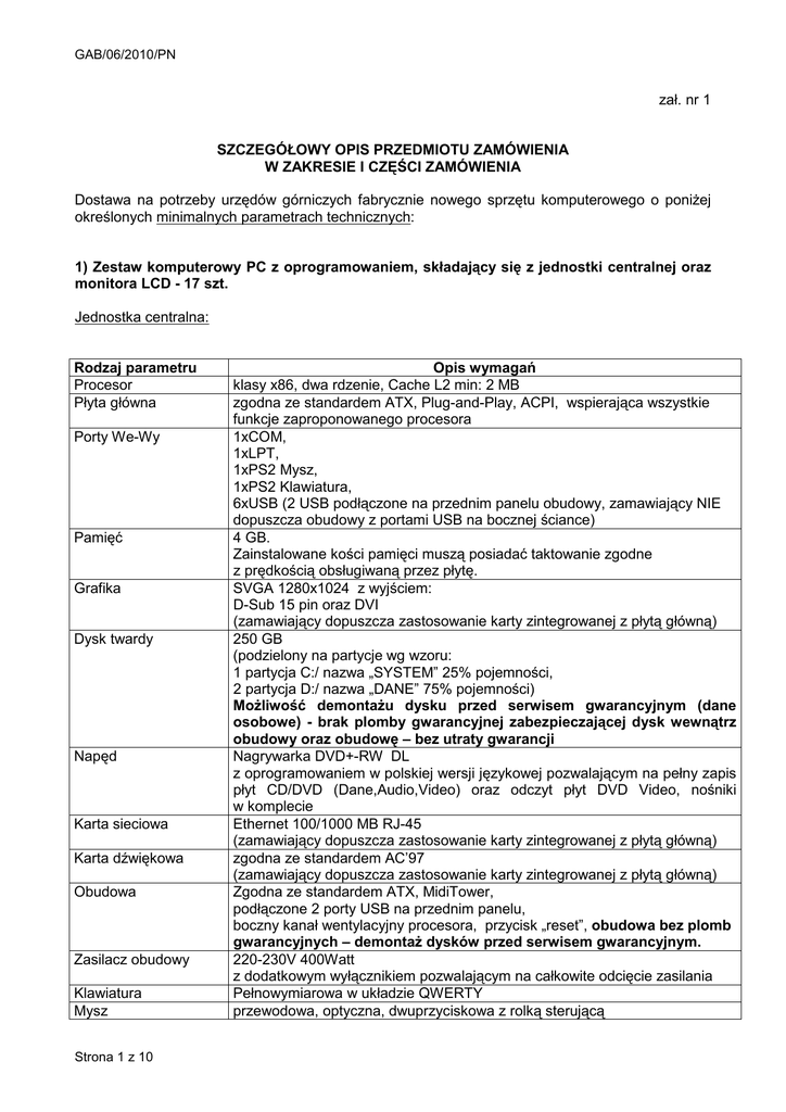 GAB/06/2010/PN zał. nr 1 SZCZEGÓŁOWY OPIS PRZEDMIOTU ZAMÓWIENIA W ZAKRESIE I CZĘŚCI ZAMÓWIENIA Dostawa na potrzeby urzędów górniczych fabrycznie nowego sprzętu komputerowego o poniŜej określonych minimalnych parametrach technicznych: 1) Zestaw komputerowy PC z oprogramowaniem, składający się z jednostki centralnej oraz monitora LCD - 17 szt. Jednostka centralna: Rodzaj parametru Procesor Płyta główna Porty We-Wy Pamięć Grafika Dysk twardy Napęd Karta sieciowa Karta dźwiękowa Obudowa Zasilacz obudowy Klawiatura Mysz Strona 1 z 10 Opis wymagań klasy x86, dwa rdzenie, Cache L2 min: 2 MB zgodna ze standardem ATX, Plug-and-Play, ACPI, wspierająca wszystkie funkcje zaproponowanego procesora 1xCOM, 1xLPT, 1xPS2 Mysz, 1xPS2 Klawiatura, 6xUSB (2 USB podłączone na przednim panelu obudowy, zamawiający NIE dopuszcza obudowy z portami USB na bocznej ściance) 4 GB. Zainstalowane kości pamięci muszą posiadać taktowanie zgodne z prędkością obsługiwaną przez płytę. SVGA 1280x1024 z wyjściem: D-Sub 15 pin oraz DVI (zamawiający dopuszcza zastosowanie karty zintegrowanej z płytą główną) 250 GB (podzielony na partycje wg wzoru: 1 partycja C:/ nazwa „SYSTEM” 25% pojemności, 2 partycja D:/ nazwa „DANE” 75% pojemności) MoŜliwość demontaŜu dysku przed serwisem gwarancyjnym (dane osobowe) - brak plomby gwarancyjnej zabezpieczającej dysk wewnątrz obudowy oraz obudowę – bez utraty gwarancji Nagrywarka DVD+-RW DL z oprogramowaniem w polskiej wersji językowej pozwalającym na pełny zapis płyt CD/DVD (Dane,Audio,Video) oraz odczyt płyt DVD Video, nośniki w komplecie Ethernet 100/1000 MB RJ-45 (zamawiający dopuszcza zastosowanie karty zintegrowanej z płytą główną) zgodna ze standardem AC’97 (zamawiający dopuszcza zastosowanie karty zintegrowanej z płytą główną) Zgodna ze standardem ATX, MidiTower, podłączone 2 porty USB na przednim panelu, boczny kanał wentylacyjny procesora, przycisk „reset”, obudowa bez plomb gwarancyjnych – demontaŜ dysków przed serwisem gwarancyjnym. 220-230V 400Watt z dodatkowym wyłącznikiem pozwalającym na całkowite odcięcie zasilania Pełnowymiarowa w układzie QWERTY przewodowa, optyczna, dwuprzyciskowa z rolką sterującą GAB/06/2010/PN System operacyjny Oprogramowanie biurowe Gwarancja Normy Normy eco WyposaŜenie dodatkowe Ze względu na ujednolicenie stosowanego oprogramowania i zmniejszenie kosztów administracji zestaw musi być wyposaŜony w system Windows 7 Professional PL, zainstalowany na 1 partycji dysku, naklejka z numerem seryjnym klejona na bocznej ściance obudowy komputera (zamawiający NIE dopuszcza naklejki na górze obudowy), nośnik w komplecie. KaŜda jednostka centralna musi posiadać zainstalowany i aktywowany system z własnym numerem seryjnym, zgodnym z naklejką na obudowie, oraz załoŜonym kontem uŜytkownika na prawach administratora o nazwie: Admin, bez hasła. System musi być zainstalowany, aktywowany i zaktualizowany najnowszymi poprawkami dostępnymi na dzień podpisania umowy. Ze względu na ujednolicenie stosowanego oprogramowania i zmniejszenie kosztów administracji zestaw musi być wyposaŜony w pakiet biurowy Office 2007 Professional PL. Pakiet biurowy zainstalowany na 1 partycji dysku, aktywowany i zaktualizowany poprawkami, wydanymi do dnia zawarcia umowy na dostawę sprzętu, nośnik w komplecie. Miejsce przechowywania dokumentów zmienione na katalog: D:\MojeDokumenty. Pakiety biurowe muszą być zainstalowane i aktywowane na własne indywidualne numery seryjne, zgodne z dołączonym do zestawu nośnikiem. 36 miesięcy Głośność jednostki centralnej mierzona zgodnie z normą ISO 9296 poniŜej 30db, nie dotyczy hałasu emitowanego przez CD/DVD oraz stację dyskietek. EnergyStar 4.0 Listwa zasilająca z zabezpieczeniem przepięciowym, 5 gniazd zasilających, długość: 5 metrów Monitor LCD: Rodzaj parametru Rodzaj monitora Przekątna ekranu Matryca Plamka Rozdzielczość Jasność Kontrast Czas reakcji plamki Kąty widzenia poz./pion Złącza WyposaŜenie Głośniki Gwarancja Normy Strona 2 z 10 Opis wymagań LCD 17’’ format 5:4 aktywna, TFT <0,3 1280x1024 250 cd/m2 500:1 8 ms 140/130 stopni D-Sub 15pin + DVI + Audio Kable połączeniowe D-Sub 15 pin, DVI, oraz Audio w komplecie Stereo, wbudowane w monitor 36 miesięcy TCO-03, EnergyStar 4.0 GAB/06/2010/PN 2) Zestaw komputerowy PC z oprogramowaniem, składający się z jednostki centralnej, monitora LCD oraz drukarki laserowej do wydruków czarno – białych, z wbudowanym modułem do wydruku dwustronnego oraz modułem do wydruku sieciowego - 16 szt. Jednostka centralna: Rodzaj parametru Procesor Płyta główna Porty We-Wy Pamięć Grafika Dysk twardy Napęd Karta sieciowa Karta dźwiękowa Obudowa Zasilacz obudowy Klawiatura Mysz System operacyjny Strona 3 z 10 Opis wymagań klasy x86, dwa rdzenie, Cache L2 min: 2 MB zgodna ze standardem ATX, Plug-and-Play, ACPI, wspierająca wszystkie funkcje zaproponowanego procesora 1xCOM, 1xLPT, 1xPS2 Mysz, 1xPS2 Klawiatura, 6xUSB (2 USB podłączone na przednim panelu obudowy, zamawiający NIE dopuszcza obudowy z portami USB na bocznej ściance) 4 GB. Zainstalowane kości pamięci muszą posiadać taktowanie zgodne z prędkością obsługiwaną przez płytę. SVGA 1280x1024 z wyjściem: D-Sub 15 pin oraz DVI (zamawiający dopuszcza zastosowanie karty zintegrowanej z płytą główną) 250 GB (podzielony na partycje wg. wzoru: 1 partycja C:/ nazwa „SYSTEM” 25% pojemności, 2 partycja D:/ nazwa „DANE” 75% pojemności) MoŜliwość demontaŜu dysku przed serwisem gwarancyjnym (dane osobowe) - brak plomby gwarancyjnej zabezpieczającej dysk wewnątrz obudowy oraz obudowę – bez utraty gwarancji Nagrywarka DVD+-RW DL z oprogramowaniem w polskiej wersji językowej pozwalającym na pełny zapis płyt CD/DVD (Dane,Audio,Video) oraz odczyt płyt DVD Video, nośniki w komplecie Ethernet 100/1000 MB RJ-45 (zamawiający dopuszcza zastosowanie karty zinteg