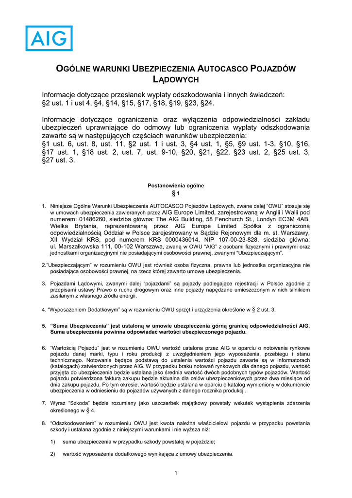 OGÓLNE WARUNKI UBEZPIECZENIA AUTOCASCO POJAZDÓW LĄDOWYCH Informacje dotyczące przesłanek wypłaty odszkodowania i innych świadczeń: §2 ust. 1 i ust 4, §4, §14, §15, §17, §18, §19, §23, §24. Informacje dotyczące ograniczenia oraz wyłączenia odpowiedzialności zakładu ubezpieczeń uprawniające do odmowy lub ograniczenia wypłaty odszkodowania zawarte są w następujących częściach warunków ubezpieczenia: §1 ust. 6, ust. 8, ust. 11, §2 ust. 1 i ust. 3, §4 ust. 1, §5, §9 ust. 1-3, §10, §16, §17 ust. 1, §18 ust. 2, ust. 7, ust. 9-10, §20, §21, §22, §23 ust. 2, §25 ust. 3, §27 ust. 3. Postanowienia ogólne §1 1. Niniejsze Ogólne Warunki Ubezpieczenia AUTOCASCO Pojazdów Lądowych, zwane dalej “OWU” stosuje się w umowach ubezpieczenia zawieranych przez AIG Europe Limited, zarejestrowaną w Anglii i Walii pod numerem: 01486260, siedziba główna: The AIG Building, 58 Fenchurch St., Londyn EC3M 4AB, Wielka Brytania, reprezentowaną przez AIG Europe Limited Spółka z ograniczoną odpowiedzialnością Oddział w Polsce zarejestrowany w Sądzie Rejonowym dla m. st. Warszawy, XII Wydział KRS, pod numerem KRS 0000436014, NIP 107-00-23-828, siedziba główna: ul. Marszałkowska 111, 00-102 Warszawa, zwaną w OWU “AIG” z osobami fizycznymi i prawnymi oraz jednostkami organizacyjnymi nie posiadającymi osobowości prawnej, zwanymi “Ubezpieczającym”. 2.”Ubezpieczającym” w rozumieniu OWU jest również osoba fizyczna, prawna lub jednostka organizacyjna nie posiadająca osobowości prawnej, na rzecz której zawarto umowę ubezpieczenia. 3. Pojazdami Lądowymi, zwanymi dalej “pojazdami” są pojazdy podlegające rejestracji w Polsce zgodnie z przepisami ustawy Prawo o ruchu drogowym oraz inne pojazdy napędzane umieszczonym w nich silnikiem zasilanym z własnego źródła energii. 4. “Wyposażeniem Dodatkowym” są w rozumieniu OWU sprzęt i urządzenia określone w § 2 ust. 3. 5. “Suma Ubezpieczenia” jest ustaloną w umowie ubezpieczenia górną granicą odpowiedzialności AIG. Suma ubezpieczenia powinna odpowiadać wartości ubezpieczonego pojazdu. 6. “Wartością Pojazdu” jest w rozumieniu OWU wartość ustalona przez AIG w oparciu o notowania rynkowe pojazdu danej marki, typu i roku produkcji z uwzględnieniem jego wyposażenia, przebiegu i stanu technicznego. Notowania będące podstawą do ustalenia wartości pojazdu zawarte są w informatorach (katalogach) zatwierdzonych przez AIG. W przypadku braku notowań rynkowych dla danego pojazdu, wartość przyjęta do ubezpieczenia będzie ustalana jako średnia wartość dwóch podobnych typów pojazdów. Wartość pojazdu potwierdzona fakturą zakupu będzie aktualna dla celów ubezpieczeniowych przez dwa miesiące od dnia zakupu pojazdu. Po tym okresie, wartość będzie ustalana w oparciu o katalog wymieniony w dokumencie ubezpieczenia w odniesieniu do pojazdów używanych z danego rocznika produkcji. 7. Wyraz “Szkoda” będzie rozumiany jako uszczerbek majątkowy powstały wskutek wystąpienia zdarzenia określonego w § 4. 8. “Odszkodowaniem” w rozumieniu OWU jest kwota należna właścicielowi pojazdu w przypadku powstania szkody i ustalana zgodnie z niniejszymi warunkami i nie wyższa niż: 1) suma ubezpieczenia w przypadku szkody powstałej w pojeździe; 2) wartość wyposażenia dodatkowego wynikająca z umowy ubezpieczenia. 1 9. “Pojazdem Nielegalnie Wprowadzonym na Polski Obszar Celny” jest w rozumieniu OWU pojazd: 1) nie dostarczony do miejsca odprawy celnej lub nie zgłoszony do takiej odprawy; 2) wprowadzony na polski obszar celny w wyniku podania w zgłoszeniu celnym lub innym dokumencie danych niezgodnych z rzeczywistością lub z naruszeniem ograniczeń w obrocie. 10. Zwrot “Wyjaśnienie Okoliczności Niezbędnych do Ustalenia Odpowiedzialności”, będzie rozumiany jako uzyskanie przez AIG prawomocnego postanowienia kończącego postępowanie w sprawie dotyczącej szkody lub zakończenia innego postępowania prowadzonego przez lub na zlecenie AIG w celu wyjaśnienia okoliczności związanych ze szkodą (np. przebiegiem wypadku, kradzieżą, pochodzeniem pojazdu). 11. Kradzieżą w rozumieniu OWU jest nie tylko kradzież zwykła, lecz także kradzież zuchwała, z włamaniem, albo rozbój. Ubezpieczenie nie obejmuje natomiast przywłaszczenia pojazdu lub jego utraty w wyniku wejścia sprawcy w posiadanie klucza służącego do otwarcia i uruchomienia pojazdu za zgodą lub wskutek rażącego niedbalstwa Ubezpieczającego lub innej osoby upoważnionej do użytkowania tego pojazdu. Nazw powyższych przestępstw używa się zgodnie ze znaczeniem jakie posiadają na gruncie prawa karnego. 12. “Miejscem Strzeżonym” w rozumieniu OWU jest: 1) miejsce pozostające pod stałym nadzorem osób zajmujących się profesjonalnie ochroną mienia; 2) teren ogrodzony, zamknięty, dozorowany w godzinach nocnych; 3) garaż zamknięty na co najmniej jeden zamek wielozastawkowy. 13. Zwrot “Przedłużenie Umowy Ubezpieczenia” będzie rozumiany jako zawarcie kolejnej umowy ubezpieczenia na ten sam pojazd i przez tego samego właściciela przed wygaśnięciem umowy poprzedniej. 14. Zwrot “Wznowienie Umowy Ubezpieczenia” będzie rozumiany jako zawarcie ponownie umowy na ten sam pojazd i przez tego samego właściciela po wygaśnięciu umowy poprzedniej. Przedmiot Ubezpieczenia §2 1. Na podstawie niniejszych OWU, AIG ubezpiecza pojazdy wraz z ich wyposażeniem. Ubezpieczeniu podlegają wyłącznie pojazdy będące własnością Ubezpieczającego. 2. Wyposażeniem pojazdu, o którym mowa w ust. 1, jest sprzęt i urządzenia służące do utrzymania i używania pojazdu zgodnie z jego przeznaczeniem, a także służące bezpieczeństwu jazdy oraz zabezpieczeniu pojazdu przed kradzieżą. 3. Do wyposażenia, o którym mowa w ust. 1 i 2 nie zalicza się wyposażenia dodatkowego. Wyposażenie dodatkowe stanowią: 1) wszelki sprzęt i urządzenia nie będące seryjnym wy