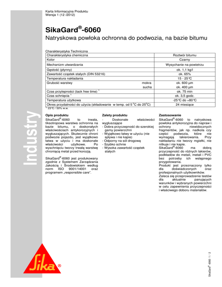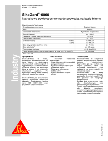 Karta Informacyjna Produktu Wersja 1 (12 /2012) SikaGard®-6060 Natryskowa powłoka ochronna do podwozia, na bazie bitumu Charakterystyka Techniczna Charakterystyka chemiczna Kolor Roztwór bitumu Czarny Mechanizm utwardzania Wysychanie na powietrzu Gęstość (płynny) Zawartość cząstek stałych (DIN 53216) Temperatura nakładania Grubość warstwy mokra sucha 1 Czas przylepności (tack free time) 1 Czas schnięcia Temperatura użytkowa o o Okres przydatności do użycia (składowanie w temp. od 5 C do 25 C) 23°C / 50% w.w. Opis produktu ® to trwała, SikaGard -6060 tiksotropowa warstwa ochronna na bazie bitumu, o doskonałych właściwościach antykorozyjnych i wygłuszających. Skutecznie chroni podwozie pojazdu, jest wyjątkowo łatwa w użyciu i ma doskonałe właściwości użytkowe. Po wyschnięciu tworzy trwałą warstwę chroniącą metal przed korozją. ® SikaGard -6060 jest produkowany zgodnie z Systemem Zarządzania Jakością i Środowiskiem według norm ISO 9001/14001 oraz programem „responsible care”. Zalety produktu Doskonałe właściwości wygłuszające - Dobra przyczepność do szerokiej gamy powierzchni - Wyjątkowo łatwy w użyciu (nie spływa i nie kapie) - Odporny na sól drogową - Szybko schnie - Wysoka zawartość cząstek stałych Zastosowanie ® SikaGard -6060 to natryskowa powłoka antykorozyjna do napraw i ochrony niewidocznych fragmentów, jak np. nadkola czy części podwozia, które nie wymagają lakierowania. Przy nakładaniu nie tworzy mgiełki, nie nitkuje i nie kapie. ® SikaGard -6060 ma dobrą przyczepność do różnych lakierów, podkładów do metali, metali i PVC bez potrzeby ich wstępnego przygotowania. Produkt jest przeznaczony tylko dla doświadczonych oraz profesjonalnych użytkowników. Zaleca się przeprowadzenie testów dla aktualnie panujących warunków i wybranych powierzchni w celu zapewnienia przyczepności i właściwego doboru materiałów. SikaGard® -6060 1 / 2 1) ok. 1,1 kg/l ok. 65% 15 - 25°C ok. 600 µm ok. 400 µm ok. 75 min ok. 3,5 godz. -25°C do +80°C 24 miesiące Odporność chemiczna ® SikaGard -6060 jest odporny na wodę słodką, morską, rozpyloną sól, zasady i kwasy. Powyższe informacje są wytycznymi ogólnymi, szczegółowe zalecenia dostępne są na życzenie. Sposób nakładania Przygotowanie powierzchni Powierzchnie muszą być czyste, suche oraz wolne od kurzu, rdzy i tłuszczu. Czysty metal musi być odpowiednio przygotowany dla wzmocnienia ochrony przed korozją (np. stal niepowlekana, itp.) Nakładanie ® SikaGard -6060 nakłada się lekkim sprzętem do natrysku bezpowietrznego o ciśnieniu ® roboczym 3 – 6 barów np.: Sika ® SCP Gun oraz Sika UBC Gun. Przed użyciem wstrząsnąć ok. 40 razy. Osłonić elementy sąsiadujące z polem przeznaczonym do natrysku. Rozpylać w temperaturze pokojowej, z odległości ok. 25 cm, zachowując krzyżowy układ warstw. Nanosić ciągłą warstwę materiału. ® SikaGard -6060 nie spływa i nie kapie przy nakładaniu. Gdy wymagana jest grubsza powłoka, poszczególne warstwy muszą całkowicie wyschnąć przed kolejnym natryskiem. Zmieniając technikę natrysku można uzyskać różne struktury nawierzchni. Nie natryskiwać na elementy silnika oraz układu wydechowego i hamulcowego. Malowanie ® SikaGard -6060 nie nadaje się do malowania. Dodatkowe informacje Na życzenie dostępne są następujące publikacje: - Karta Charakterystyki Substancji Niebezpiecznej Opakowanie ® SikaGard -6060 puszka puszka beczka 1l 10 l 60 l Ważne Wszelkie podane dane techniczne bazują na próbach i testach laboratoryjnych. W praktyce wyniki pomiarów mogą nie być identyczne w związku z okolicznościami, na które producent nie ma wpływu. Zdrowie i bezpieczeństwo Informacje i zalecenia dotyczące bezpiecznego przetwarzania, składowania i likwidacji środków chemicznych, zawarte są w aktualnej Karcie Charakterystyki Substancji Niebezpiecznej. Karta ta zawiera także informacje o własnościach fizycznych materiału, oraz pozostałe dane ekologiczne, toksykologiczne i ogólnego przeznaczenia. Uwagi prawne Informacje, a w szczególności zalecenia dotyczące działania i końcowego zastosowania produktów Sika są podane w dobrej wierze, przy uwzględnieniu aktualnego stanu wiedzy i doświadczenia Sika i odnoszą się do produktów składowanych, przechowywanych i używanych zgodnie z zaleceniami podanymi przez Sika. Z uwagi na występujące w praktyce zróżnicowanie materiałów, substancji, warunków i sposobu ich używania i umiejscowienia, pozostające całkowicie poza zakresem wpływu Sika, właściwości produktów podane w informacjach, pisemnych zaleceniach i innych wskazówkach udzielonych przez Sika nie mogą być podstawą do przyjęcia odpowiedzialności Sika w przypadku używania produktów niezgodnie z zaleceniami podanymi przez Sika. Użytkownik produktu jest obowiązany do używania produktu zgodnie z jego przeznaczeniem i zaleceniami podanymi przez firmę Sika. Prawa własności osób trzecich muszą być przestrzegane. Wszelkie zamówienia są realizowane zgodnie z aktualnie obowiązującymi Ogólnymi Warunkami Sprzedaży Sika, dostępnymi na stronie internetowej www.sika.pl, które stanowią integralną część wszystkich umów zawieranych przez Sika. Użytkownicy są obowiązani przestrzegać wymagań zawartych w aktualnej Karcie Informacyjnej użytkowanego produktu. Kopię aktualnej Karty Informacyjnej Produktu Sika dostarcza Użytkownikowi na jego żądanie. Czyszczenie ® Świeżą warstwę SikaGard -6060 usuwa się z narzędzi i sprzętu przy ® pomocy preparatu Sika Remover208 lub innego odpowiedniego środka. Po wyschnięciu, ® SikaGard -6060 można usunąć wyłącznie mechanicznie. Ręce i odsłoniętą skórę należy natychmiast oczyścić ręcznikami ® Sika Handclean lub odpowiednimi przemysłowymi środkami czystości do rąk i wodą. Nie używać rozpuszczalników! Centrala Industry Biuro Kraków Łowińskiego 40 PL 31-752 