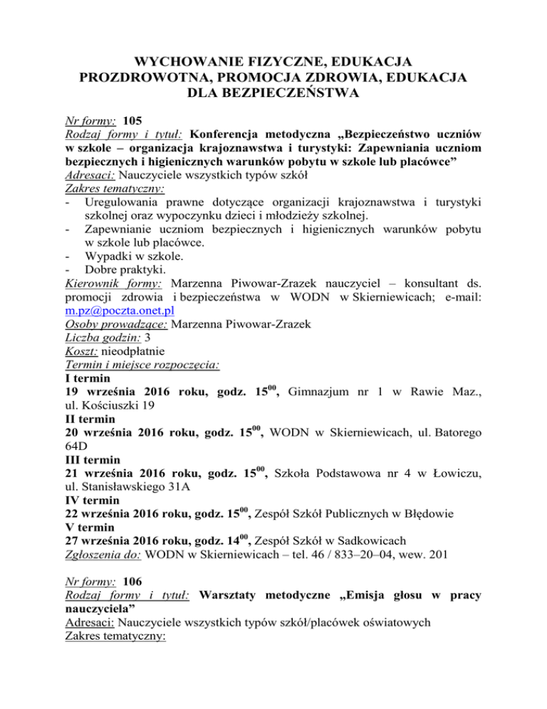 WYCHOWANIE FIZYCZNE, EDUKACJA PROZDROWOTNA, PROMOCJA ZDROWIA, EDUKACJA DLA BEZPIECZEŃSTWA Nr formy: 105 Rodzaj formy i tytuł: Konferencja metodyczna „Bezpieczeństwo uczniów w szkole – organizacja krajoznawstwa i turystyki: Zapewniania uczniom bezpiecznych i higienicznych warunków pobytu w szkole lub placówce” Adresaci: Nauczyciele wszystkich typów szkół Zakres tematyczny: - Uregulowania prawne dotyczące organizacji krajoznawstwa i turystyki szkolnej oraz wypoczynku dzieci i młodzieży szkolnej. - Zapewnianie uczniom bezpiecznych i higienicznych warunków pobytu w szkole lub placówce. - Wypadki w szkole. - Dobre praktyki. Kierownik formy: Marzenna Piwowar-Zrazek nauczyciel – konsultant ds. promocji zdrowia i bezpieczeństwa w WODN w Skierniewicach; e-mail: [email protected] Osoby prowadzące: Marzenna Piwowar-Zrazek Liczba godzin: 3 Koszt: nieodpłatnie Termin i miejsce rozpoczęcia: I termin 19 września 2016 roku, godz. 1500, Gimnazjum nr 1 w Rawie Maz., ul. Kościuszki 19 II termin 20 września 2016 roku, godz. 1500, WODN w Skierniewicach, ul. Batorego 64D III termin 21 września 2016 roku, godz. 1500, Szkoła Podstawowa nr 4 w Łowiczu, ul. Stanisławskiego 31A IV termin 22 września 2016 roku, godz. 1500, Zespół Szkół Publicznych w Błędowie V termin 27 września 2016 roku, godz. 1400, Zespół Szkół w Sadkowicach Zgłoszenia do: WODN w Skierniewicach – tel. 46 / 833–20–04, wew. 201 Nr formy: 106 Rodzaj formy i tytuł: Warsztaty metodyczne „Emisja głosu w pracy nauczyciela” Adresaci: Nauczyciele wszystkich typów szkół/placówek oświatowych Zakres tematyczny: Budowa i funkcjonowanie narządu głosu. Czynniki sprzyjające powstawaniu zaburzeń głosu. Ćwiczenia praktyczne z zakresu: prawidłowego oddychania i prawidłowej fonacji. - Ćwiczenia artykulacji (ćwiczenia dykcyjne). - Patologie aparatu głosowego. - Niezbędne zasady higieny głosu. Kierownik formy: Marzenna Piwowar-Zrazek nauczyciel – konsultant ds. promocji zdrowia i bezpieczeństwa w WODN w Skierniewicach; e-mail: [email protected] Osoby prowadzące: Alina Marzena Wesołowska – terapeuta, Powiatowa Poradnia Psychologiczno-Pedagogiczna w Skierniewicach Liczba godzin: 5 Koszt: 30 zł Termin i miejsce rozpoczęcia: 3 października 2016 roku, godz. 1500, WODN w Skierniewicach, ul. Batorego 64D Zgłoszenia do: WODN w Skierniewicach – tel. 46 / 833–20–04 wew. 201 Uwaga: na zajęcia proszę ze sobą zabrać: karimatę, lusterko, wygodny strój sportowy. - Nr formy: 107 Rodzaj formy i tytuł: Seminarium „Program Szkoła Promująca Zdrowie” Adresaci: Nauczyciele wszystkich typów szkół Zakres tematyczny: - Geneza Programu. - Cechy odróżniające szkołę promującą zdrowie od szkoły podejmującej działania (aktywnej) na rzecz zdrowia. - Współpraca z rodzicami. - Działania szkoły promującej zdrowie wynikające ze współpracy ze środowiskiem lokalnym. - Dobre praktyki. Kierownik formy: Marzenna Piwowar-Zrazek nauczyciel – konsultant ds. promocji zdrowia i bezpieczeństwa w WODN w Skierniewicach; e-mail: [email protected] Osoby prowadzące: Marzenna Piwowar-Zrazek Liczba godzin: 10 Koszt: nieodpłatnie Termin i miejsce rozpoczęcia: 4, 10 października 2016 roku, godz. 1400, Biblioteka Pedagogiczna w Skierniewicach Filia w Łowiczu, ul. Ułańska 2 Możliwa organizacja szkolenia w Rawie Maz., Białej Rawskiej, Skierniewicach. Zgłoszenia do: WODN w Skierniewicach – tel. 46 / 833–20–04 wew. 201 2 INFORMATOR FORM KSZTAŁCENIA USTAWICZNEGO WODN w Skierniewicach: IX 2016 r. - VIII 2017 r. Nr formy: 108 Rodzaj formy i tytuł: Seminarium „Planowanie w Szkole Promującej Zdrowie” Adresaci: Nauczyciele wszystkich typów szkół/placówek oświatowych Zakres tematyczny: - Diagnoza w planowaniu edukacji zdrowotnej. - Jak dobrze przygotować diagnozę? - Budowanie programu promocji zdrowia. - Ewaluacja edukacji zdrowotnej w szkole. Kierownik formy: Marzenna Piwowar-Zrazek nauczyciel – konsultant ds. promocji zdrowia i bezpieczeństwa w WODN w Skierniewicach; e-mail: [email protected] Osoby prowadzące: Marzenna Piwowar-Zrazek Liczba godzin: 30 Koszt: nieodpłatnie Termin i miejsce rozpoczęcia: 12 października 2016 roku, godz. 1400, Biblioteka Pedagogiczna w Skierniewicach Filia w Łowiczu, ul. Ułańska 2 Zgłoszenia do: WODN w Skierniewicach – tel. 46 / 833–20–04 wew. 201 Uwaga: Obowiązkowy udział dwóch przedstawicieli szkół/placówek oświatowych posiadających Certyfikaty Szkoła Promująca Zdrowie oraz przygotowujących się do uzyskania Akcesu Regionalnego Nr formy: 109 Rodzaj formy i tytuł: Seminarium „Zaprezentuj swoje działania z PowerPoint” Adresaci: Nauczyciele przedszkoli i szkół promujących zdrowie oraz inni zainteresowani tematyką szkolenia Zakres tematyczny: - Zasady tworzenia prezentacji multimedialnych. - Budowanie prezentacji ilustrującej działania przedszkola/szkoły w PowerPoint z wykorzystaniem: grafiki, obiektów SmartArt i wykresów. - Modyfikowanie grafiki w celu zastosowania jej w prezentacji. - Pokaz przygotowanych materiałów – przykłady dobrych praktyk nauczycielskich. Kierownik formy: Jolanta Hysz nauczyciel – konsultant ds. informatyki i edukacji początkowej WODN w Skierniewicach Osoby prowadzące: Jolanta Hysz Liczba godzin: 20 Koszt: nieodpłatnie Termin i miejsce rozpoczęcia: 28 listopada i 8 grudnia 2016 roku, godz. 1500, WODN w Skierniewicach, ul. Batorego 64D Zgłoszenia do: WODN w Skierniewicach – tel. 46 / 833–20–04 wew. 201 3 INFORMATOR FORM KSZTAŁCENIA USTAWICZNEGO WODN w Skierniewicach: IX 2016 r. - VIII 2017 r. Nr formy: 110 Rodzaj formy i tytuł: Seminarium „Autoewaluacja w Szkole Promującej Zdrowie” Adresaci: Nauczyciele wszystkich typów szkół promujących zdrowie Zakres tematyczny: - Zmiany w Szkole Promującej Zdrowie. Nowe standardy i narzędzia do autoewaluacji działań. Propozycja kodowania wyników ankiet. - Oczekiwane efekty działań. - Cele i przedmiot autoewalu