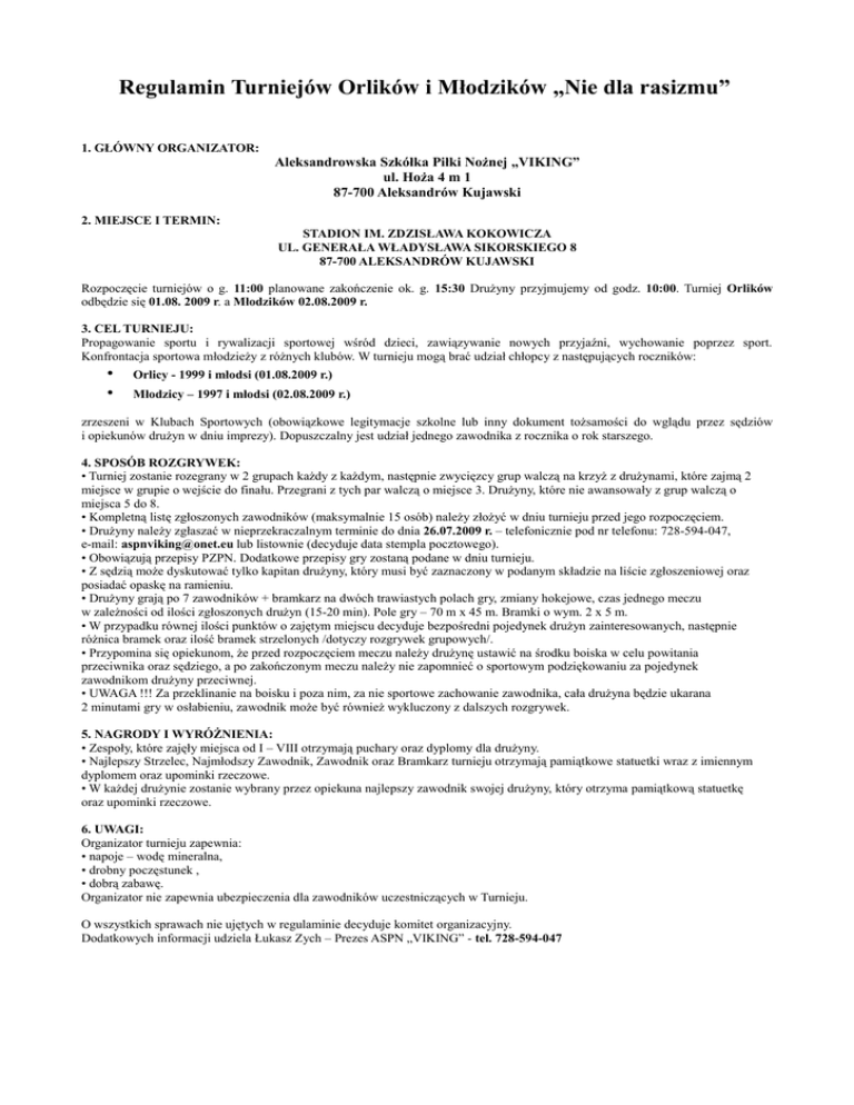 Regulamin Turniejów Orlików i Młodzików „Nie dla rasizmu” 1. GŁÓWNY ORGANIZATOR: Aleksandrowska Szkółka Piłki Nożnej „VIKING” ul. Hoża 4 m 1 87-700 Aleksandrów Kujawski 2. MIEJSCE I TERMIN: STADION IM. ZDZISŁAWA KOKOWICZA UL. GENERAŁA WŁADYSŁAWA SIKORSKIEGO 8 87-700 ALEKSANDRÓW KUJAWSKI Rozpoczęcie turniejów o g. 11:00 planowane zakończenie ok. g. 15:30 Drużyny przyjmujemy od godz. 10:00. Turniej Orlików odbędzie się 01.08. 2009 r. a Młodzików 02.08.2009 r. 3. CEL TURNIEJU: Propagowanie sportu i rywalizacji sportowej wśród dzieci, zawiązywanie nowych przyjaźni, wychowanie poprzez sport. Konfrontacja sportowa młodzieży z różnych klubów. W turnieju mogą brać udział chłopcy z następujących roczników: • • Orlicy - 1999 i młodsi (01.08.2009 r.) Młodzicy – 1997 i młodsi (02.08.2009 r.) zrzeszeni w Klubach Sportowych (obowiązkowe legitymacje szkolne lub inny dokument tożsamości do wglądu przez sędziów i opiekunów drużyn w dniu imprezy). Dopuszczalny jest udział jednego zawodnika z rocznika o rok starszego. 4. SPOSÓB ROZGRYWEK: • Turniej zostanie rozegrany w 2 grupach każdy z każdym, następnie zwycięzcy grup walczą na krzyż z drużynami, które zajmą 2 miejsce w grupie o wejście do finału. Przegrani z tych par walczą o miejsce 3. Drużyny, które nie awansowały z grup walczą o miejsca 5 do 8. • Kompletną listę zgłoszonych zawodników (maksymalnie 15 osób) należy złożyć w dniu turnieju przed jego rozpoczęciem. • Drużyny należy zgłaszać w nieprzekraczalnym terminie do dnia 26.07.2009 r. – telefonicznie pod nr telefonu: 728-594-047, e-mail: [email protected] lub listownie (decyduje data stempla pocztowego). • Obowiązują przepisy PZPN. Dodatkowe przepisy gry zostaną podane w dniu turnieju. • Z sędzią może dyskutować tylko kapitan drużyny, który musi być zaznaczony w podanym składzie na liście zgłoszeniowej oraz posiadać opaskę na ramieniu. • Drużyny grają po 7 zawodników + bramkarz na dwóch trawiastych polach gry, zmiany hokejowe, czas jednego meczu w zależności od ilości zgłoszonych drużyn (15-20 min). Pole gry – 70 m x 45 m. Bramki o wym. 2 x 5 m. • W przypadku równej ilości punktów o zajętym miejscu decyduje bezpośredni pojedynek drużyn zainteresowanych, następnie różnica bramek oraz ilość bramek strzelonych /dotyczy rozgrywek grupowych/. • Przypomina się opiekunom, że przed rozpoczęciem meczu należy drużynę ustawić na środku boiska w celu powitania przeciwnika oraz sędziego, a po zakończonym meczu należy nie zapomnieć o sportowym podziękowaniu za pojedynek zawodnikom drużyny przeciwnej. • UWAGA !!! Za przeklinanie na boisku i poza nim, za nie sportowe zachowanie zawodnika, cała drużyna będzie ukarana 2 minutami gry w osłabieniu, zawodnik może być również wykluczony z dalszych rozgrywek. 5. NAGRODY I WYRÓŻNIENIA: • Zespoły, które zajęły miejsca od I – VIII otrzymają puchary oraz dyplomy dla drużyny. • Najlepszy Strzelec, Najmłodszy Zawodnik, Zawodnik oraz Bramkarz turnieju otrzymają pamiątkowe statuetki wraz z imiennym dyplomem oraz upominki rzeczowe. • W każdej drużynie zostanie wybrany przez opiekuna najlepszy zawodnik swojej drużyny, który otrzyma pamiątkową statuetkę oraz upominki rzeczowe. 6. UWAGI: Organizator turnieju zapewnia: • napoje – wodę mineralna, • drobny poczęstunek , • dobrą zabawę. Organizator nie zapewnia ubezpieczenia dla zawodników uczestniczących w Turnieju. O wszystkich sprawach nie ujętych w regulaminie decyduje komitet organizacyjny. Dodatkowych informacji udziela Łukasz Zych – Prezes ASPN „VIKING” - tel. 728-594-047