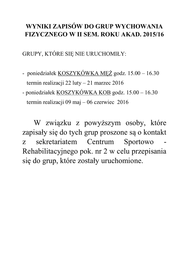 WYNIKI ZAPISÓW DO GRUP WYCHOWANIA FIZYCZNEGO W II SEM. ROKU AKAD. 2015/16 GRUPY, KTÓRE SIĘ NIE URUCHOMIŁY: - poniedziałek KOSZYKÓWKA MĘŻ godz. 15.00 – 16.30 termin realizacji 22 luty – 21 marzec 2016 - poniedziałek KOSZYKÓWKA KOB godz. 15.00 – 16.30 termin realizacji 09 maj – 06 czerwiec 2016 W związku z powyższym osoby, które zapisały się do tych grup proszone są o kontakt z sekretariatem Centrum Sportowo Rehabilitacyjnego pok. nr 2 w celu przepisania się do grup, które zostały uruchomione.