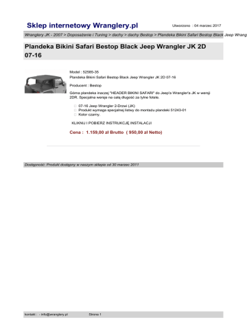 Sklep internetowy Wranglery.pl Utworzono : 04 marzec 2017 Wranglery JK - 2007 > Doposażenie i Tuning > dachy > dachy Bestop > Plandeka Bikini Safari Bestop Black Jeep Wrang Plandeka Bikini Safari Bestop Black Jeep Wrangler JK 2D 07-16 Model : 52585-35 Plandeka Bikini Safari Bestop Black Jeep Wrangler JK 2D 07-16 Producent : Bestop Górna plandeka inaczej "HEADER BIKINI SAFARI" do Jeep'a Wrangler'a JK w wersji 2DR. Specjalna wersje na całą długość za tylne fotele. � 07-16 Jeep Wrangler 2-Drzwi (JK) � Produkt wymaga specjalnej listwy do montażu plandeki 51243-01 � Kolor czarny. KLIKNIJ I POBIERZ INSTRUKCJĘ INSTALACJI Cena : 1.159,00 zł Brutto ( 950,00 zł Netto) Dostępność: Produkt dostępny w naszym sklepie od 30 marzec 2011 kontakt : - [email protected] Strona 1